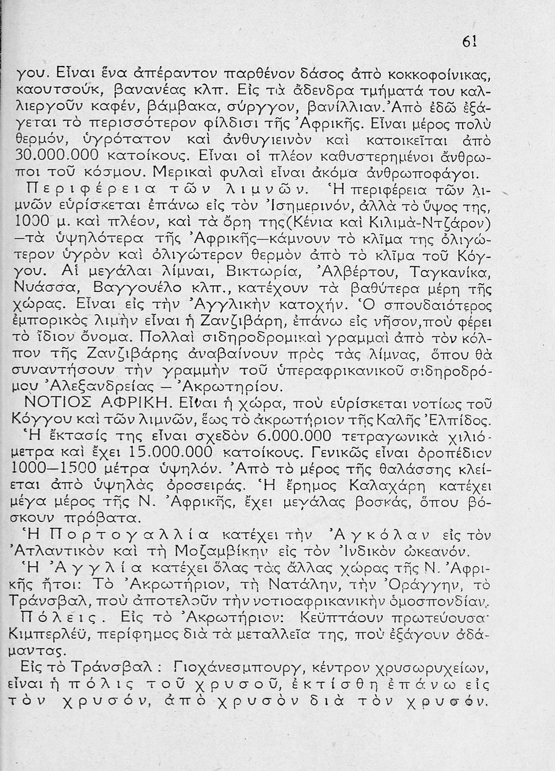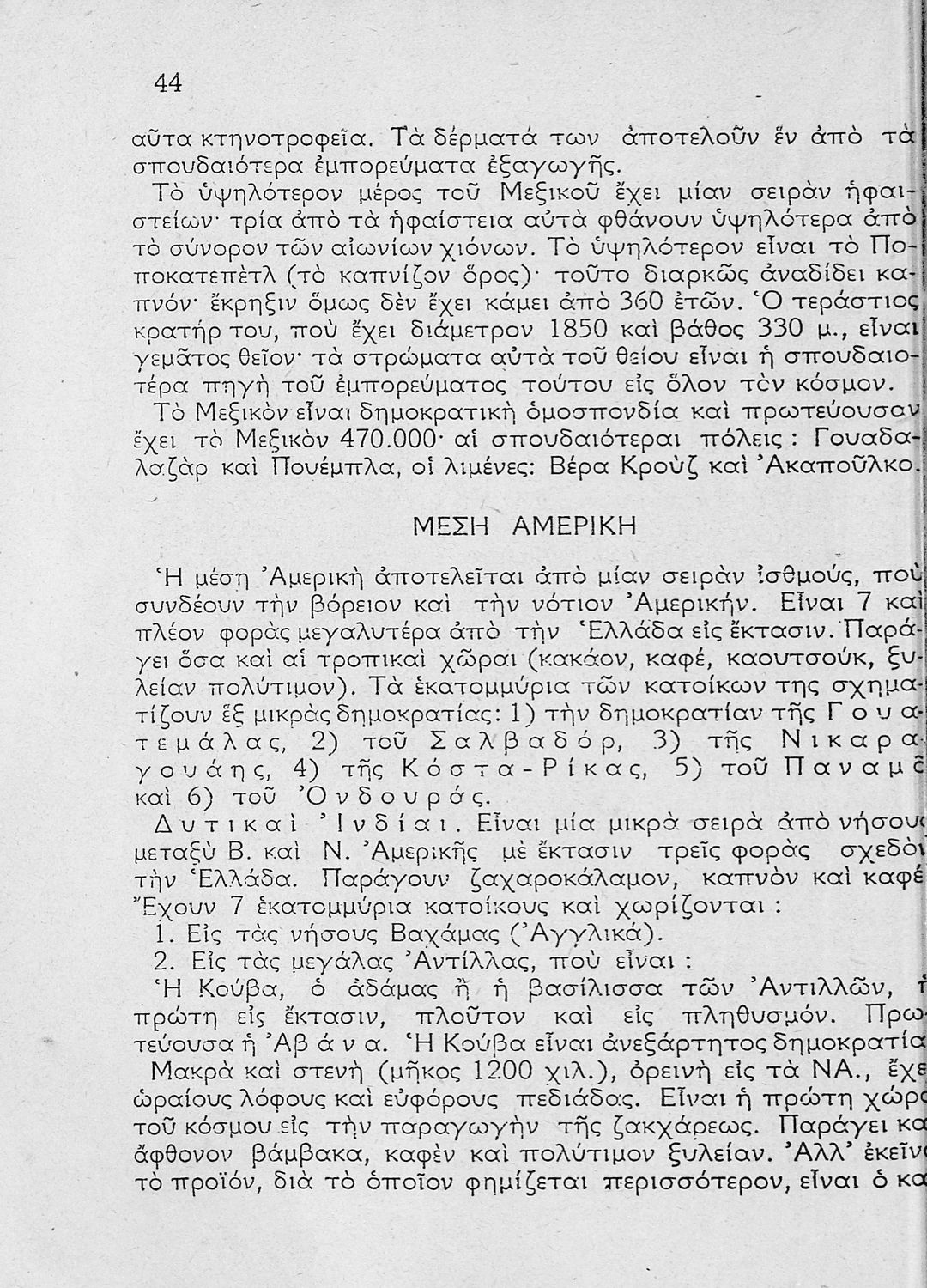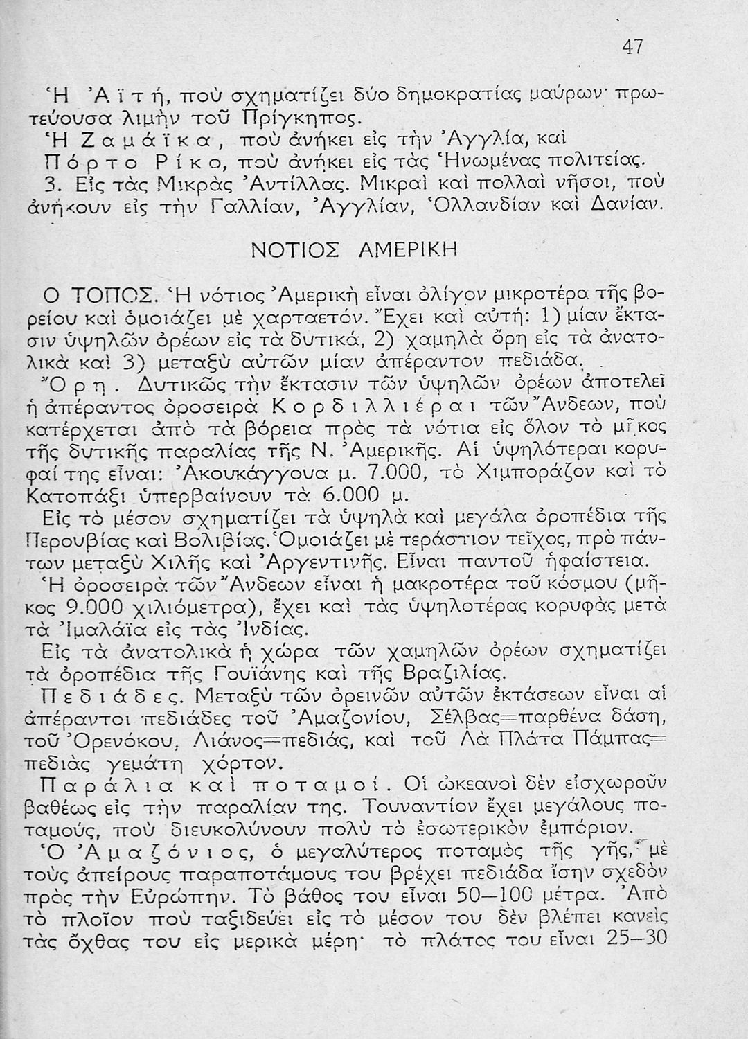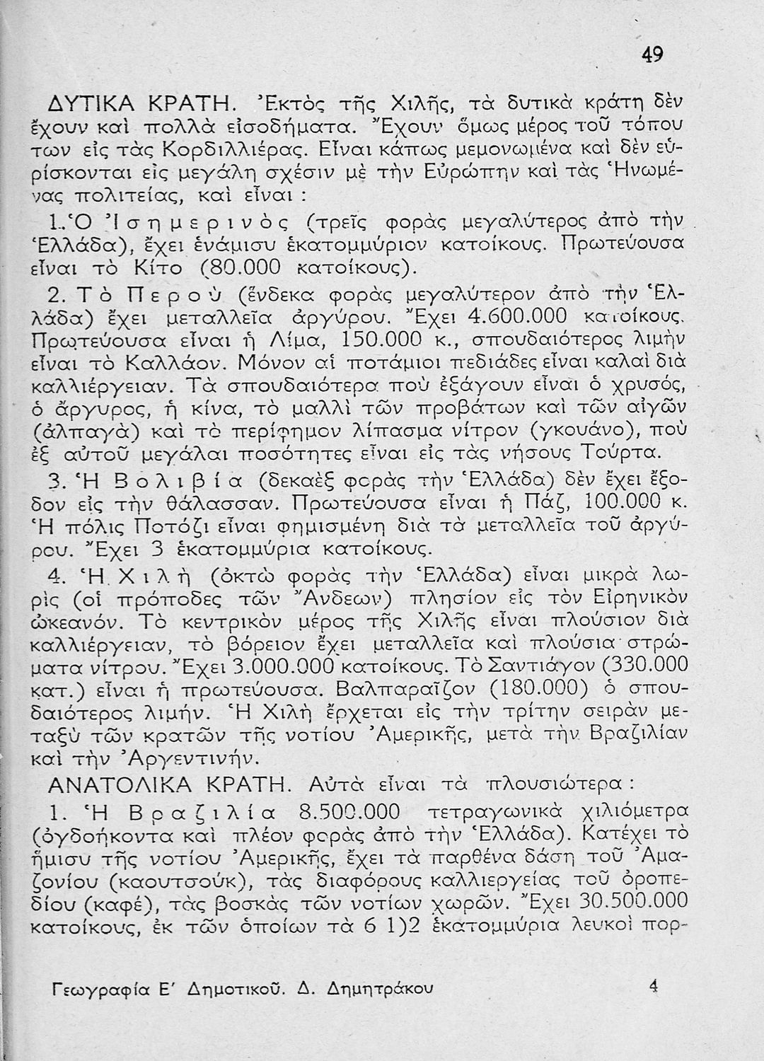 Μαθητικό βοήθημα Γεωγραφίας Ε΄ Δημοτικού που πραγματεύεται την σύσταση και δομή της Γης, τις ηπείρους πλην της Ευρώπης και τις μεγαλύτερες πληθυσμιακά πόλεις κατά το 1920. Περιέχει και συγκριτική μελέτη για την παραγωγή και διάθεση προϊόντων μεταξύ των κρατών και πληροφορίες για τους μεγάλους θαλασσοπόρους και εξερευνητές.