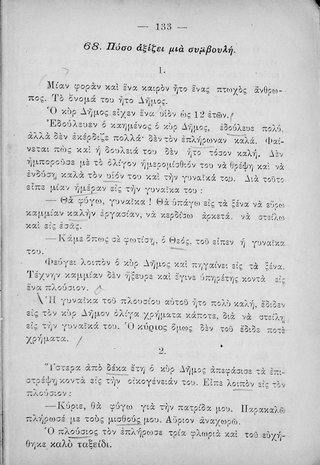 Αναγνωστικό Γ΄ Δημοτικού που περιλαμβάνει ποιήματα και πεζά με θέματα όπως η καλή και κακή συναναστροφή, η φρόνηση, η οκνηρία, η φιλανθρωπία και η πίστη στο Θεό