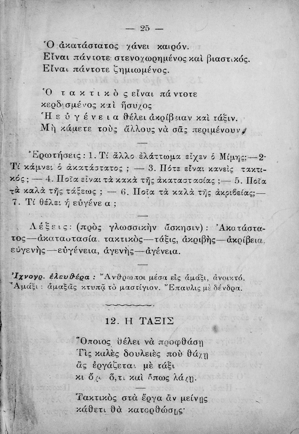 Αναγνωστικό Γ΄ Δημοτικού που περιλαμβάνει ποιήματα και πεζά με θέματα όπως η καλή και κακή συναναστροφή, η φρόνηση, η οκνηρία, η φιλανθρωπία και η πίστη στο Θεό
