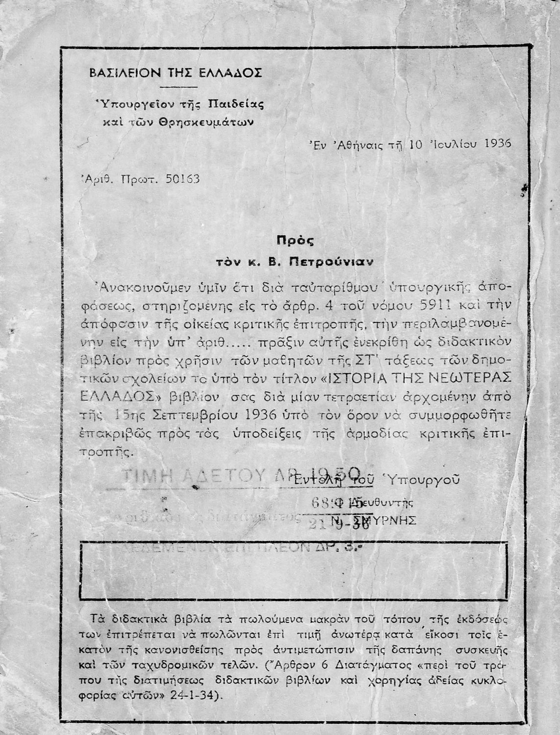 Κωδικός αναγνώρισης: 20-E0238 Τίτλος: Ιστορία της νεωτέρας Ελλάδος εγκεκριμένη διά την ΣΤ΄ τάξιν και τας Ε΄ και ΣΤ΄ συνδιδασκομένας των Δημοτικών Σχολείων Συγγραφέας: Βασίλειος Πετρούνιας Μέγεθος και υπόστρωμα: Σχολικό εγχειρίδιο, 18εκ., σκληρό εξώφυλλο, 176 σελίδες. Σκίτσα (ασπρόμαυρα). |
