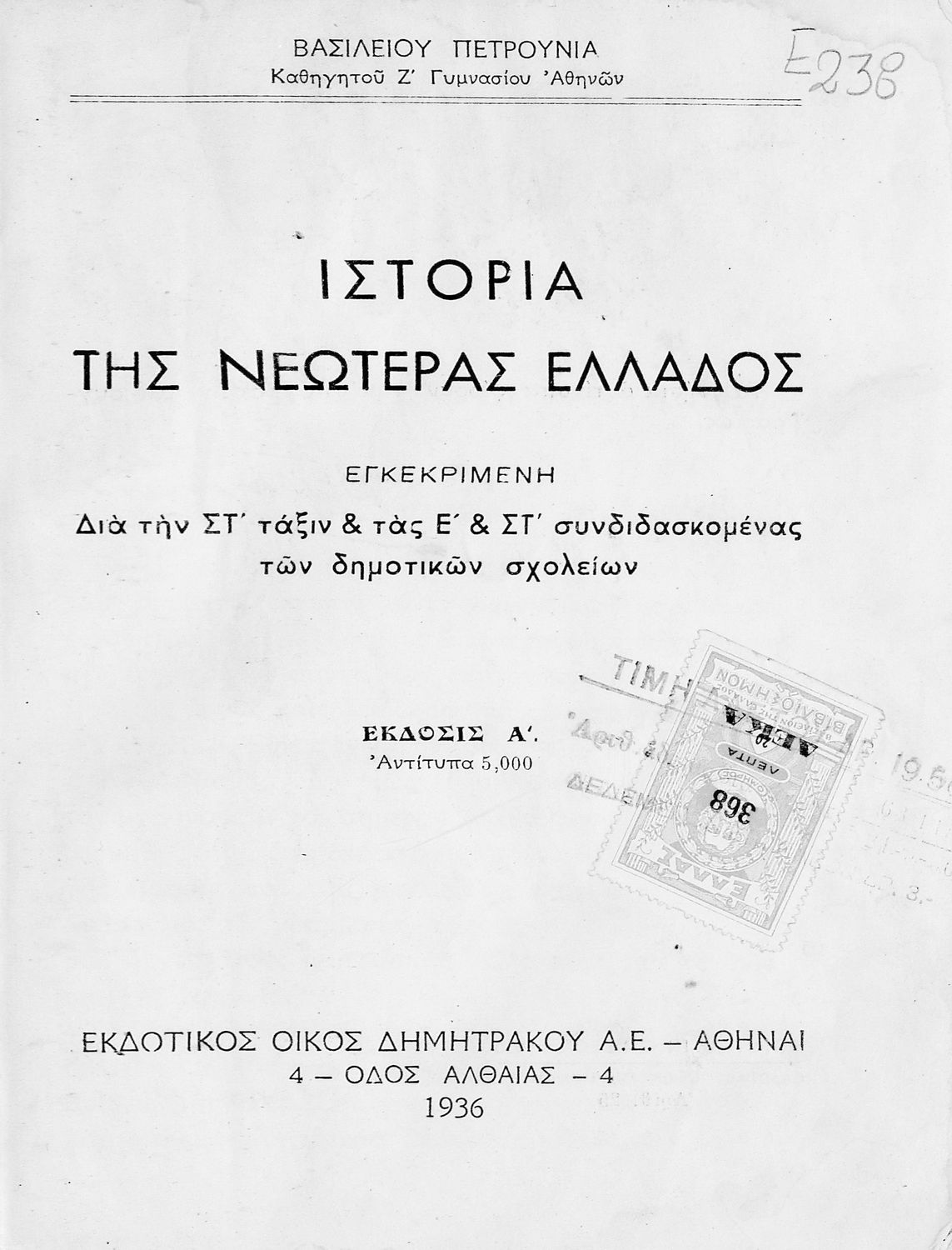 Τίτλος: Ιστορία της νεωτέρας Ελλάδος εγκεκριμένη διά την ΣΤ΄ τάξιν και τας Ε΄ και ΣΤ΄ συνδιδασκομένας των Δημοτικών Σχολείων