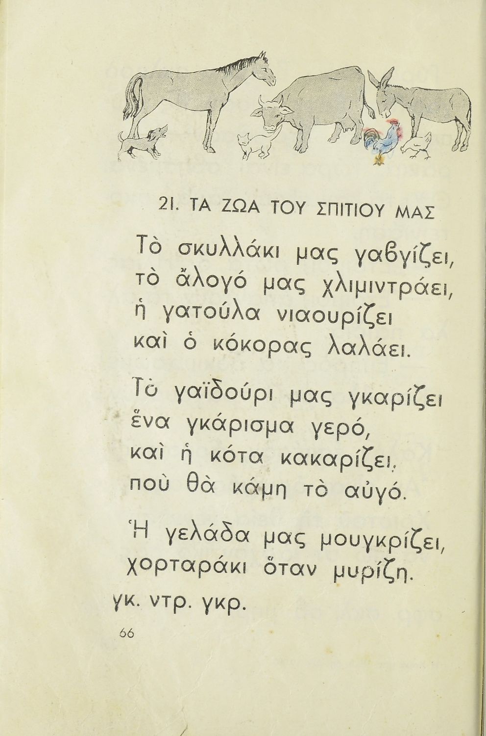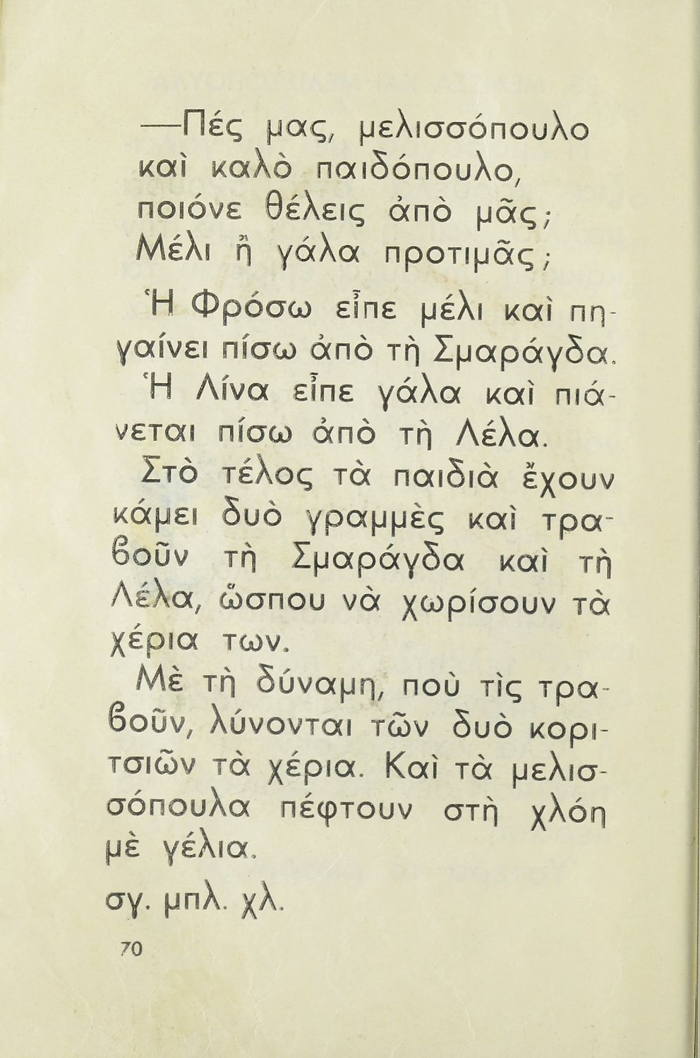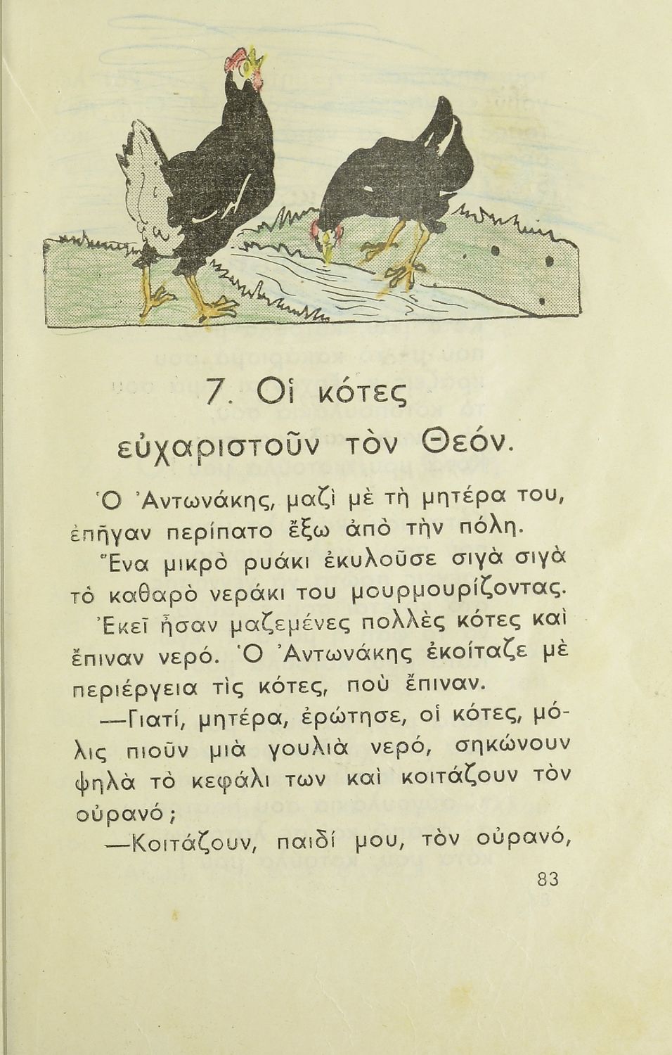 Αναγνωστικό Α΄ Δημοτικού που περιλαμβάνει κείμενα από την καθημερινότητα των παιδιών, τη θρησκευτική παράδοση, τα επαγγέλματα και τις ασχολίες των ανθρώπων, τα τοπικά ήθη και έθιμα, την αγάπη για τα ζώα, τη φύση και την πατρίδα.