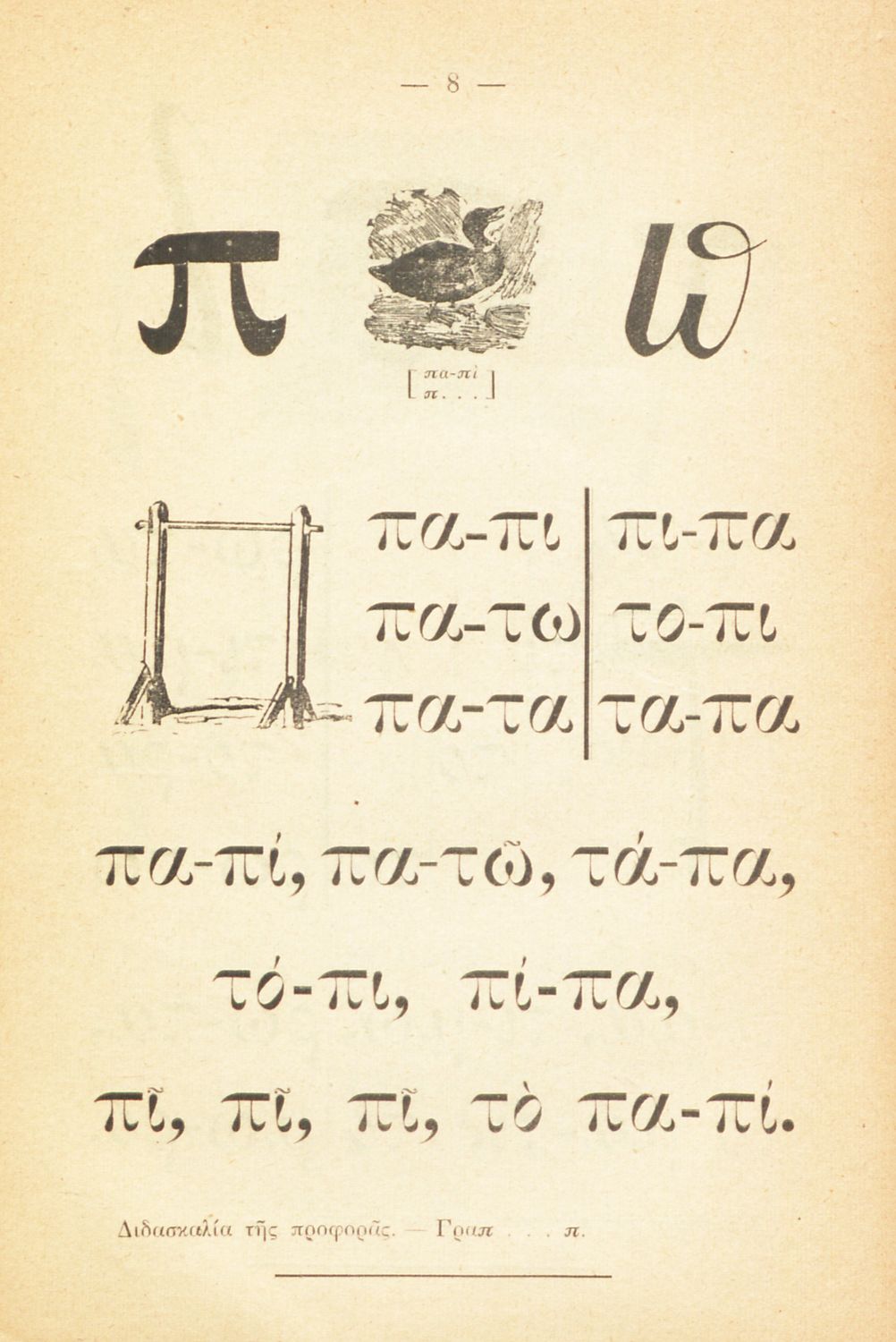 Παρουσίαση περιεχομένου: Αναγνωστικό [Α΄ ] Δημοτικού που περιέχει τα γράμματα, συλλαβές και λέξεις καθώς και ασκήσεις συλλαβισμού. Ο συγγραφέας ήταν δημοδιδάσκαλος και υπάλληλος στο Ελληνικό Προξενείο στο Μοναστήρι (Μπίτολα).