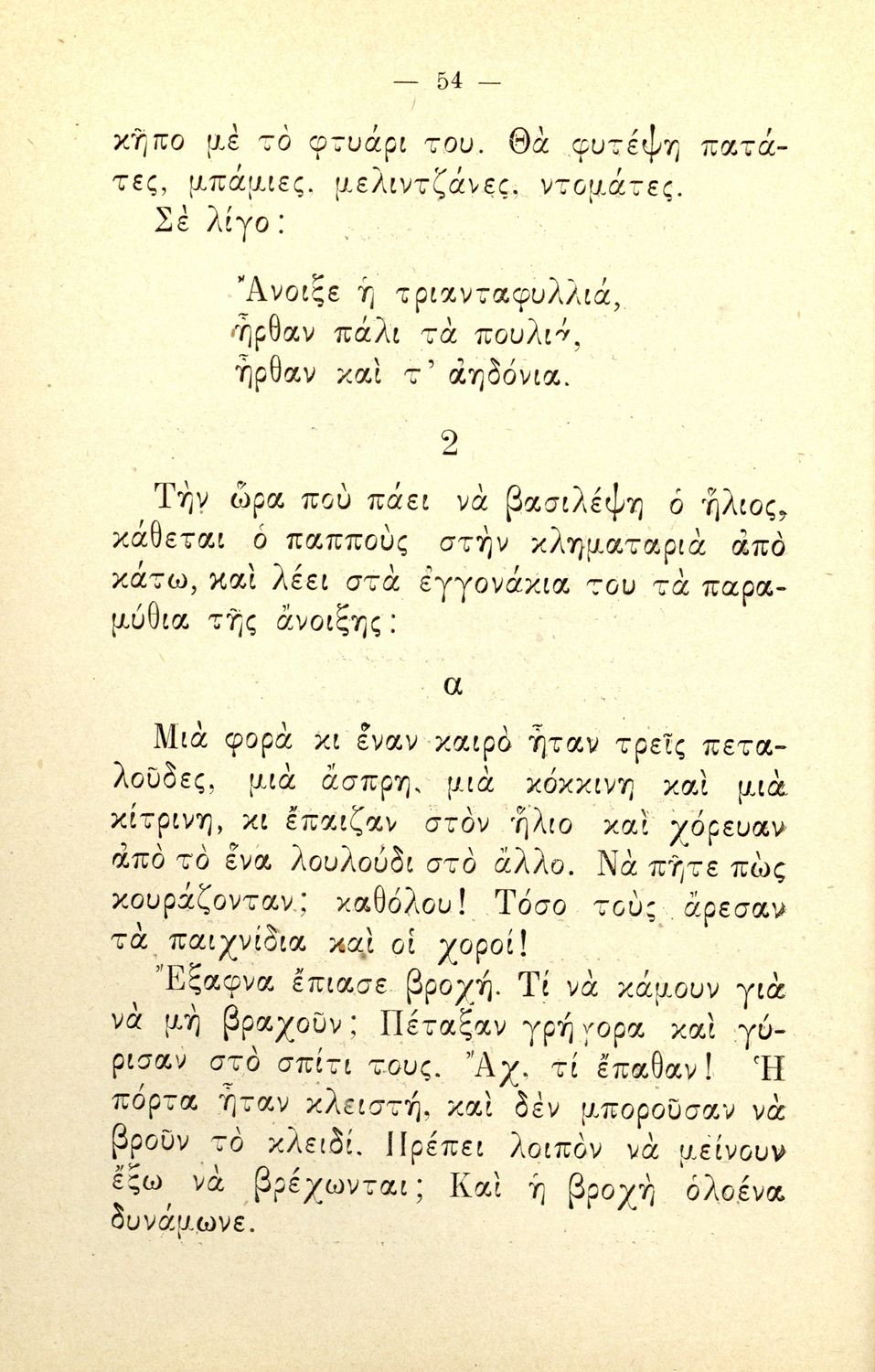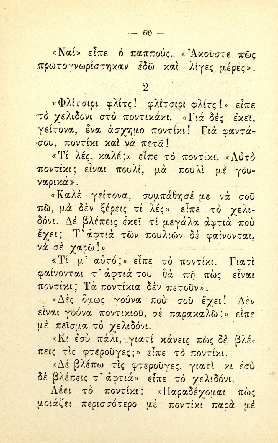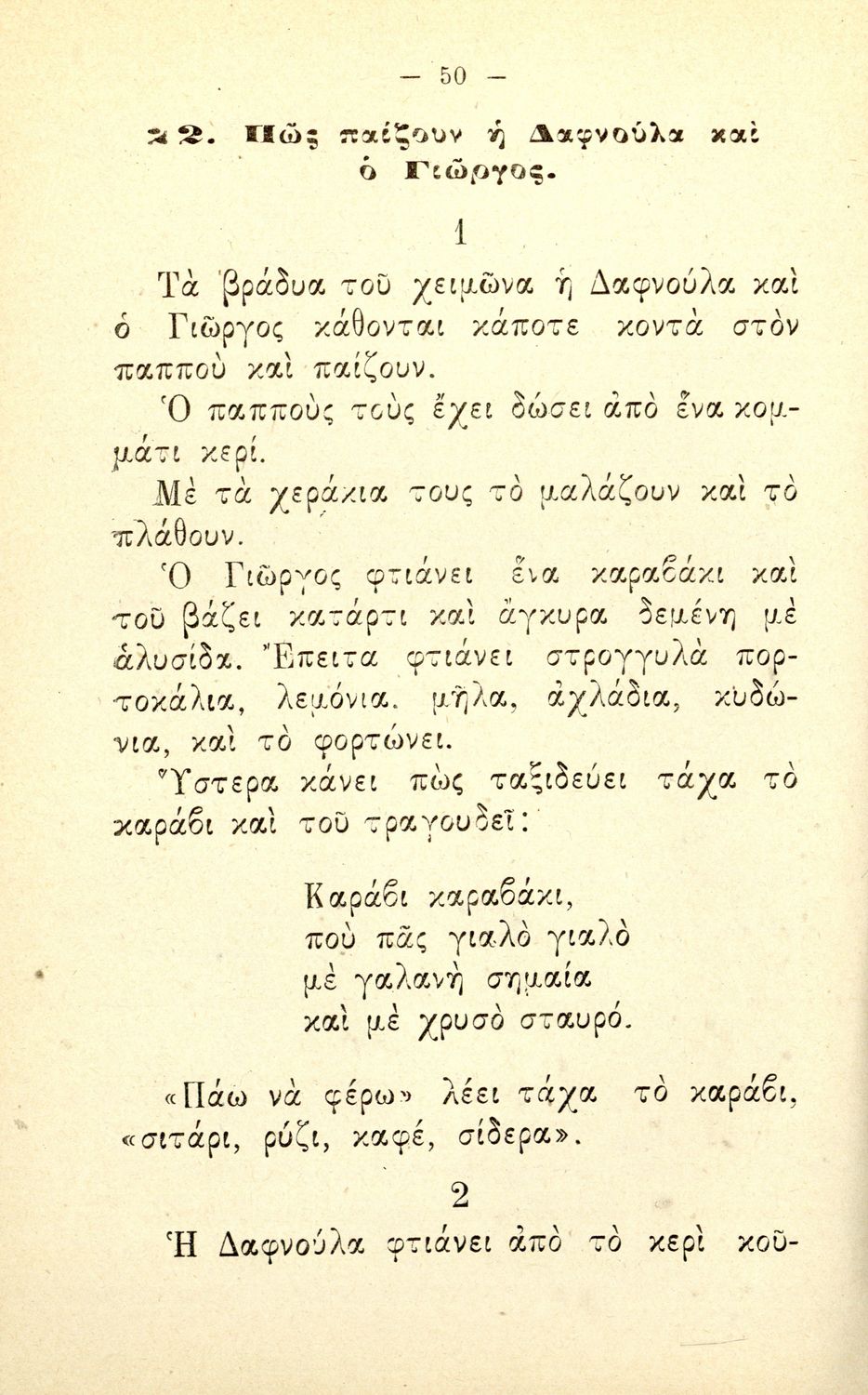 Αναγνωστικό [Α΄ Δημοτικού] που περιλαμβάνει ποιηματάκια και ιστοριούλες και αντλεί τη θεματολογία του από καθημερινά περιστατικά, την ελληνική ύπαιθρο και την ελληνική οικογένεια.