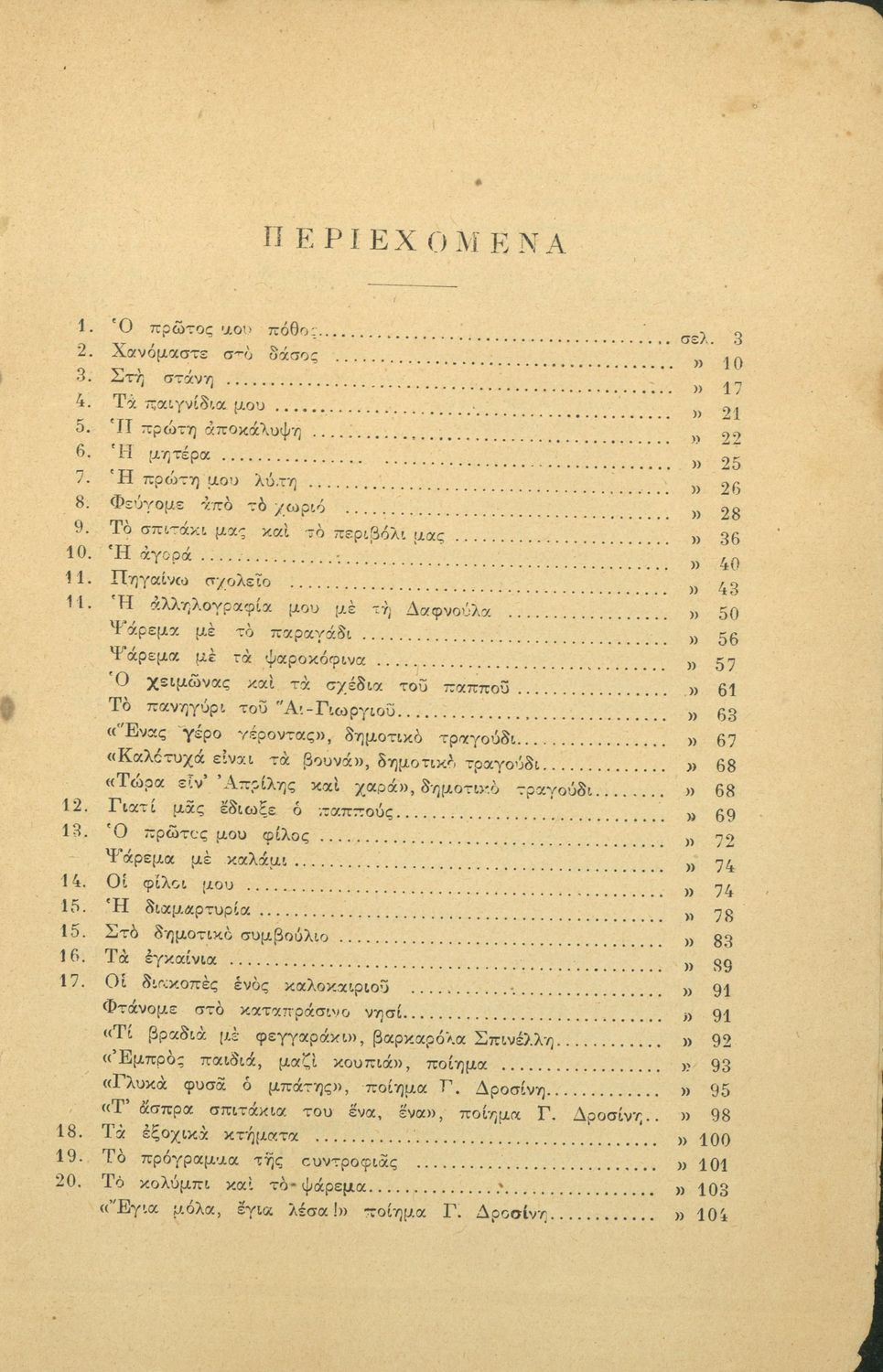 Αναγνωστικό Γ΄ Δημοτικού που περιλαμβάνει διηγήματα εμπνευσμένα από την οικογενειακή ζωή, την ελληνική ύπαιθρο, τις διαπροσωπικές σχέσεις και τα επαγγέλματα και τις ασχολίες των ανθρώπων. Περιέχει και 6 τραγούδια με τις παρτιτούρες τους.