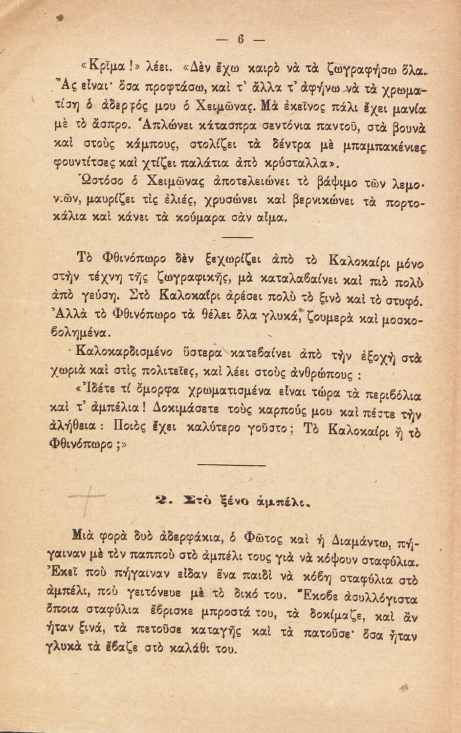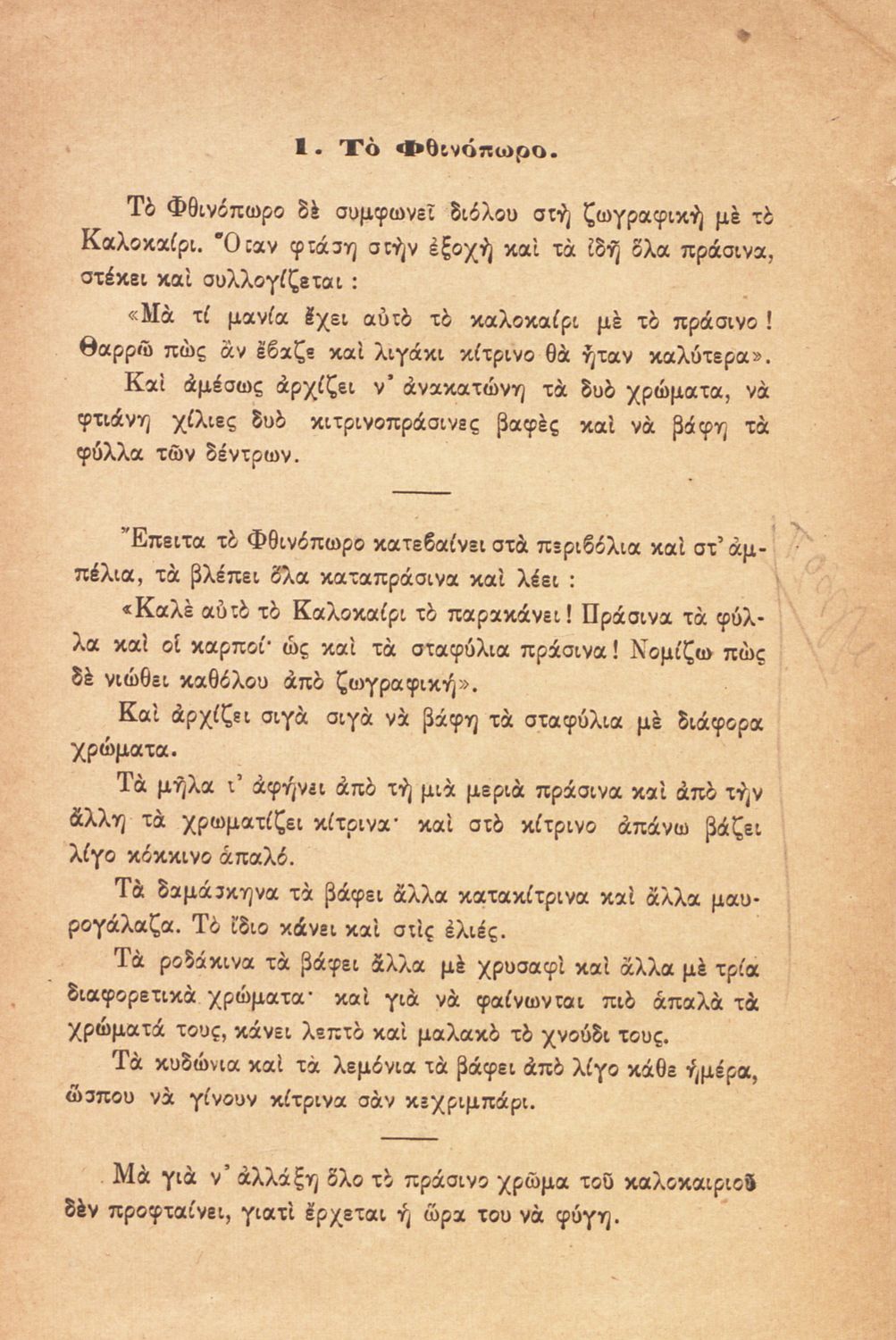 Αναγνωστικό Γ' Δημοτικού που είναι χωρισμένο σύμφωνα με τις εποχές του χρόνου και περιλαμβάνει ποιήματα και πεζά εμπνευσμένα από τη ζωή στην ύπαιθρο, την εθνική, οικογενειακή και κοινωνική ζωή, τη θρησκευτική ...