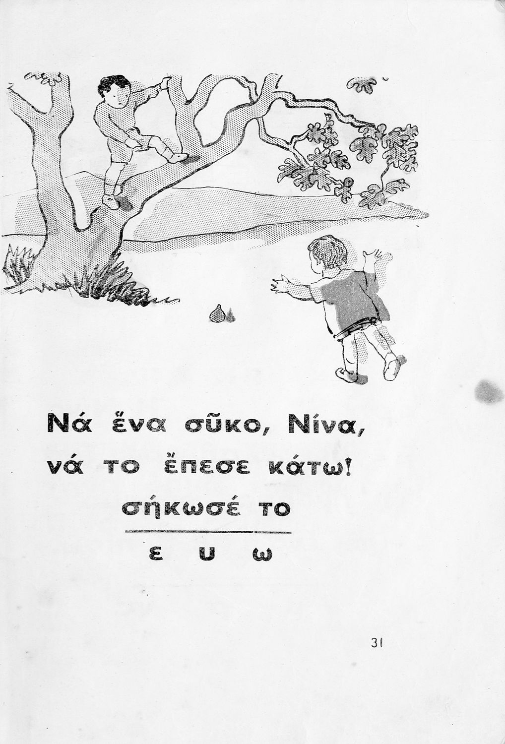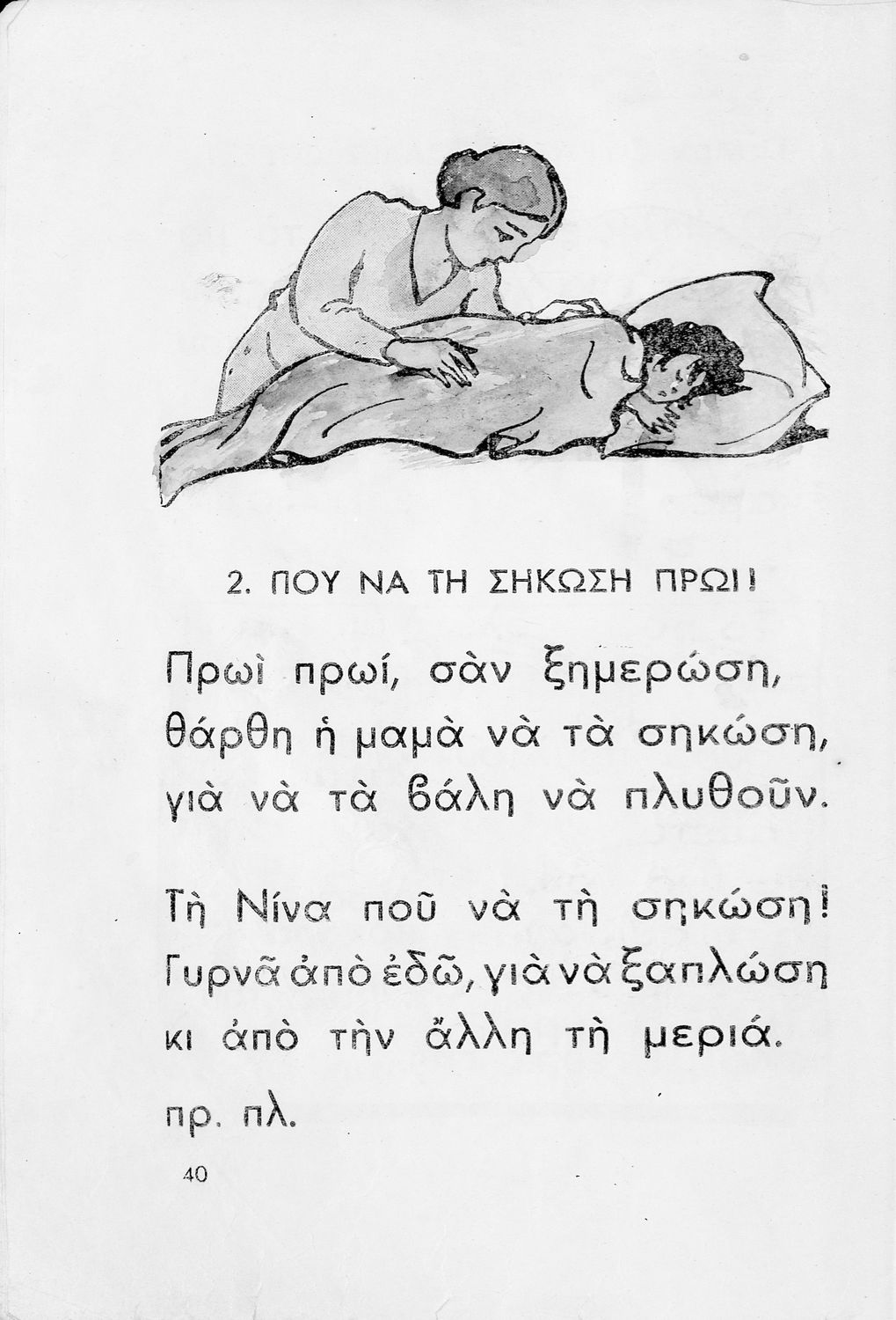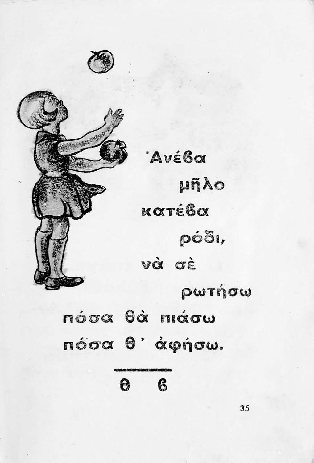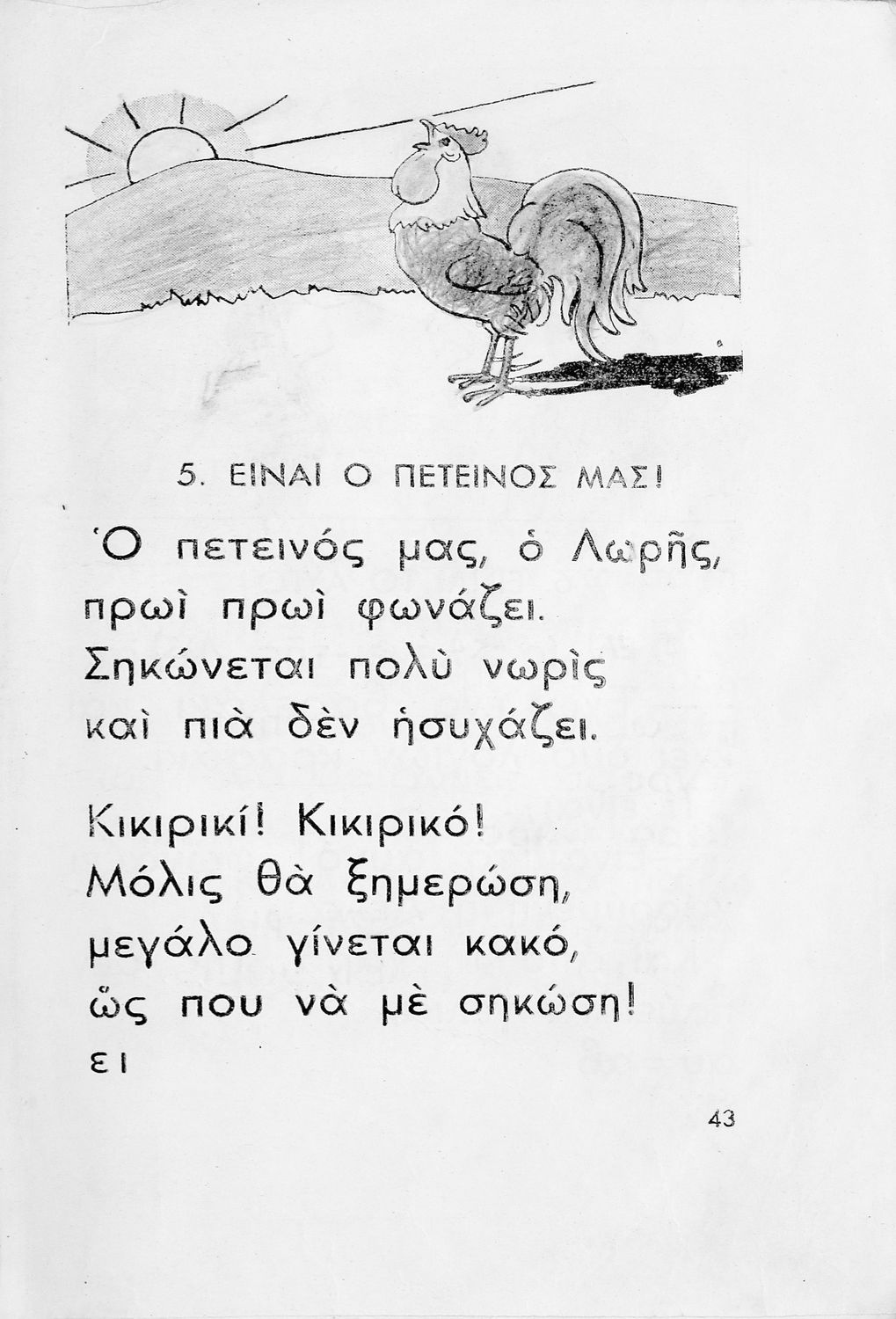 Αναγνωστικό [Α΄ Δημοτικού] που περιλαμβάνει ποιηματάκια και ιστοριούλες και αντλεί τη θεματολογία του από καθημερινά περιστατικά, την ελληνική ύπαιθρο και την ελληνική οικογένεια.