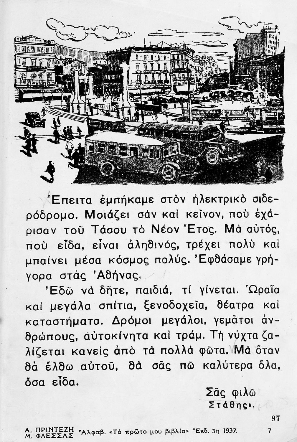 LDR 01384 2200205 4500 035 ## _a20-E0294 040 ## _aΚΕΝΕΚ - Εταιρεία Σπουδών Νεοελληνικού Πολιτισμού και Παιδείας 041 ## _ael 100 ## _aΑ. Πρίντεζης _aΜ. Φλέσσας 110 ## _aE0294 245 0# _aΑλφαβητάριο. Το πρώτο μου βιβλίο 250 ## _a3η Έκδοση 260 ## _aΑθήνα _bΚρίτη _c1937 300 ## _a112 _bΣκίτσα (ασπρόμαυρα και έγχρωμα) Εξώφυλλο (έγχρωμο) _c22 520 ## _aΑναγνωστικό Α΄ Δημοτικού που περιλαμβάνει τα γράμματα του ελληνικού αλφαβήτου, εικόνες, τις πρώτες συλλαβές και λέξεις και μικρά ποιήματα και διηγήματα με ιστορίες από την φύση, την οικογένεια και την ελληνική ύπαιθρο. 521 ## _aΑ' Δημοτικού 522 ## _aΕλλάδα 546 ## _aΔημοτική 563 ## _aΜαλακό Εξώφυλλο 650 #4 _aΑλφάβητο _aΔεξιότητες και επαγγέλματα _aΕικόνες _aΕλληνική ύπαιθρος _aΚαιρικά φαινόμενα _aΛέξεις _aΟικογένεια _aΠαιχνίδι _aΣυλλαβές _aΦθόγγοι