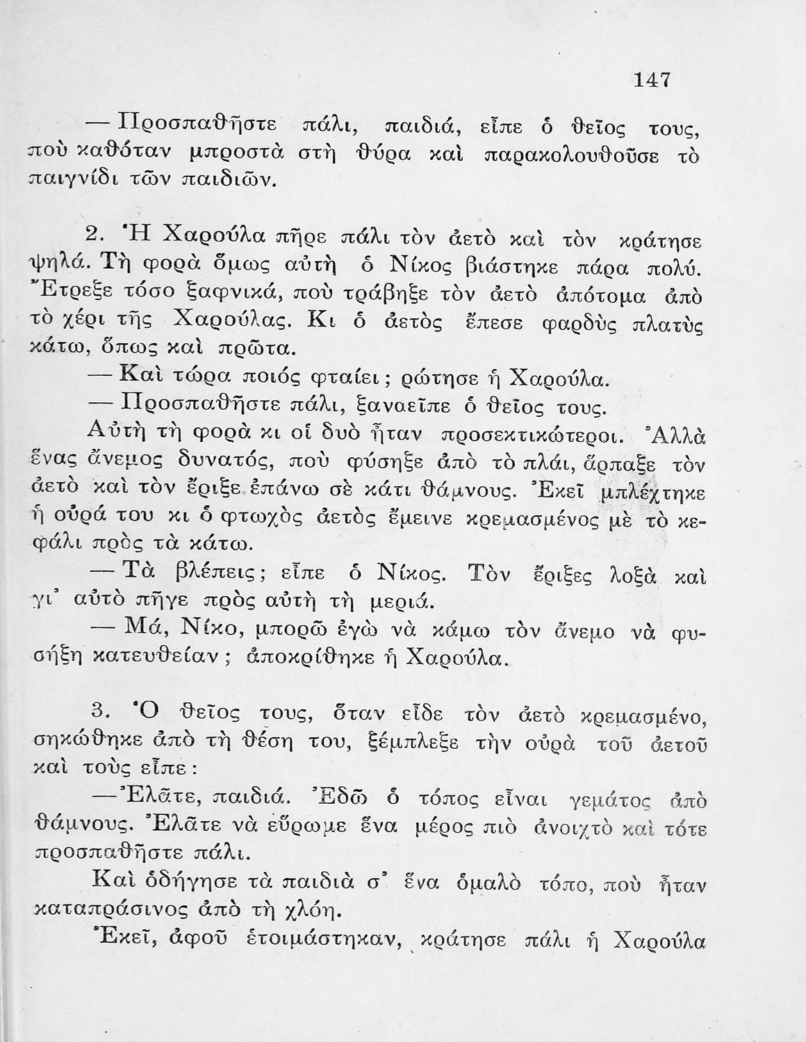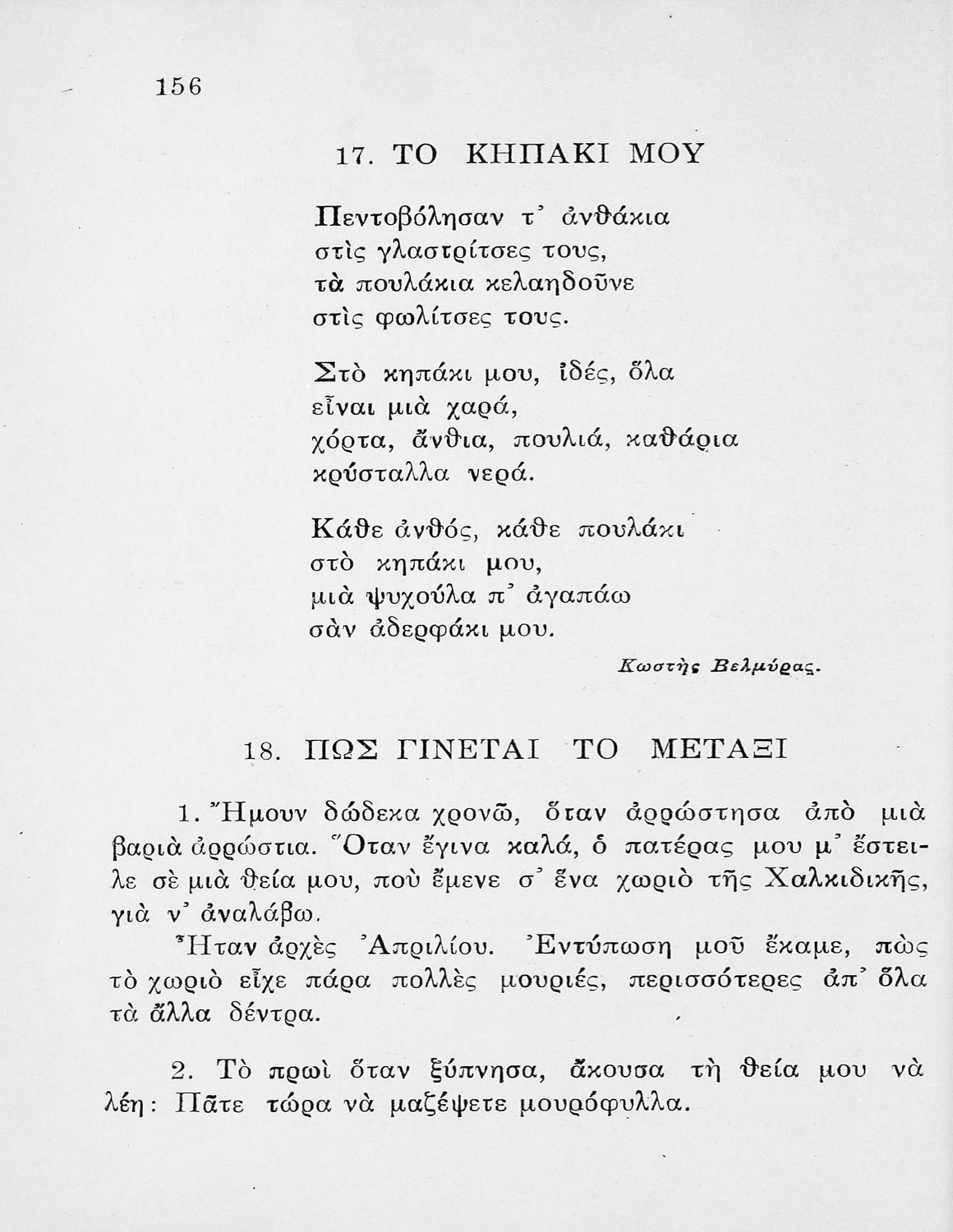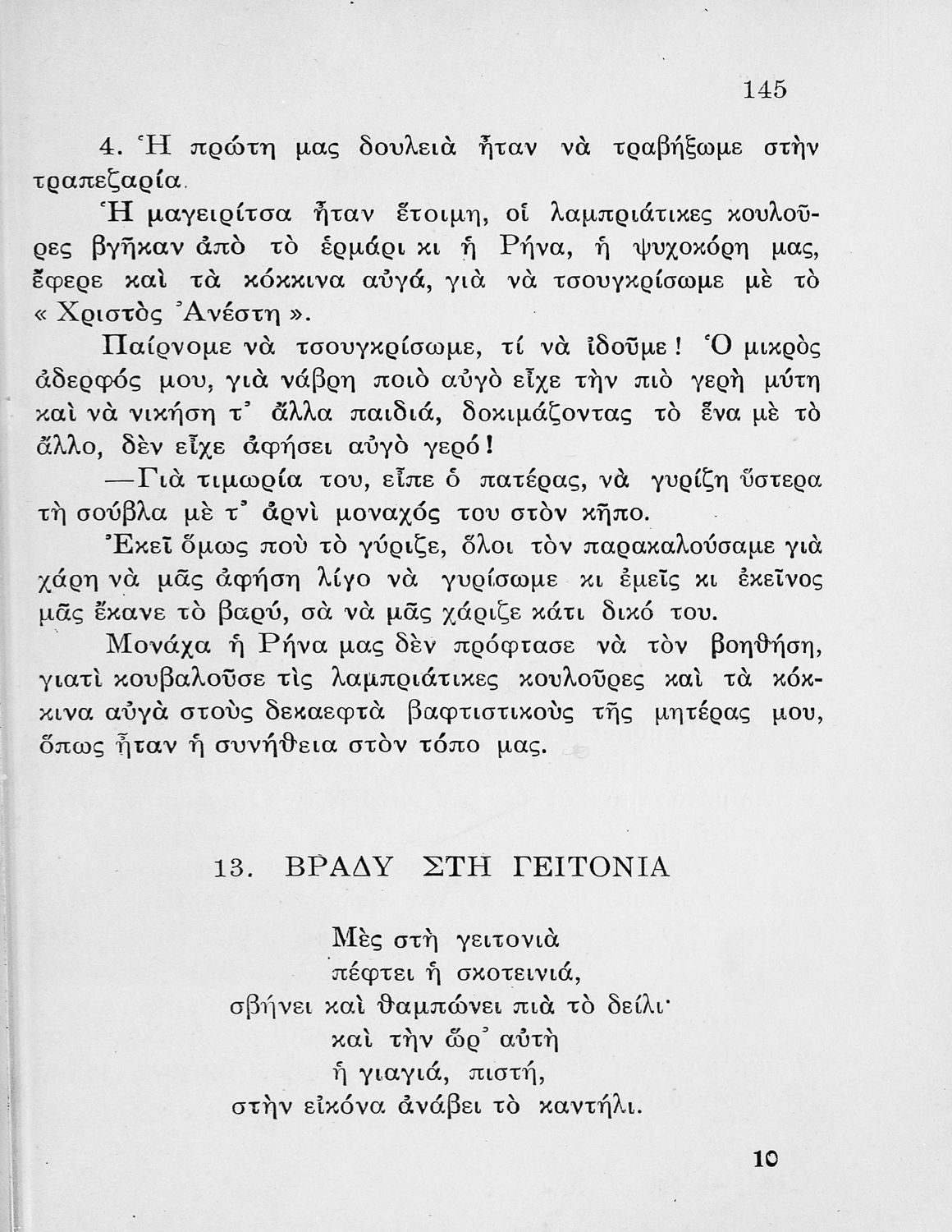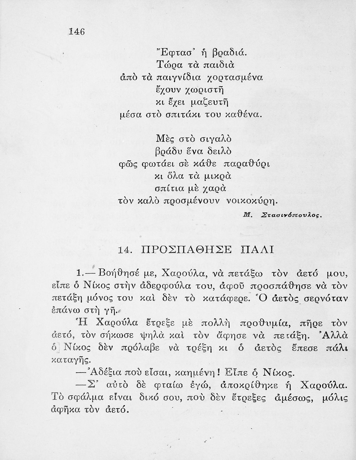 Αναγνωστικό Δ΄ Δημοτικού που περιέχει κείμενα εμπνευσμένα από την ζωή στην ύπαιθρο, την οικογενειακή ζωή, την αγάπη για τα ζώα, τη θρησκευτική παράδοση, την κοινωνική ζωή, την εθνική ζωή και προσήλωση στα εθνικά σύμβολα. 'Όντας σχολικό βιβλίο του μεταξικού καθεστώτος περιέχει χαρακτηριστικά δείγματα της μεταξικής προπαγάνδας και λογικής που παρουσιάζουν τον Ι. Μεταξά, ως μάγο, αρχηγό και κυβερνήτη της Ελλάδας. Όπως όλα τα βιβλία του καθεστώτος φέρει τη ρήση του Μεταξά "Είστε Ελληνόπουλα και είναι μεγάλο πράγμα να είναι κανείς Έλλην".