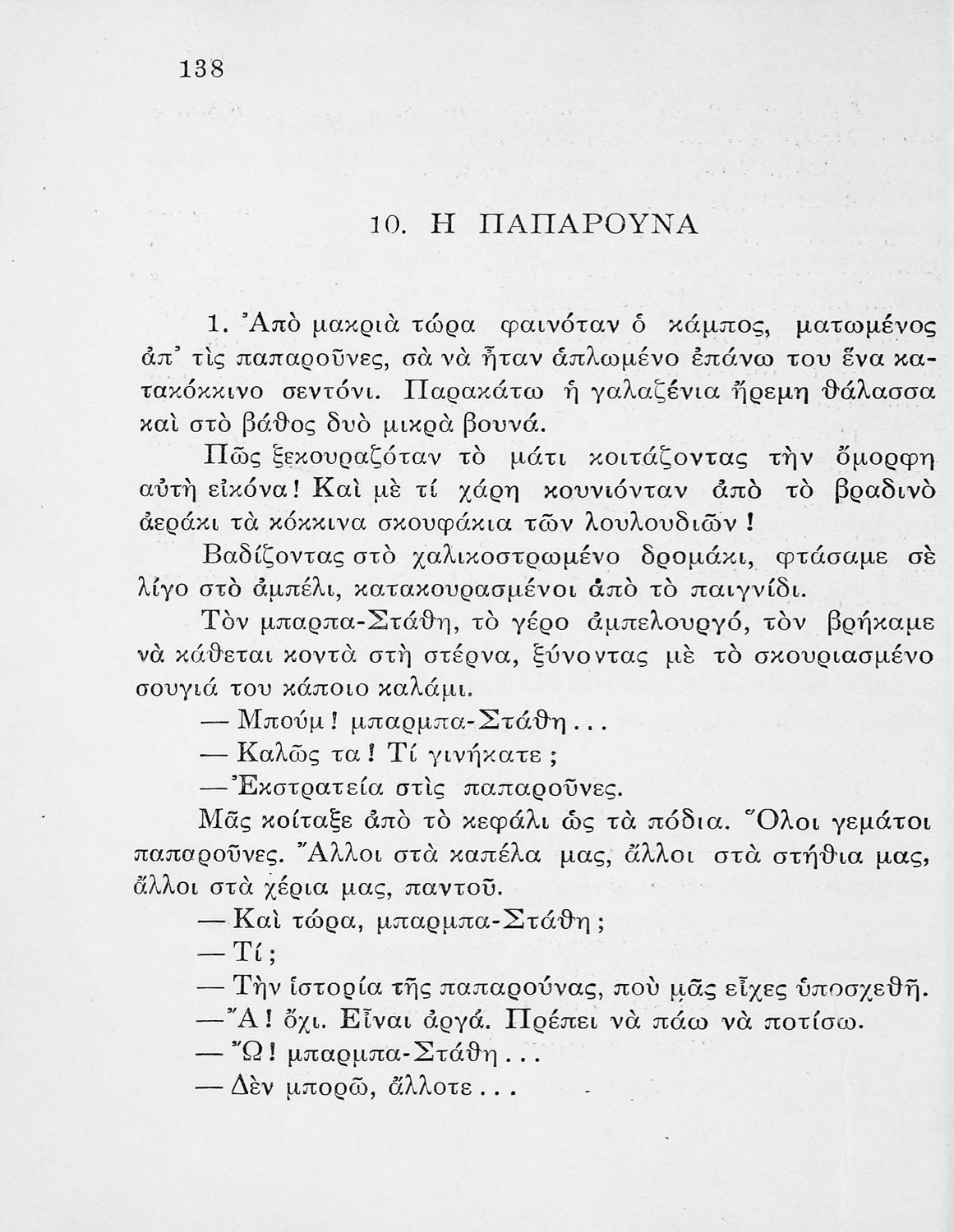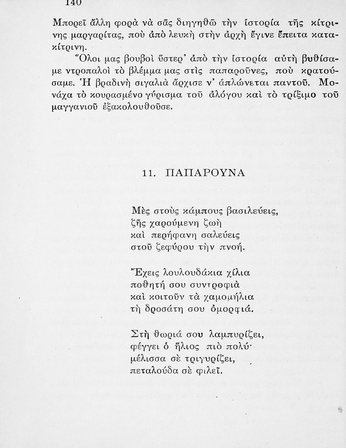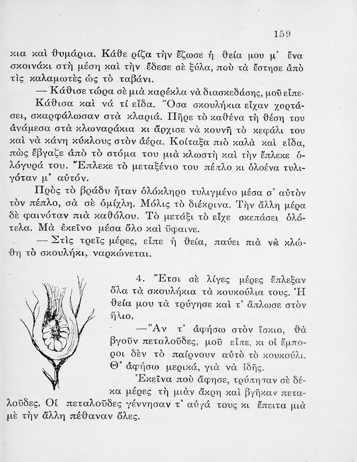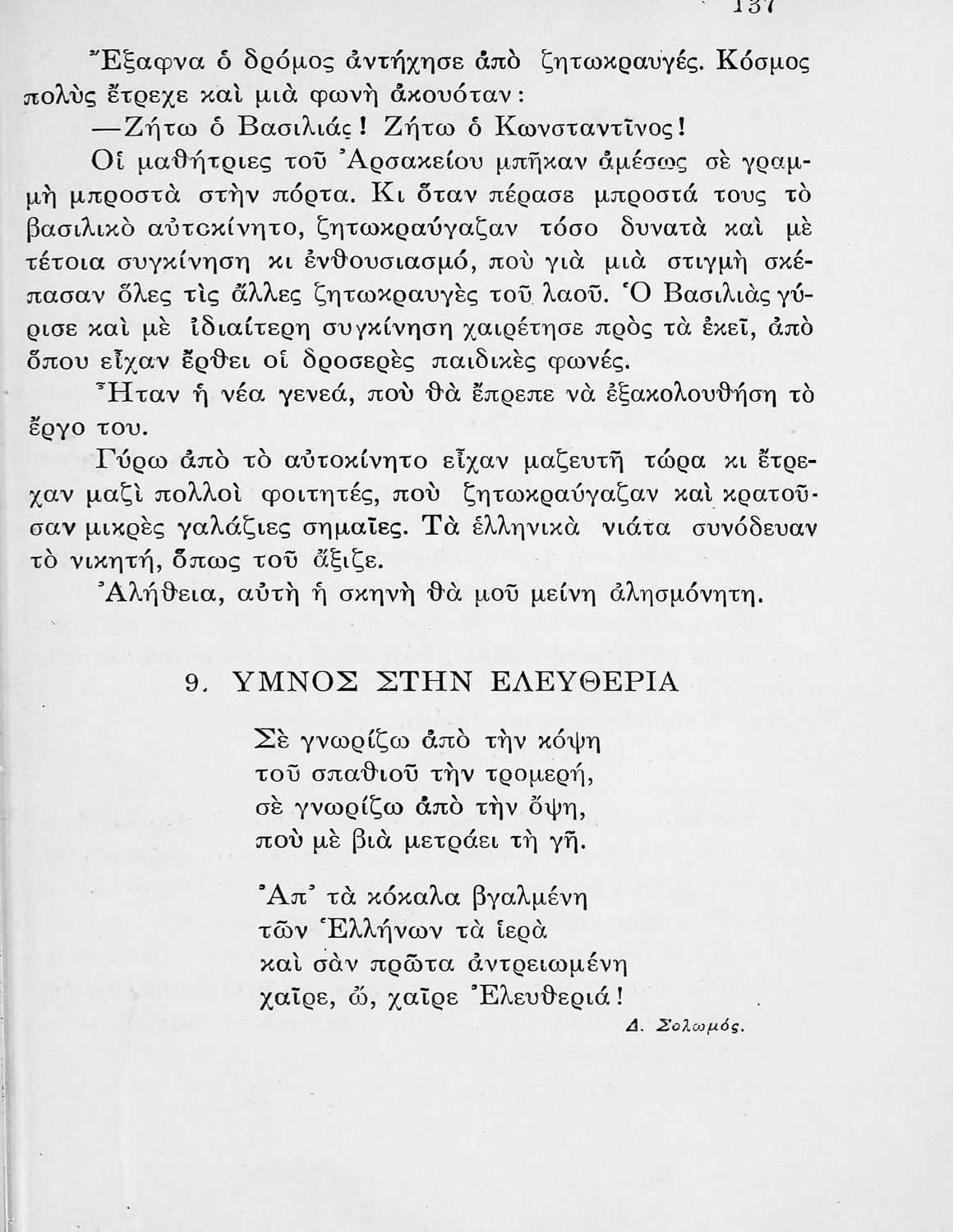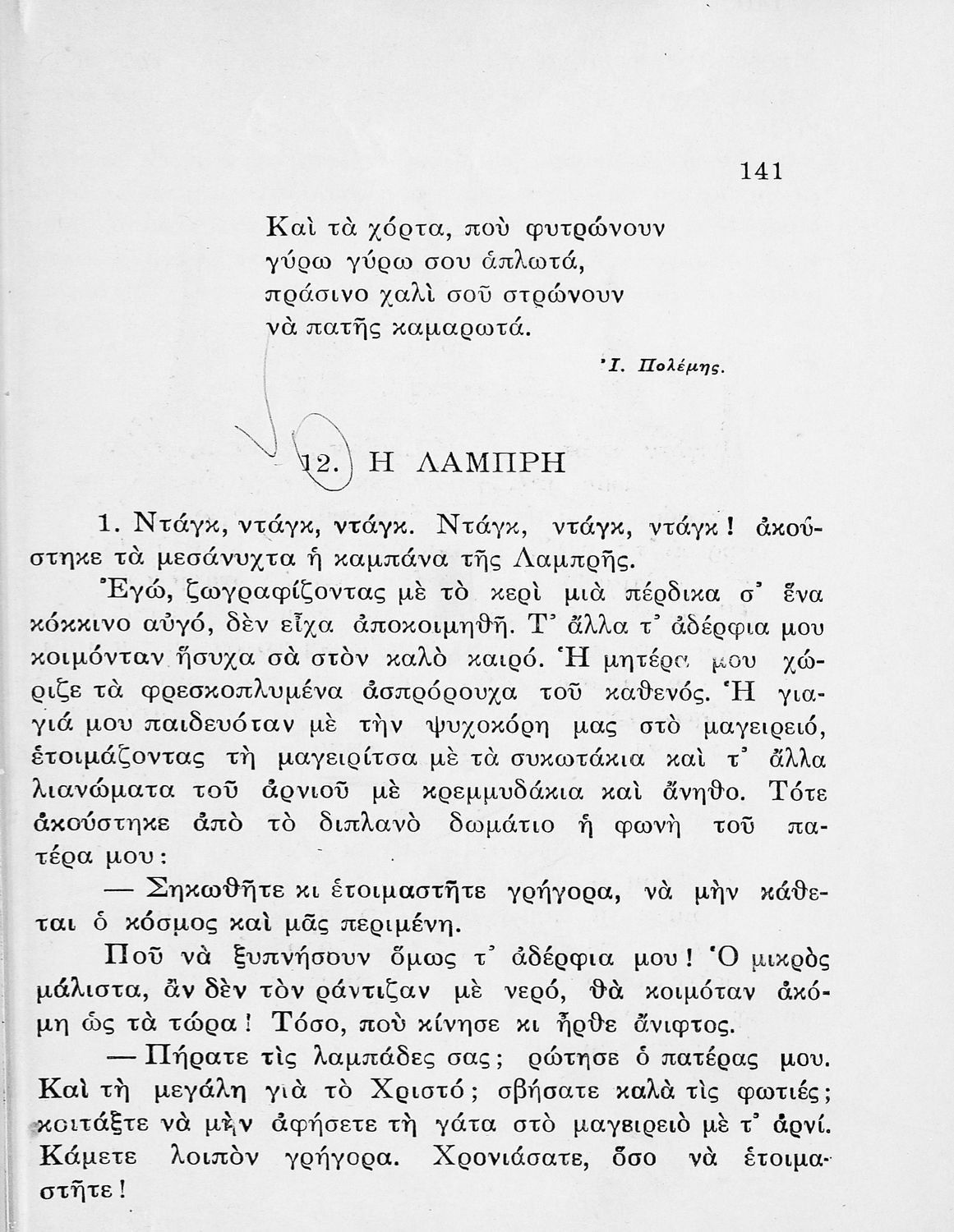 Αναγνωστικό Δ΄ Δημοτικού που περιέχει κείμενα εμπνευσμένα από την ζωή στην ύπαιθρο, την οικογενειακή ζωή, την αγάπη για τα ζώα, τη θρησκευτική παράδοση, την κοινωνική ζωή, την εθνική ζωή και προσήλωση στα εθνικά σύμβολα. 'Όντας σχολικό βιβλίο του μεταξικού καθεστώτος περιέχει χαρακτηριστικά δείγματα της μεταξικής προπαγάνδας και λογικής που παρουσιάζουν τον Ι. Μεταξά, ως μάγο, αρχηγό και κυβερνήτη της Ελλάδας. Όπως όλα τα βιβλία του καθεστώτος φέρει τη ρήση του Μεταξά "Είστε Ελληνόπουλα και είναι μεγάλο πράγμα να είναι κανείς Έλλην".