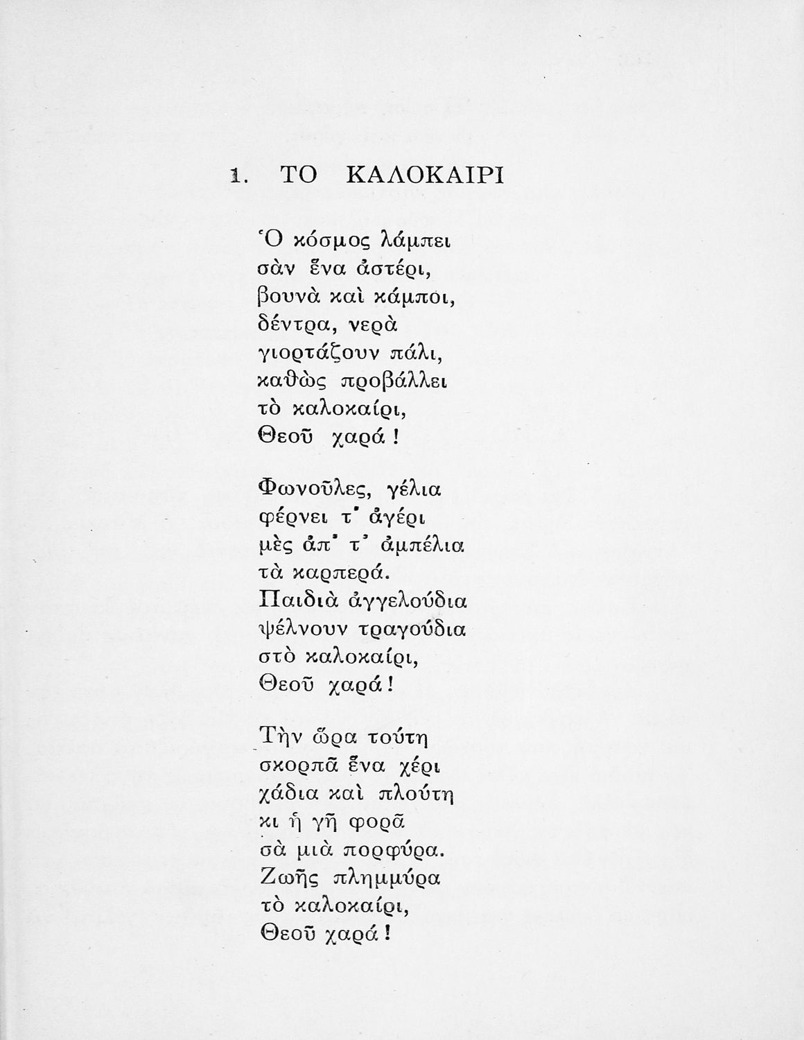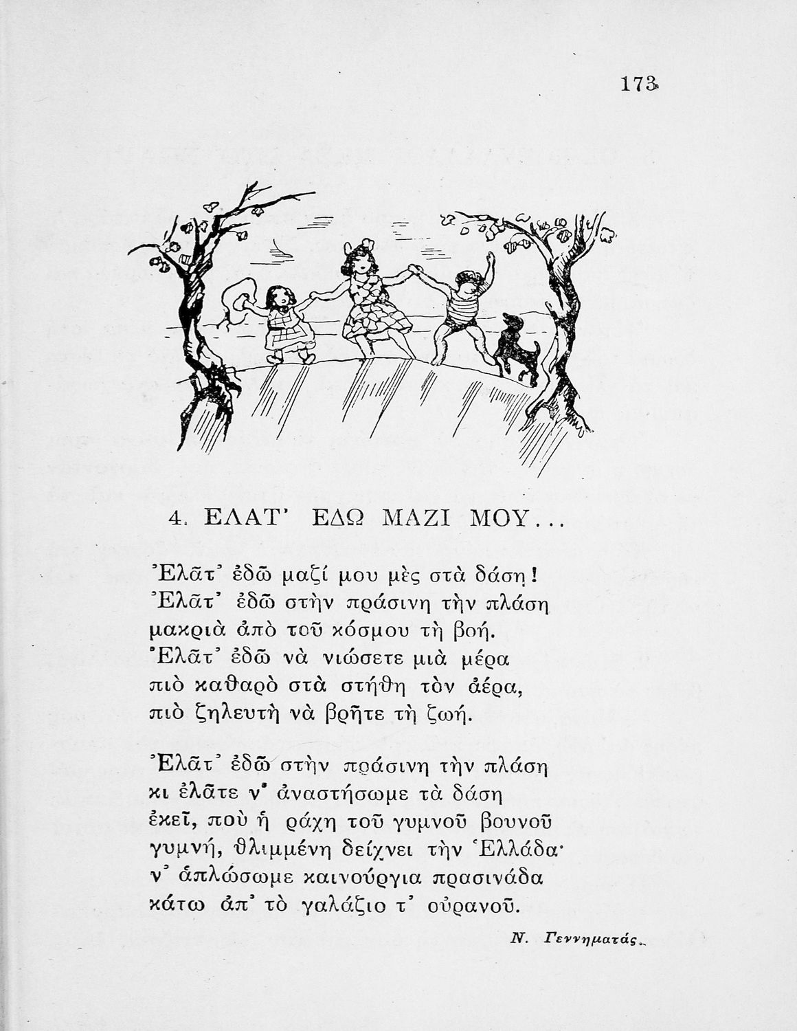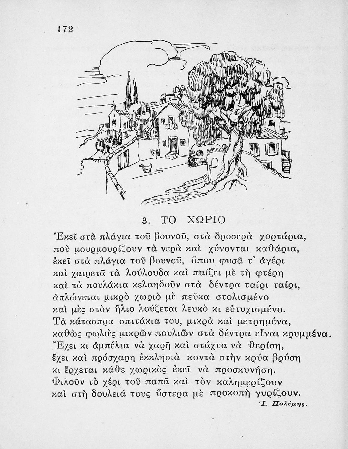 Αναγνωστικό Δ΄ Δημοτικού που περιέχει κείμενα εμπνευσμένα από την ζωή στην ύπαιθρο, την οικογενειακή ζωή, την αγάπη για τα ζώα, τη θρησκευτική παράδοση, την κοινωνική ζωή, την εθνική ζωή και προσήλωση στα εθνικά σύμβολα. 'Όντας σχολικό βιβλίο του μεταξικού καθεστώτος περιέχει χαρακτηριστικά δείγματα της μεταξικής προπαγάνδας και λογικής που παρουσιάζουν τον Ι. Μεταξά, ως μάγο, αρχηγό και κυβερνήτη της Ελλάδας. Όπως όλα τα βιβλία του καθεστώτος φέρει τη ρήση του Μεταξά "Είστε Ελληνόπουλα και είναι μεγάλο πράγμα να είναι κανείς Έλλην".