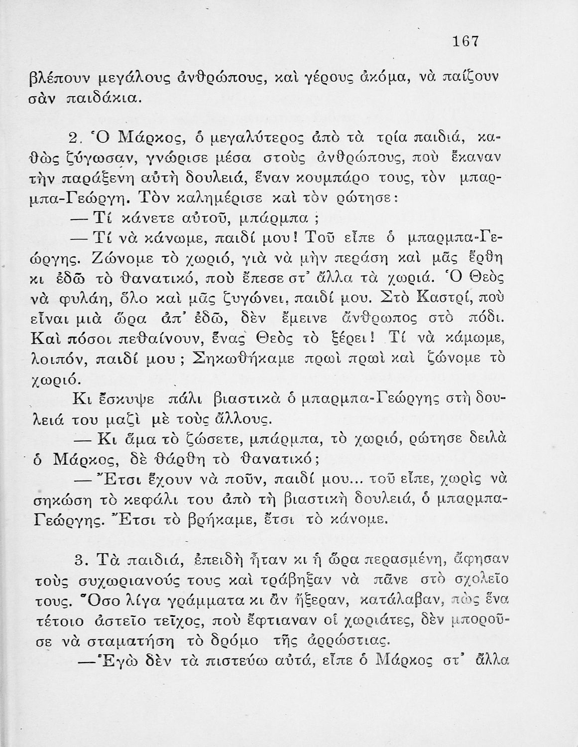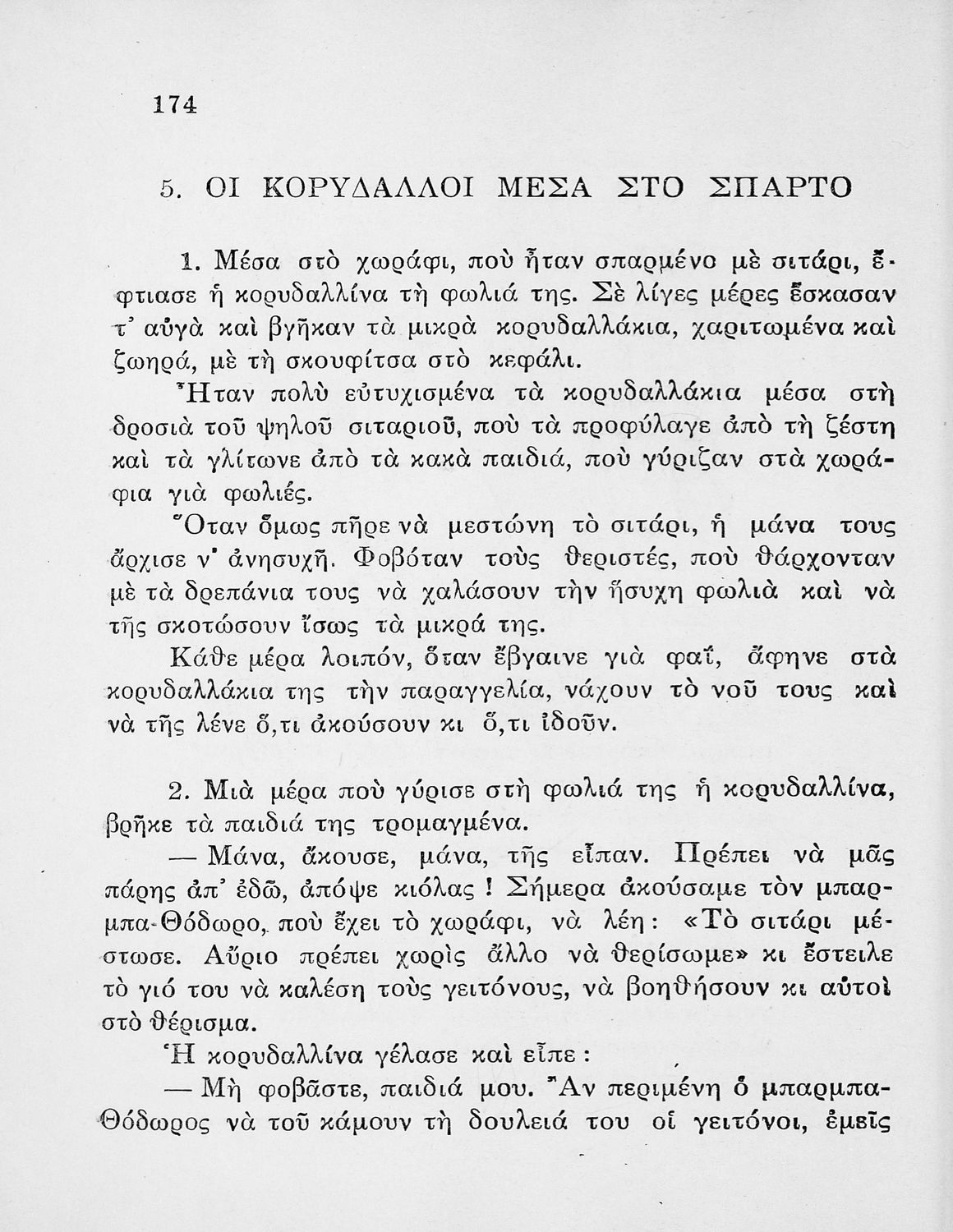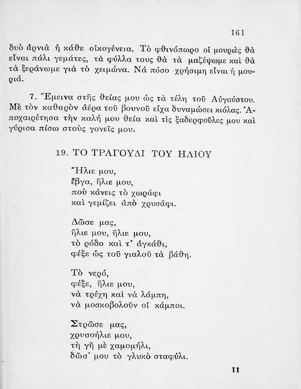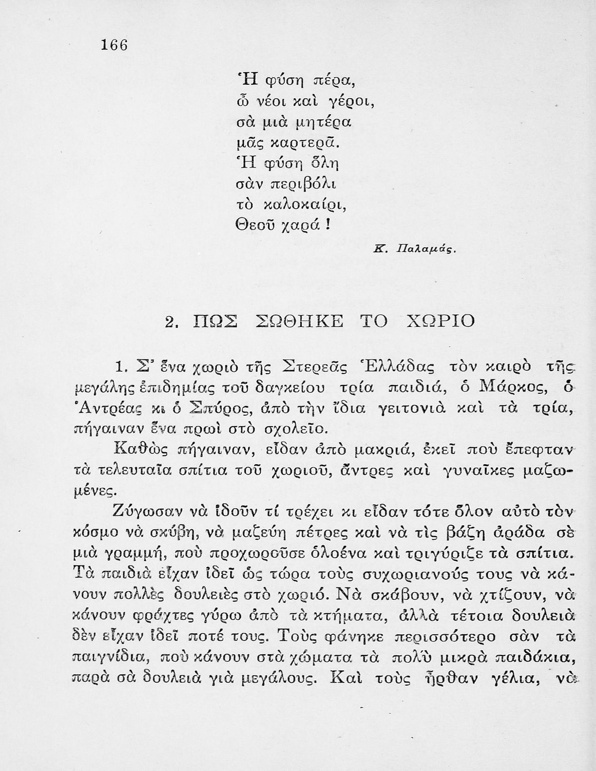 Αναγνωστικό Δ΄ Δημοτικού που περιέχει κείμενα εμπνευσμένα από την ζωή στην ύπαιθρο, την οικογενειακή ζωή, την αγάπη για τα ζώα, τη θρησκευτική παράδοση, την κοινωνική ζωή, την εθνική ζωή και προσήλωση στα εθνικά σύμβολα. 'Όντας σχολικό βιβλίο του μεταξικού καθεστώτος περιέχει χαρακτηριστικά δείγματα της μεταξικής προπαγάνδας και λογικής που παρουσιάζουν τον Ι. Μεταξά, ως μάγο, αρχηγό και κυβερνήτη της Ελλάδας. Όπως όλα τα βιβλία του καθεστώτος φέρει τη ρήση του Μεταξά "Είστε Ελληνόπουλα και είναι μεγάλο πράγμα να είναι κανείς Έλλην".