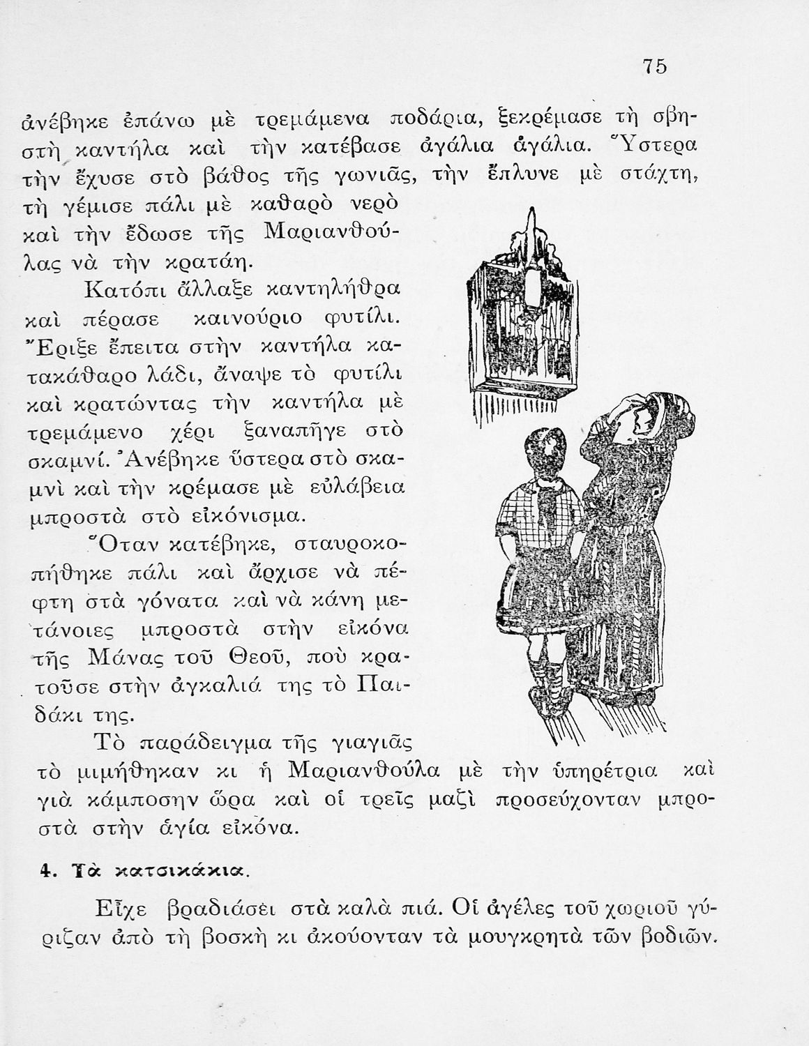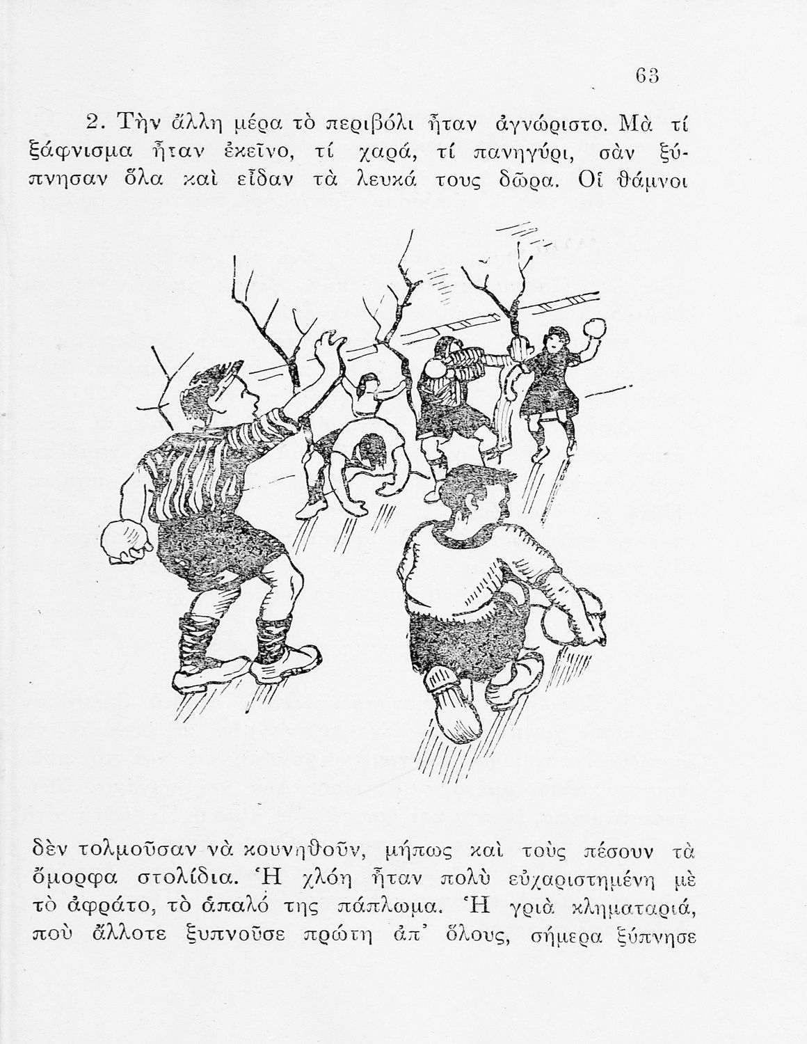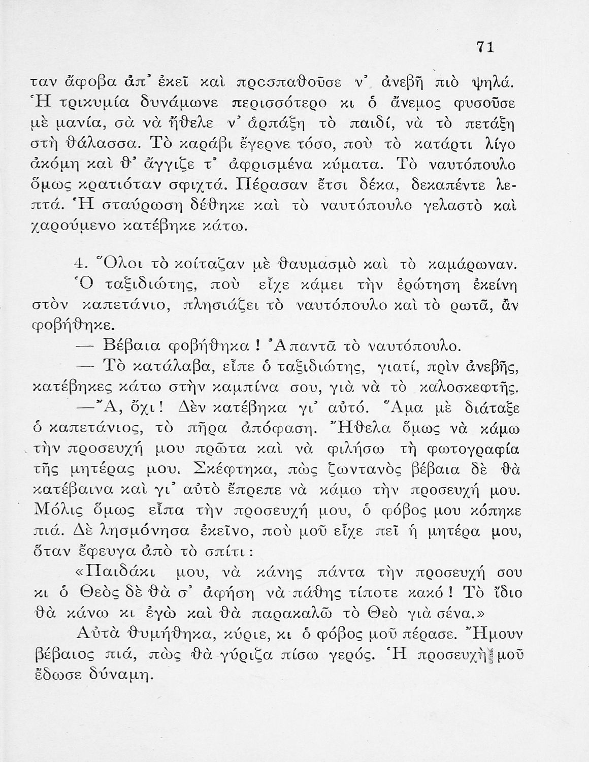 Αναγνωστικό Δ΄ Δημοτικού που περιλαμβάνει θέματα από την θρησκευτική, οικογενειακή και σχολική ζωή του παιδιού, την ελληνική μυθολογία και ιστορία και τη ζωή των ζώων.