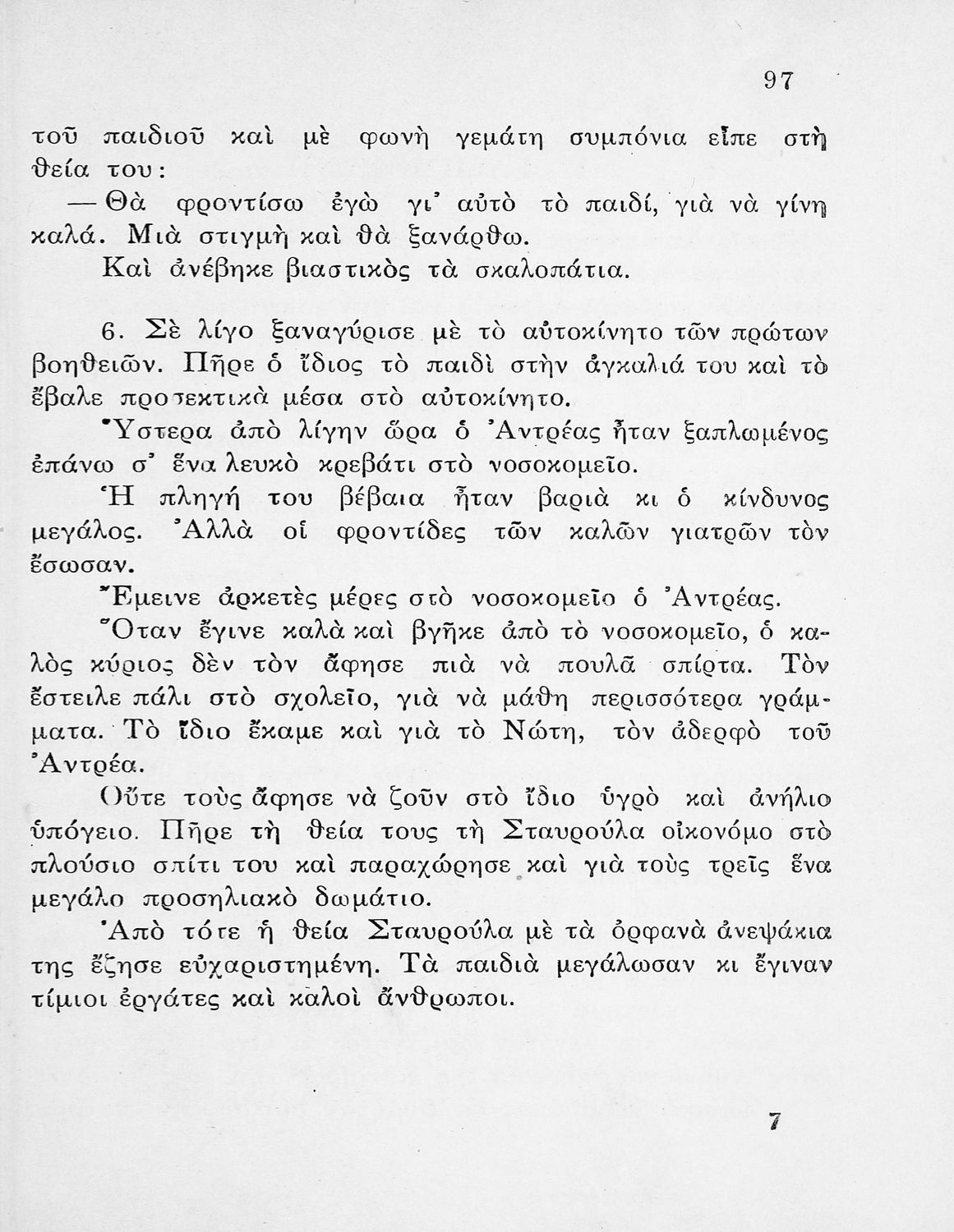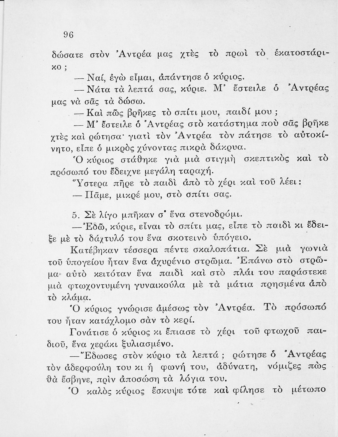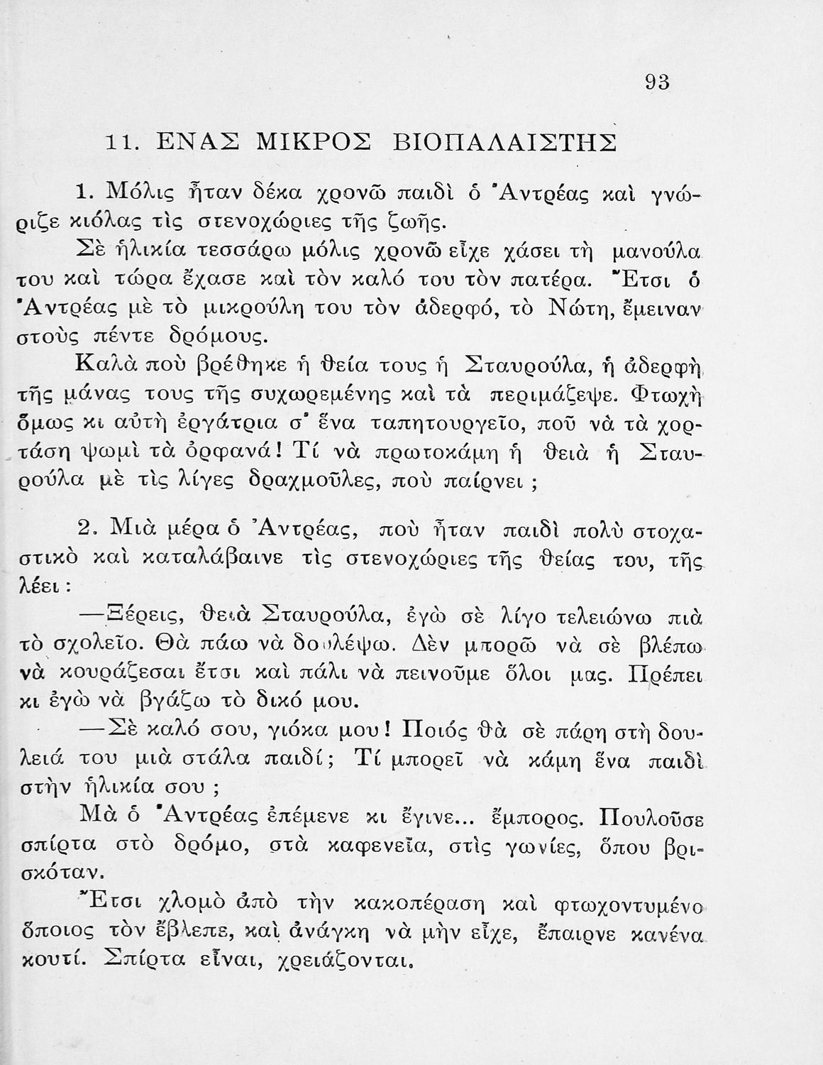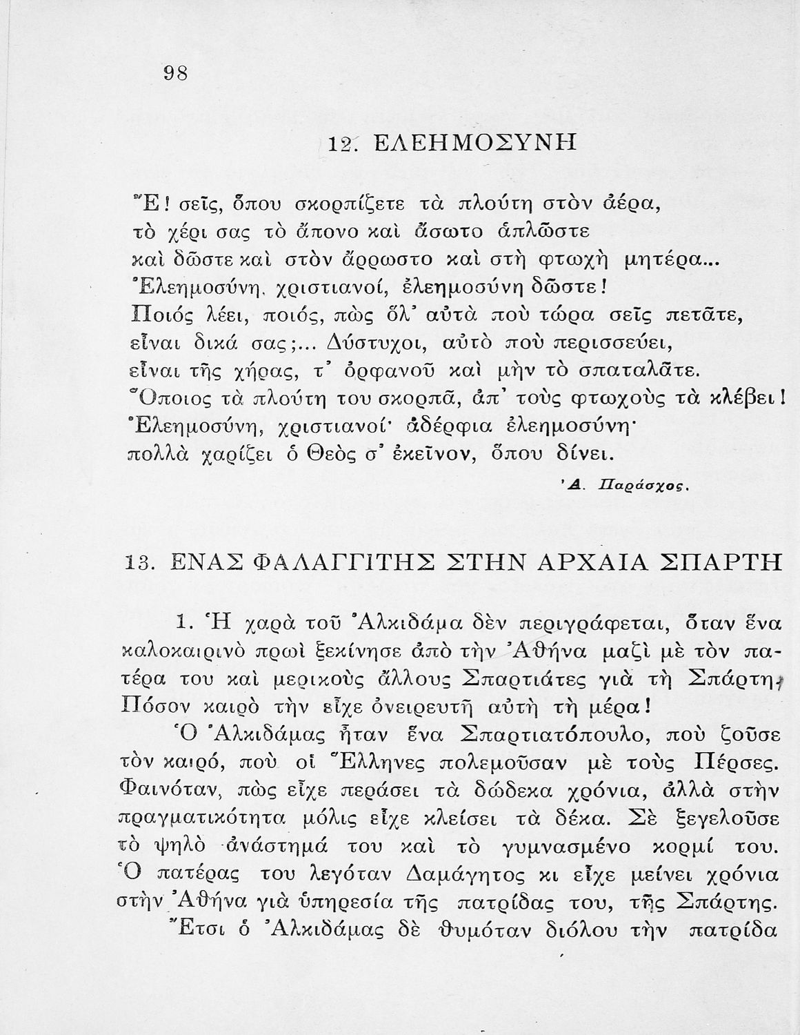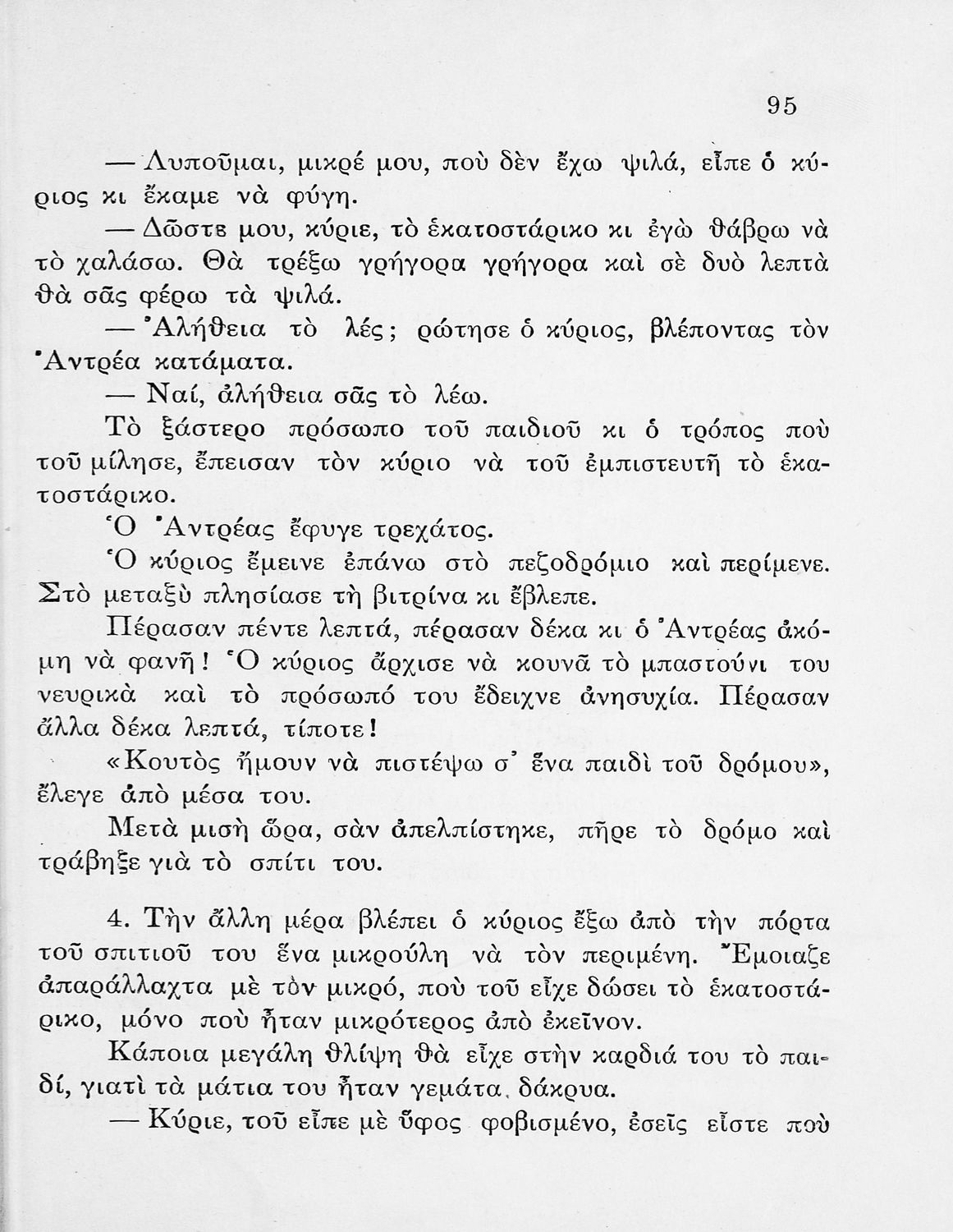 Αναγνωστικό Δ΄ Δημοτικού που περιλαμβάνει θέματα από την θρησκευτική, οικογενειακή και σχολική ζωή του παιδιού, την ελληνική μυθολογία και ιστορία και τη ζωή των ζώων.