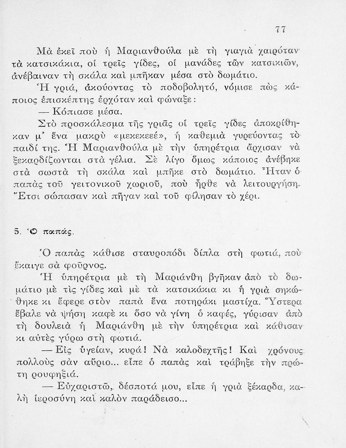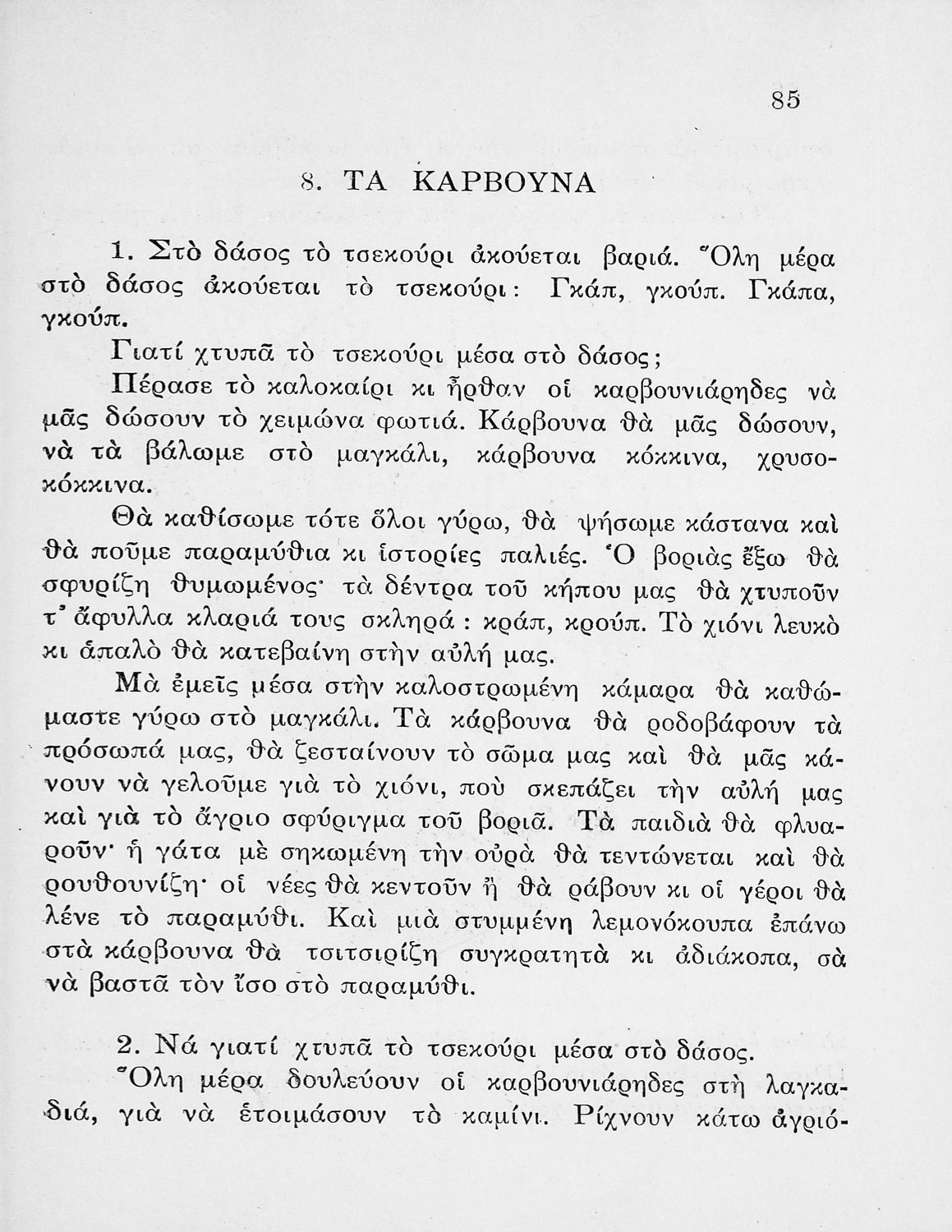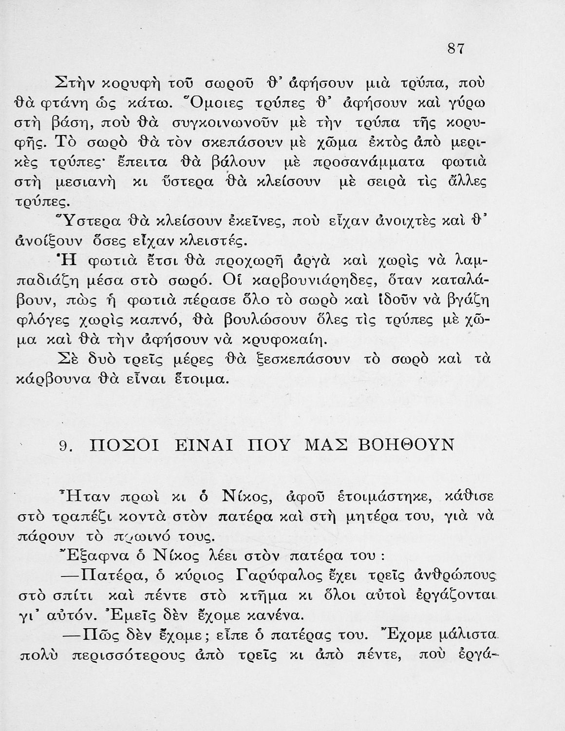 Αναγνωστικό Δ΄ Δημοτικού που περιέχει κείμενα εμπνευσμένα από την ζωή στην ύπαιθρο, την οικογενειακή ζωή, την αγάπη για τα ζώα, τη θρησκευτική παράδοση, την κοινωνική ζωή, την εθνική ζωή και προσήλωση στα εθνικά σύμβολα. 'Όντας σχολικό βιβλίο του μεταξικού καθεστώτος περιέχει χαρακτηριστικά δείγματα της μεταξικής προπαγάνδας και λογικής που παρουσιάζουν τον Ι. Μεταξά, ως μάγο, αρχηγό και κυβερνήτη της Ελλάδας. Όπως όλα τα βιβλία του καθεστώτος φέρει τη ρήση του Μεταξά "Είστε Ελληνόπουλα και είναι μεγάλο πράγμα να είναι κανείς Έλλην".