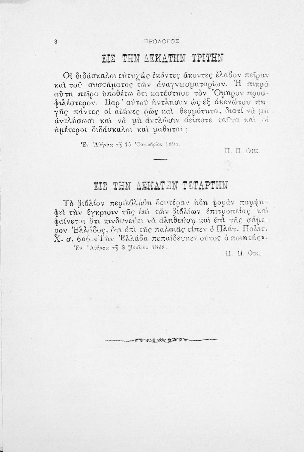 Αναγνωστικό Δημοτικού που περιλαμβάνει διηγήματα εμπνευσμένα από τον Τρωικό Πόλεμο και αποσκοπεί να διδάξει στους ελληνόπαιδες "ότι προς ταις αρεταίς της ειρήνης υπάρχουσι και αρεταίς του πολέμου, η αρετή της πειθαρχίας και του ξίφους".