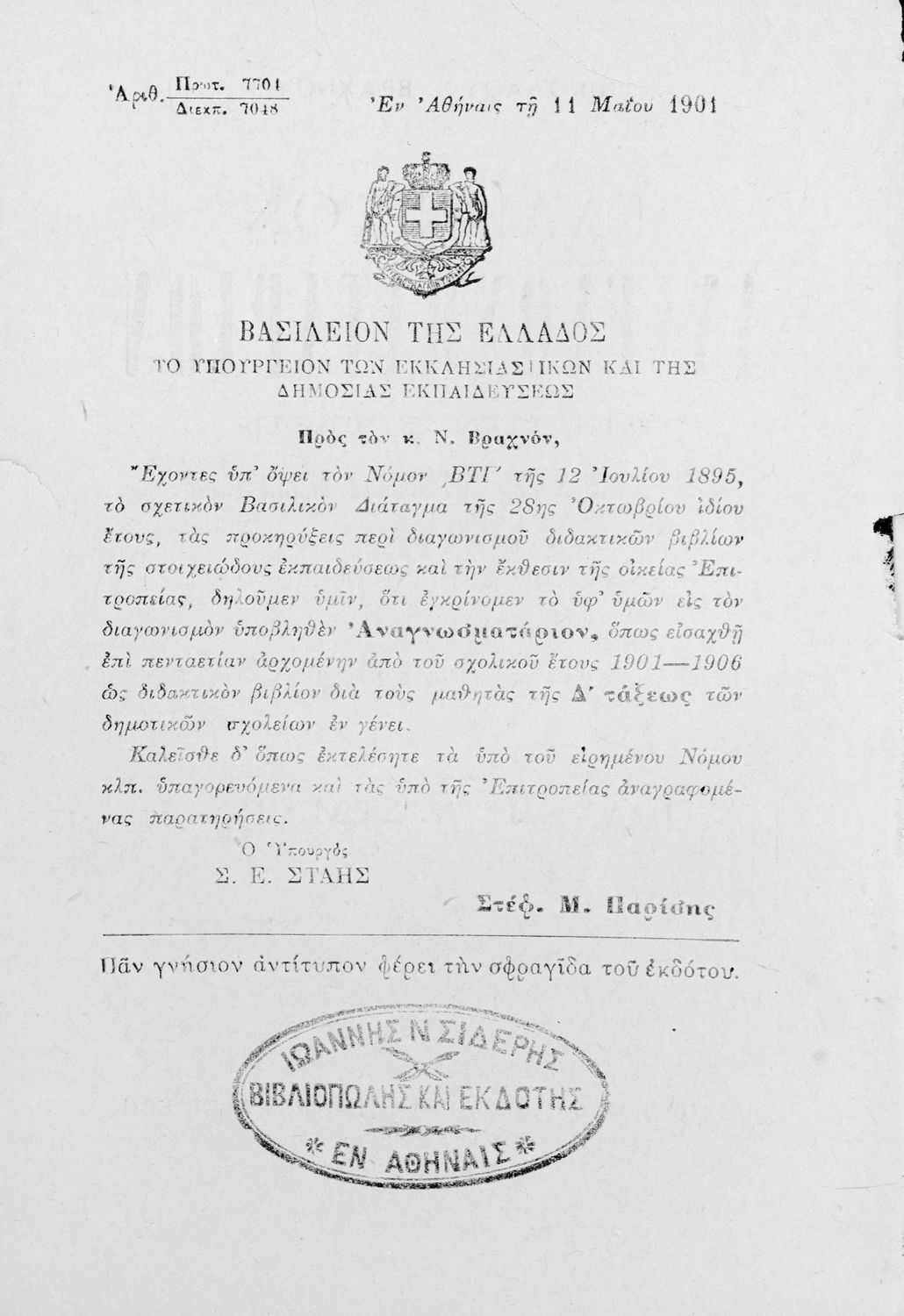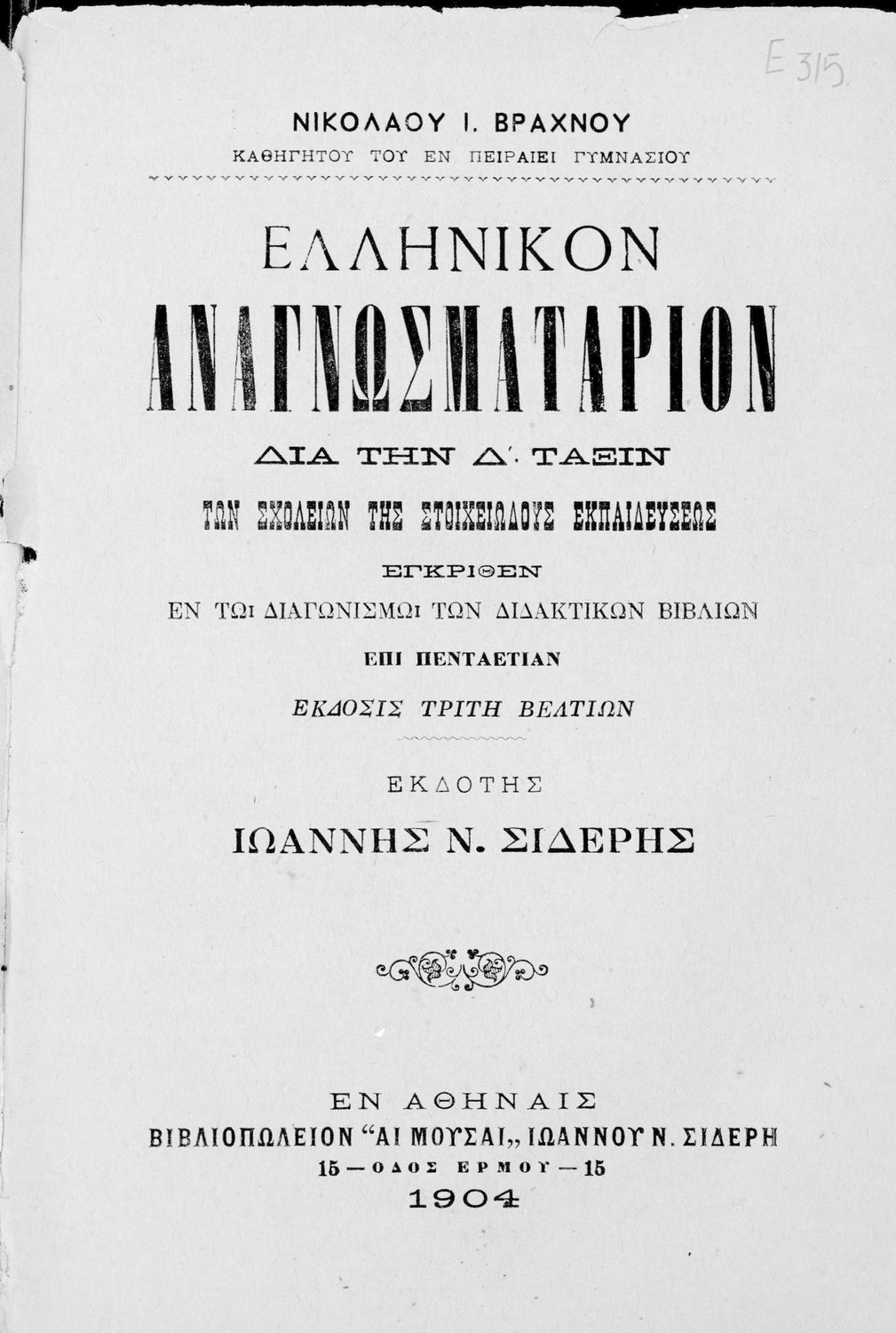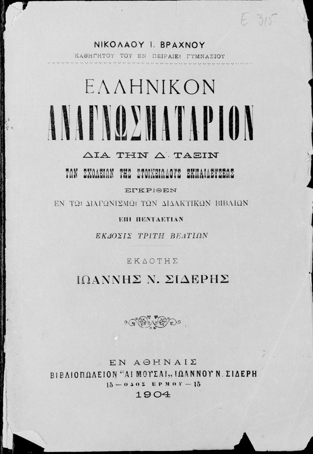 Τίτλος: Ελληνικόν αναγνωσματάριον διά την Δ΄ τάξιν των σχολείων της Στοιχειώδους Εκπαιδεύσεως