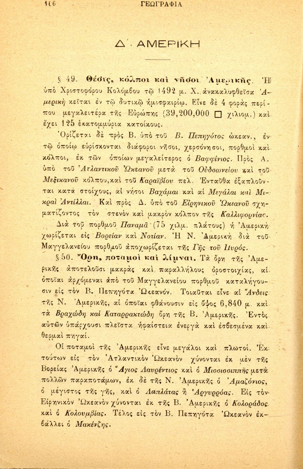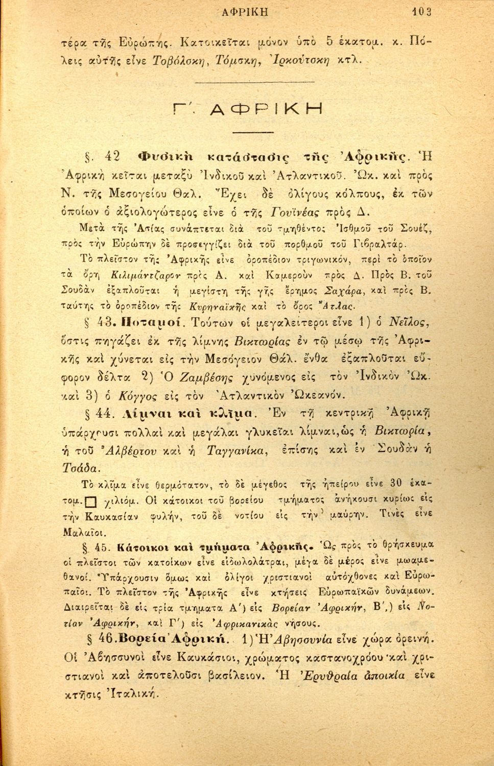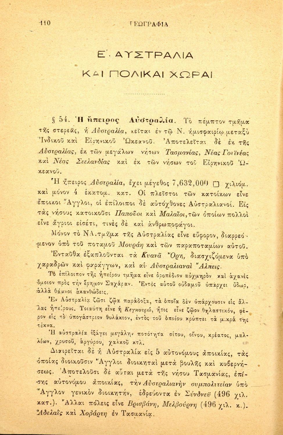 Σχολικό εγχειρίδιο Γεωγραφίας για τα Δημοτικά και τα Παρθεναγωγεία που αναλύει τη γεωμορφολογία της Γης και παρουσιάζει, διεξοδικά, κάποιους από τους νομούς της Ελλάδας και, συνοπτικά, τα γενικά χαρακτηριστικά των 5 ηπείρων.
