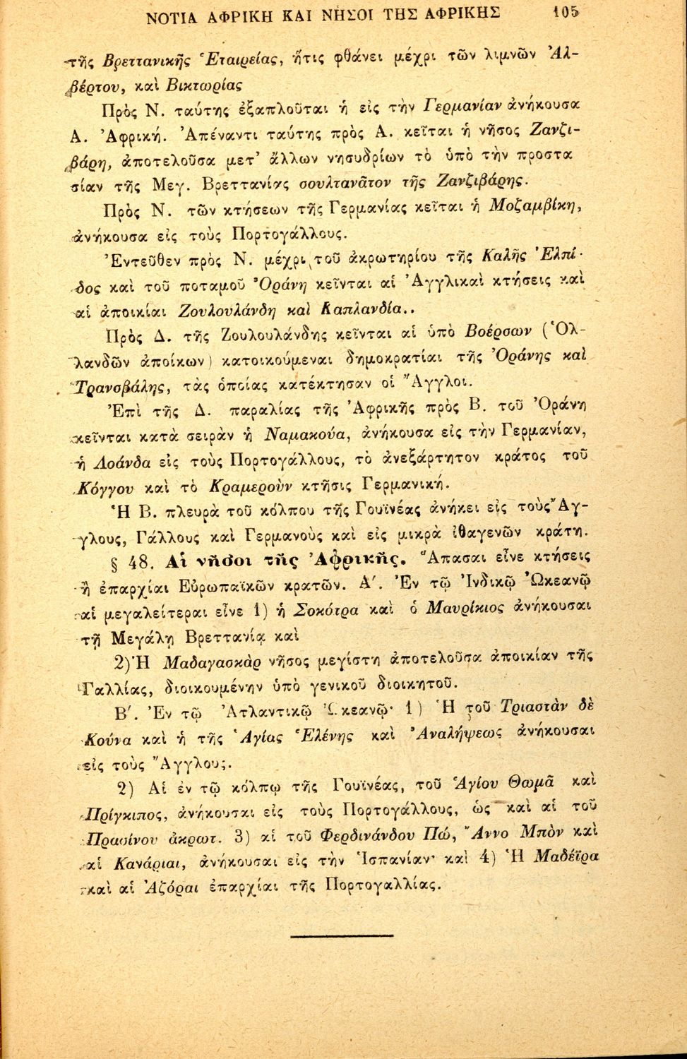 Σχολικό εγχειρίδιο Γεωγραφίας για τα Παρθεναγωγεία και τα Ελληνικά Σχολεία που περιλαμβάνει εισαγωγή στη φυσική, μαθηματική και πολιτική γεωγραφία και εξετάζει την Ελλάδα και ενδεικτικές χώρες και περιοχές από