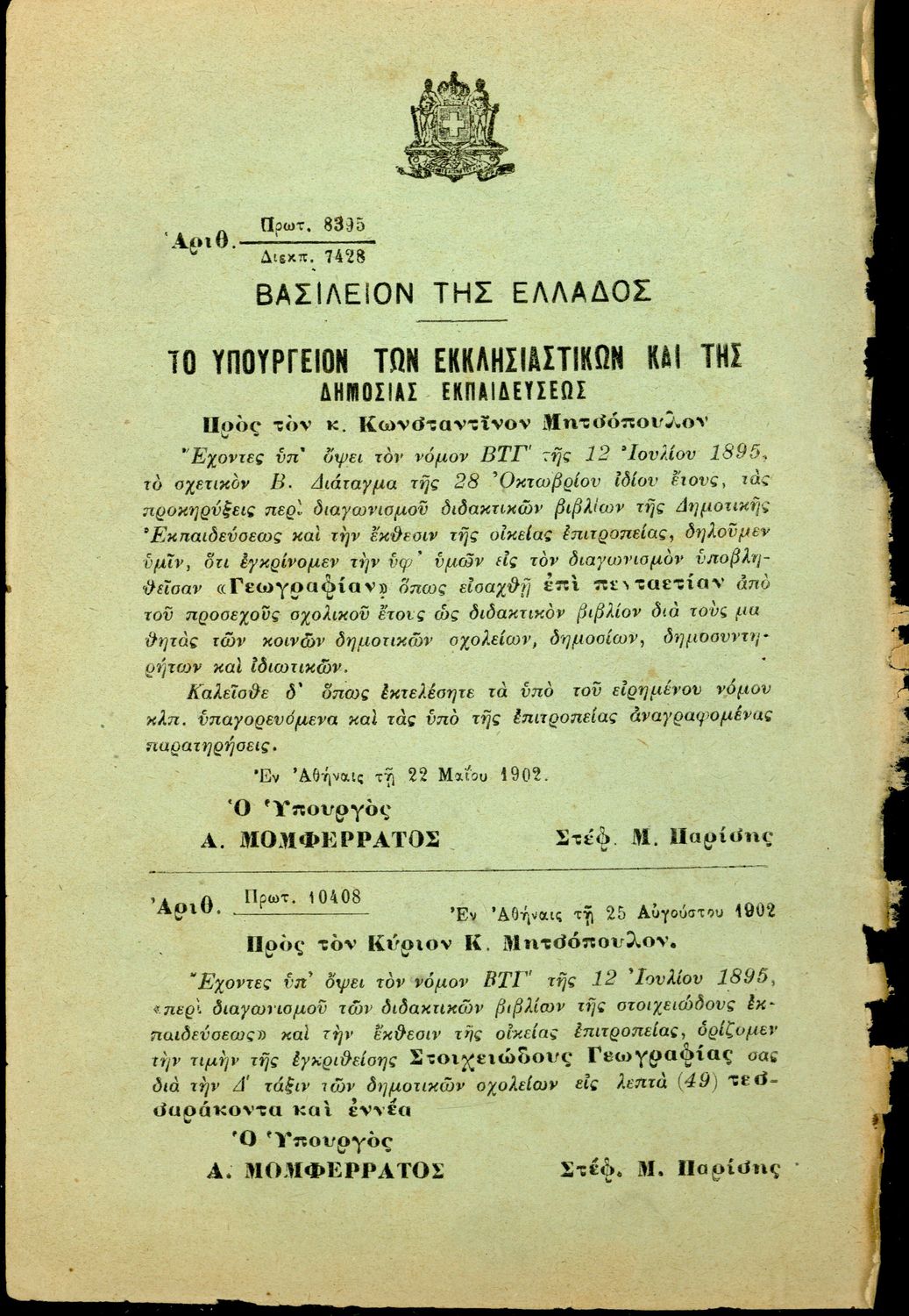 Υπουργική απόφαση / Σύμβαση: 10408/25-8-1902