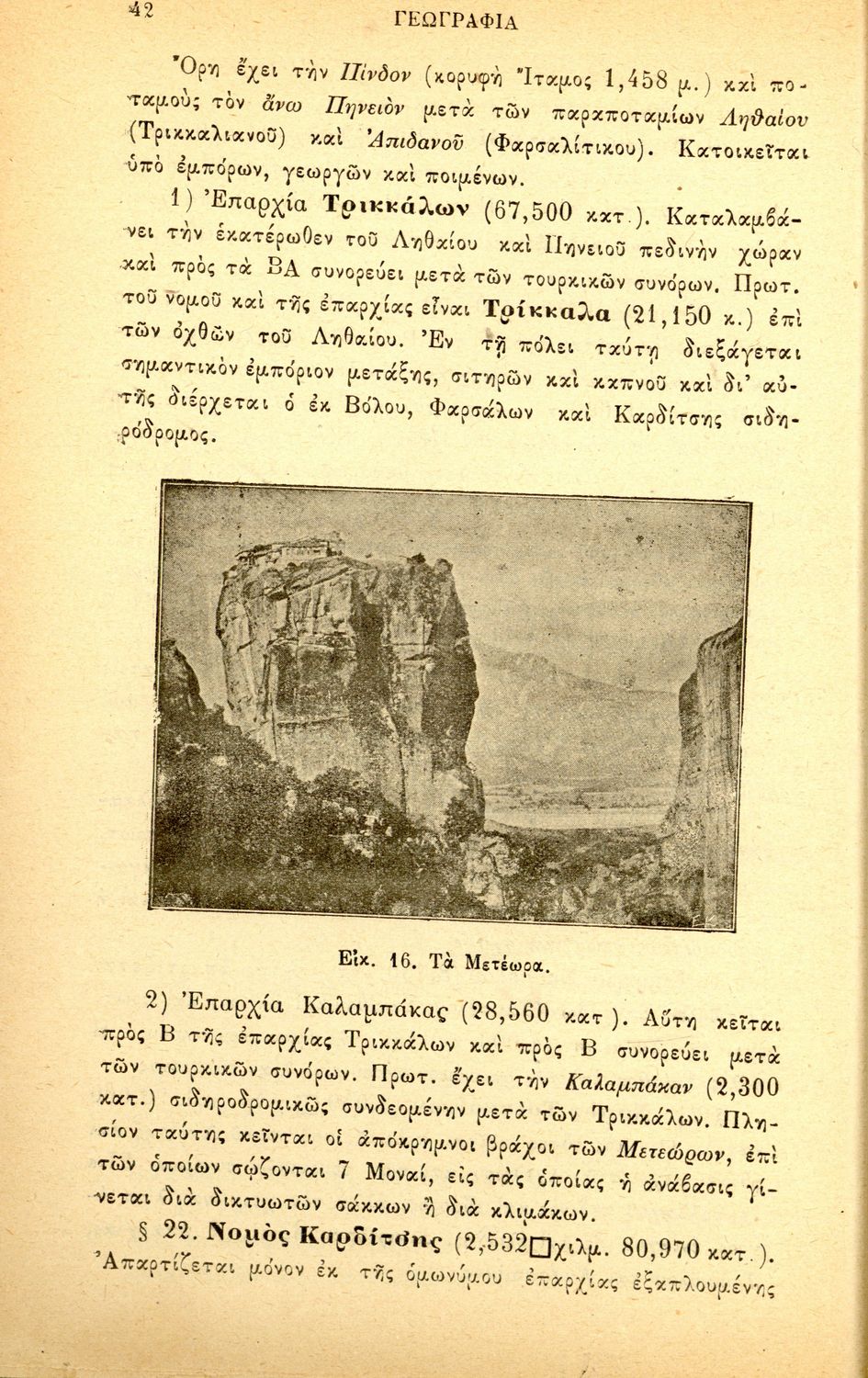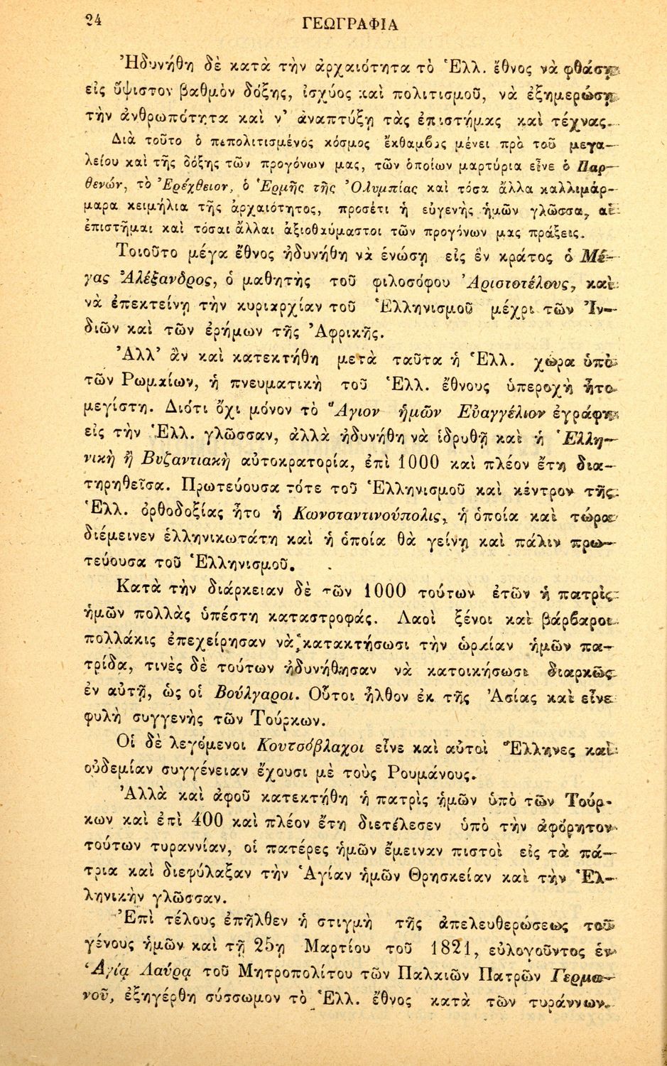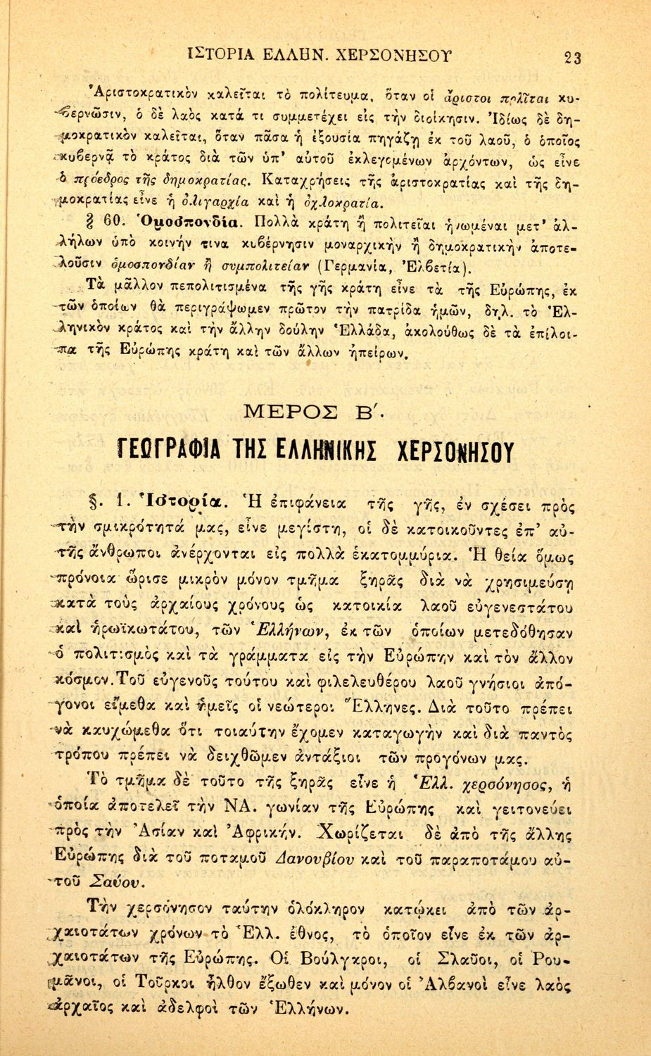 Σχολικό εγχειρίδιο Γεωγραφίας για τα Δημοτικά και τα Παρθεναγωγεία που αναλύει τη γεωμορφολογία της Γης και παρουσιάζει, διεξοδικά, κάποιους από τους νομούς της Ελλάδας και, συνοπτικά, τα γενικά χαρακτηριστικά των 5 ηπείρων.