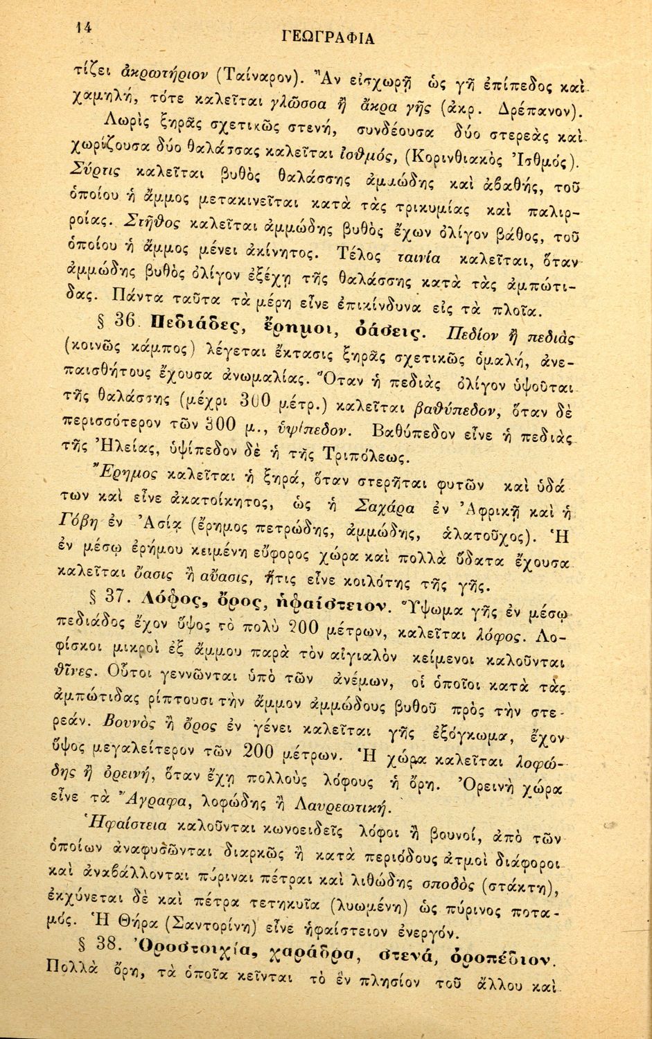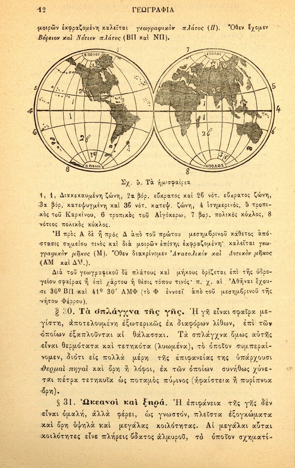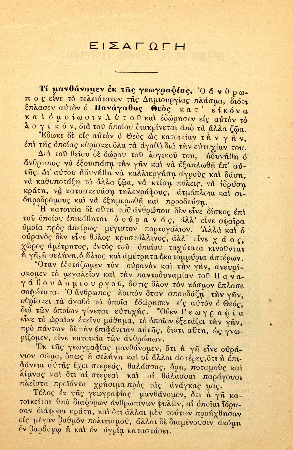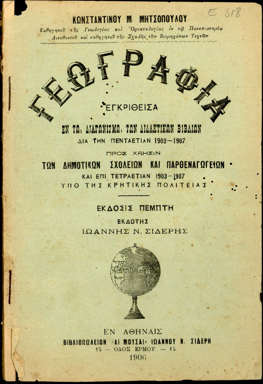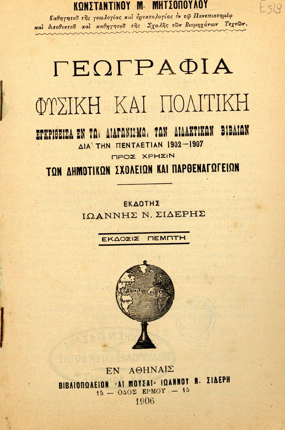 Σχολικό εγχειρίδιο Γεωγραφίας για τα Δημοτικά και τα Παρθεναγωγεία που αναλύει τη γεωμορφολογία της Γης και παρουσιάζει, διεξοδικά, κάποιους από τους νομούς της Ελλάδας και, συνοπτικά, τα γενικά χαρακτηριστικά των 5 ηπείρων.