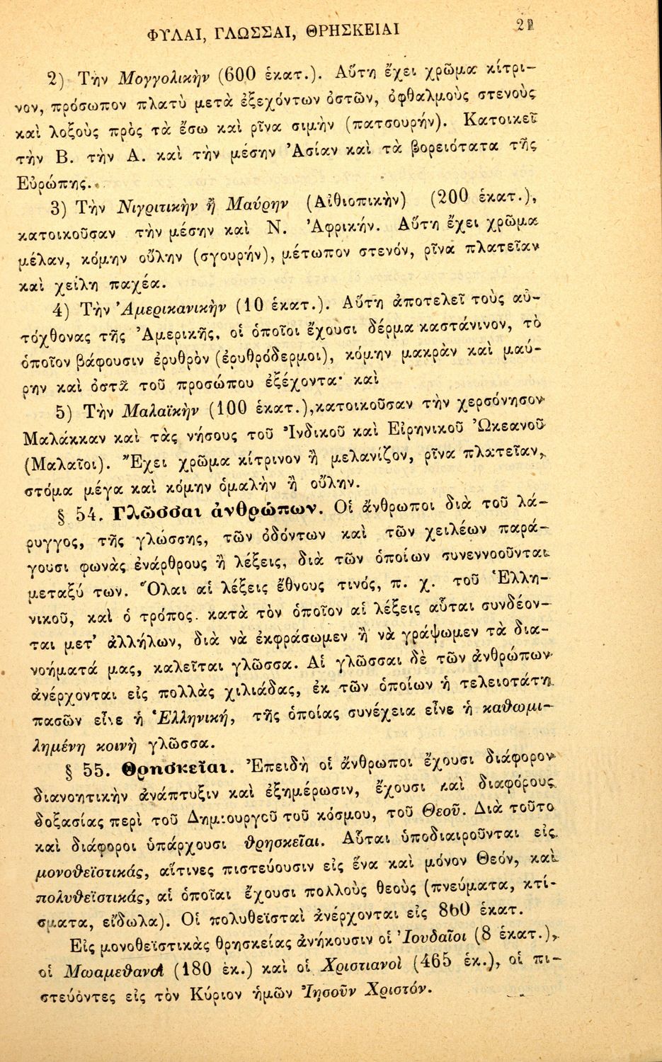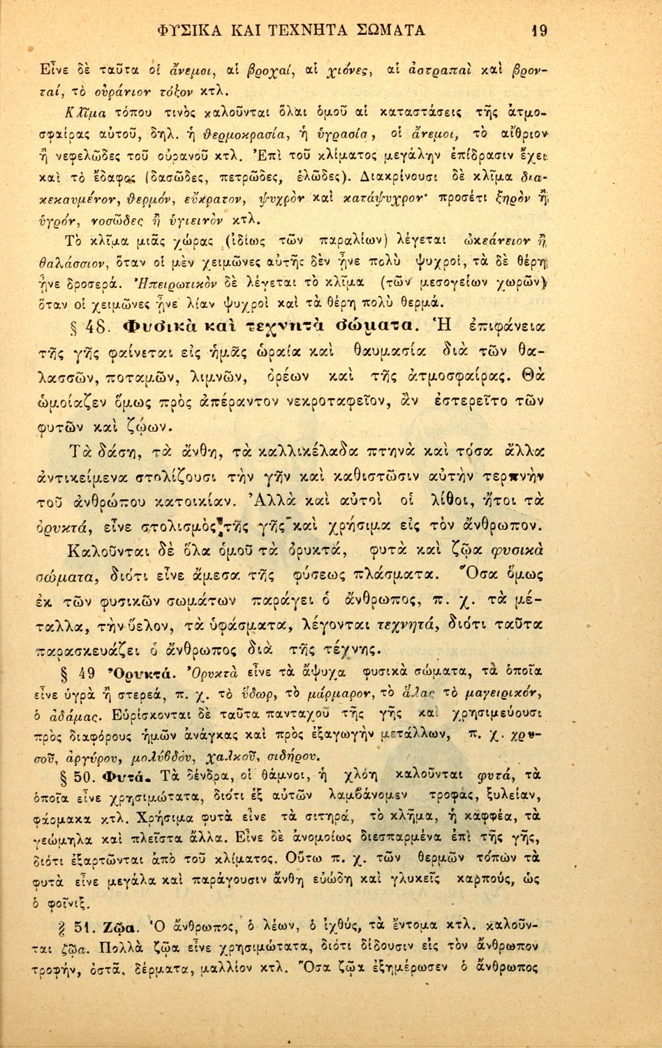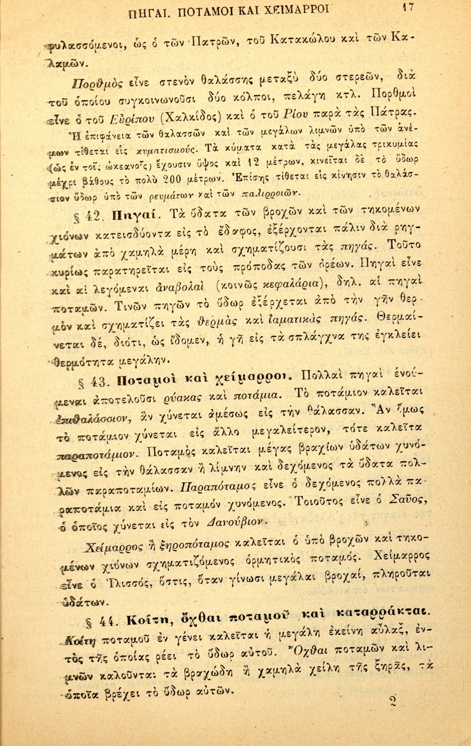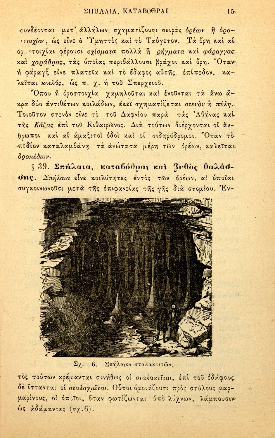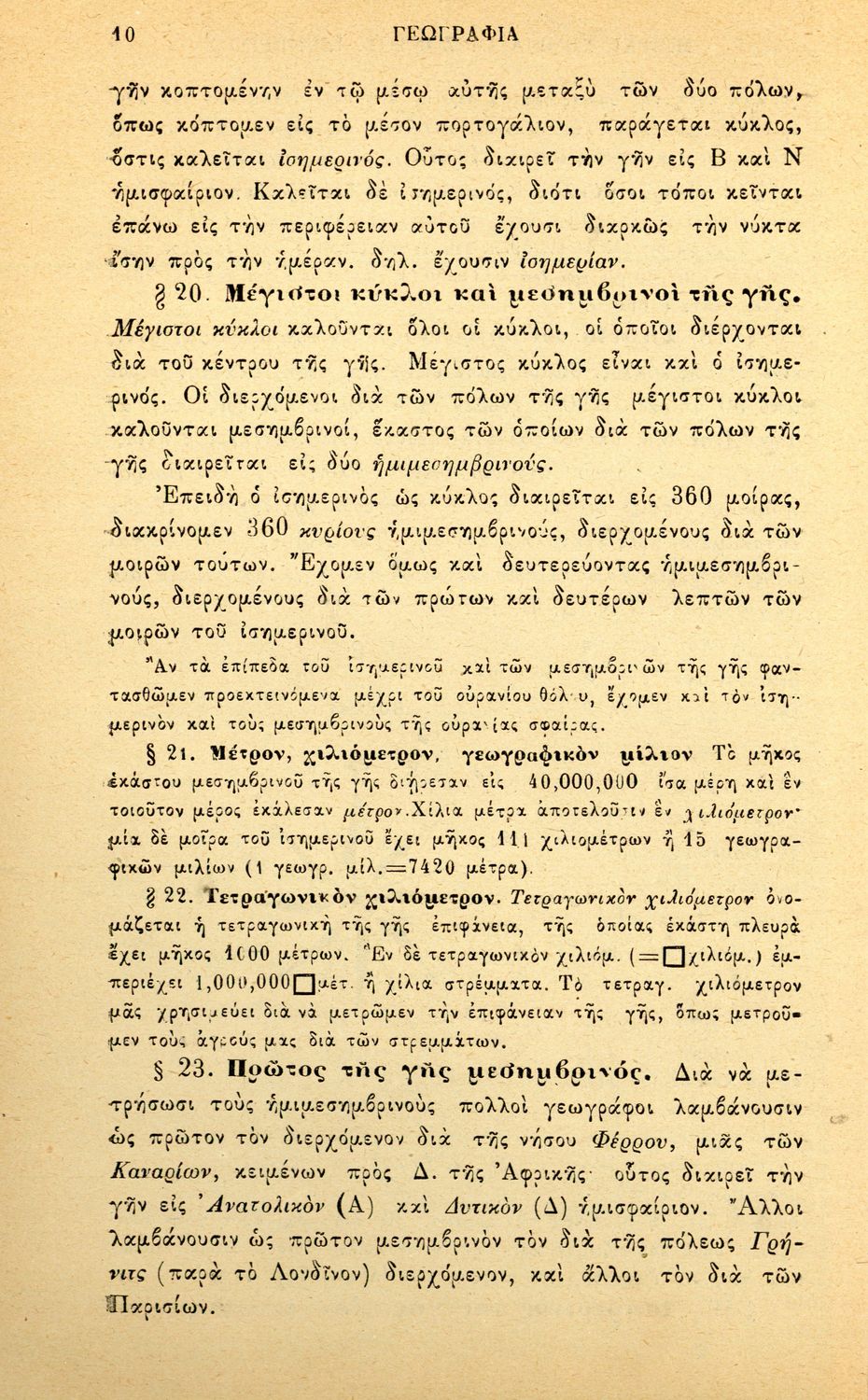 Σχολικό εγχειρίδιο Γεωγραφίας για τα Δημοτικά και τα Παρθεναγωγεία που αναλύει τη γεωμορφολογία της Γης και παρουσιάζει, διεξοδικά, κάποιους από τους νομούς της Ελλάδας και, συνοπτικά, τα γενικά χαρακτηριστικά των 5 ηπείρων.