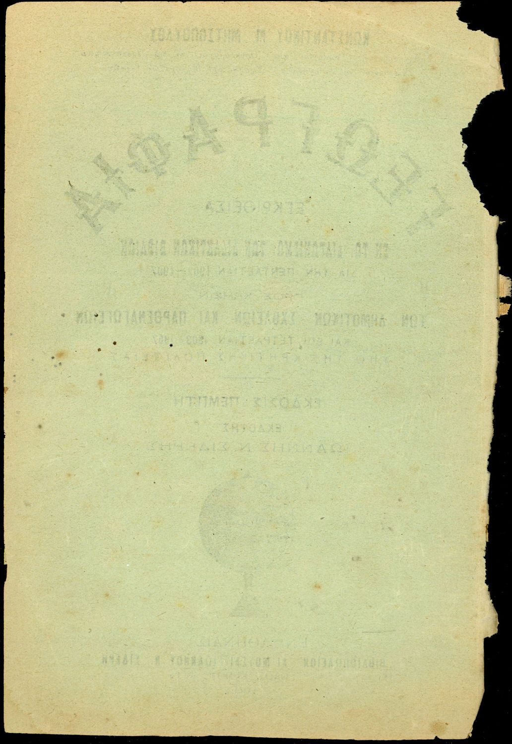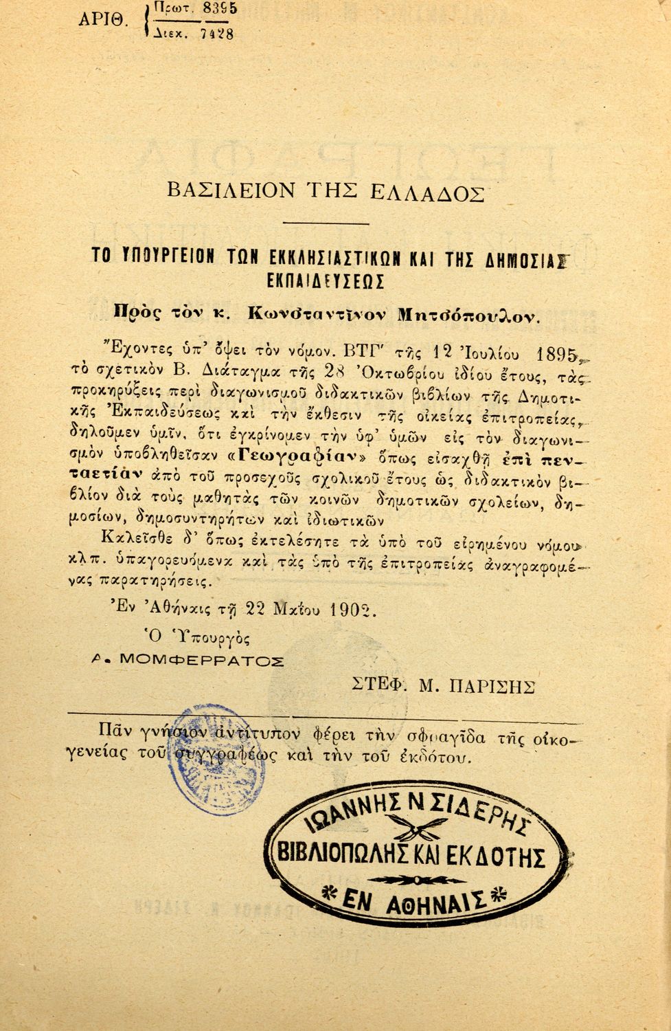 Εκδότης: Ιωάννης Ν. Σιδέρης Έτος έκδοσης: 1906 Τόπος έκδοσης: Αθήνα Έκδοση: 5η Υπουργική απόφαση / Σύμβαση: 10408/25-8-1902 Έτος έγκρισης: 1902 |