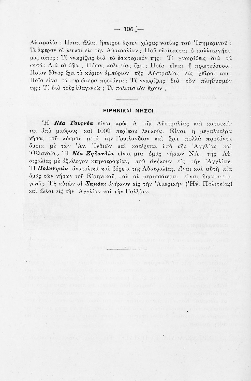 Κωδικός αναγνώρισης: 20-E0321 Τίτλος: Νέα γεωγραφία, αι ήπειροι (εκτός Ευρώπης) διά την πέμπτην τάξιν του Δημοτικού και το Α΄ έτος συνδιδασκαλίας Ε΄ και ΣΤ΄ Συγγραφέας: Νικολ. Παπασπύρου Μέγεθος και υπόστρωμα: Σχολικό εγχειρίδιο, 22εκ., μαλακό εξώφυλλο, 112 σελίδες. Σκίτσα (ασπρόμαυρα). |