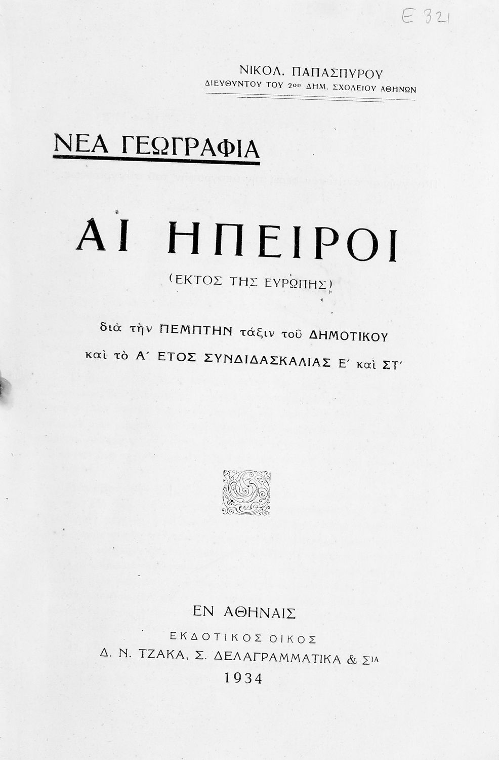 Τίτλος: Νέα γεωγραφία, αι ήπειροι (εκτός Ευρώπης) διά την πέμπτην τάξιν του Δημοτικού και το Α΄ έτος συνδιδασκαλίας Ε΄ και ΣΤ΄