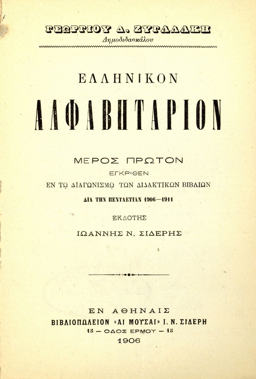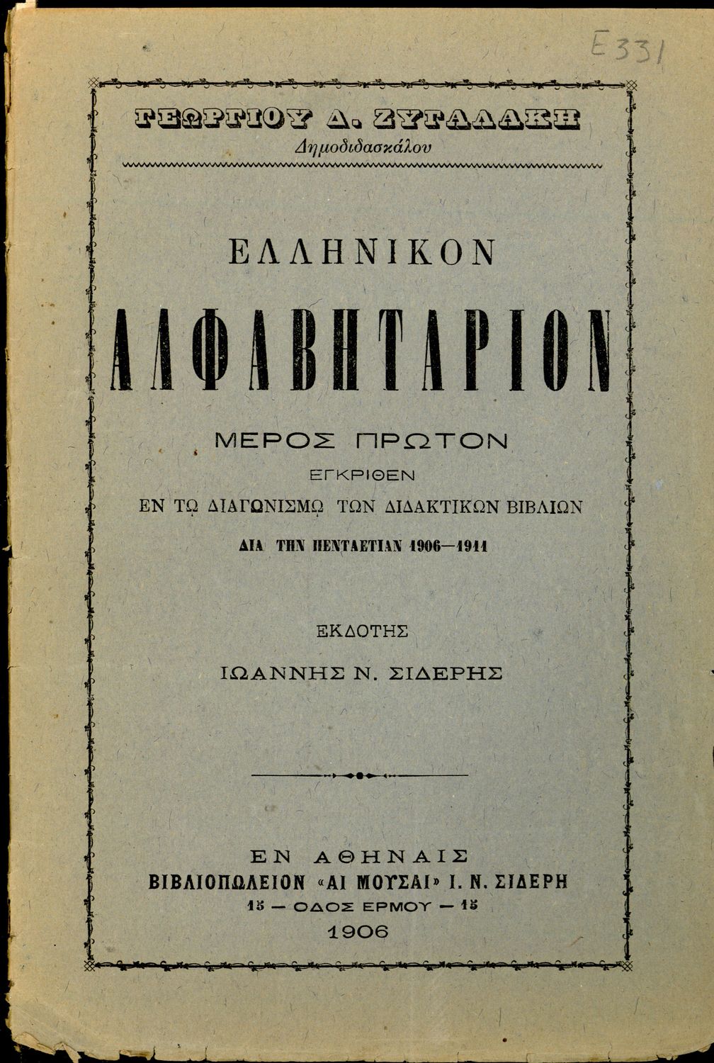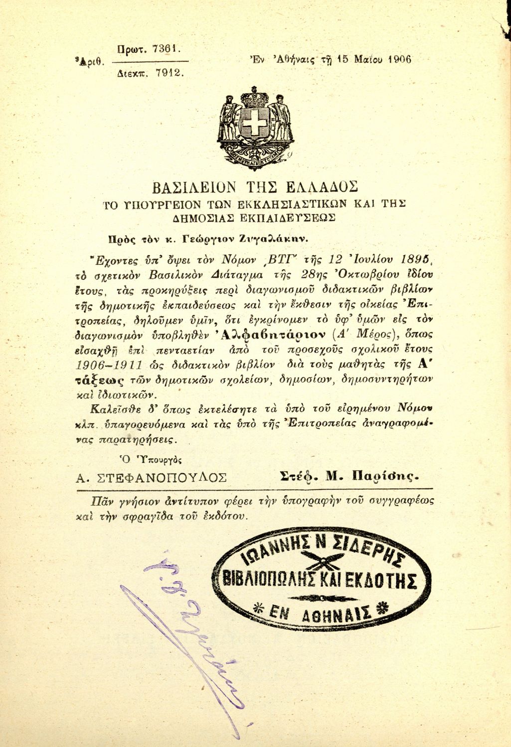 Εκδότης: Ιωάννης Ν. Σιδέρης Έτος έκδοσης: 1906 Τόπος έκδοσης: Αθήνα Υπουργική απόφαση / Σύμβαση: 7361/15-5-1906 Έτος έγκρισης: 1906 |