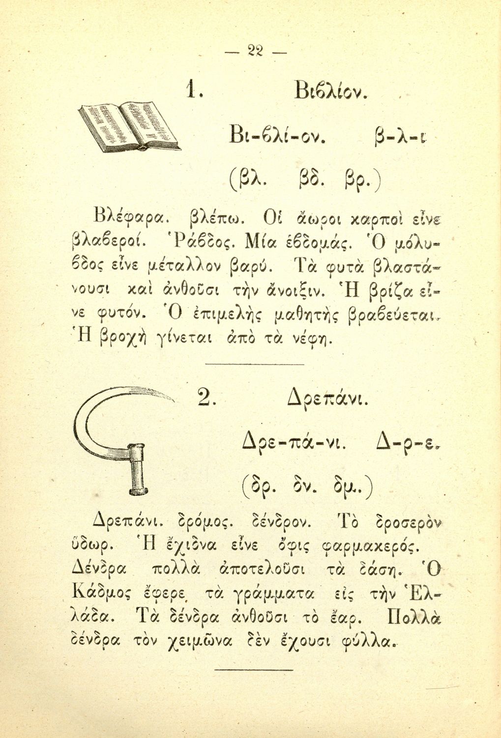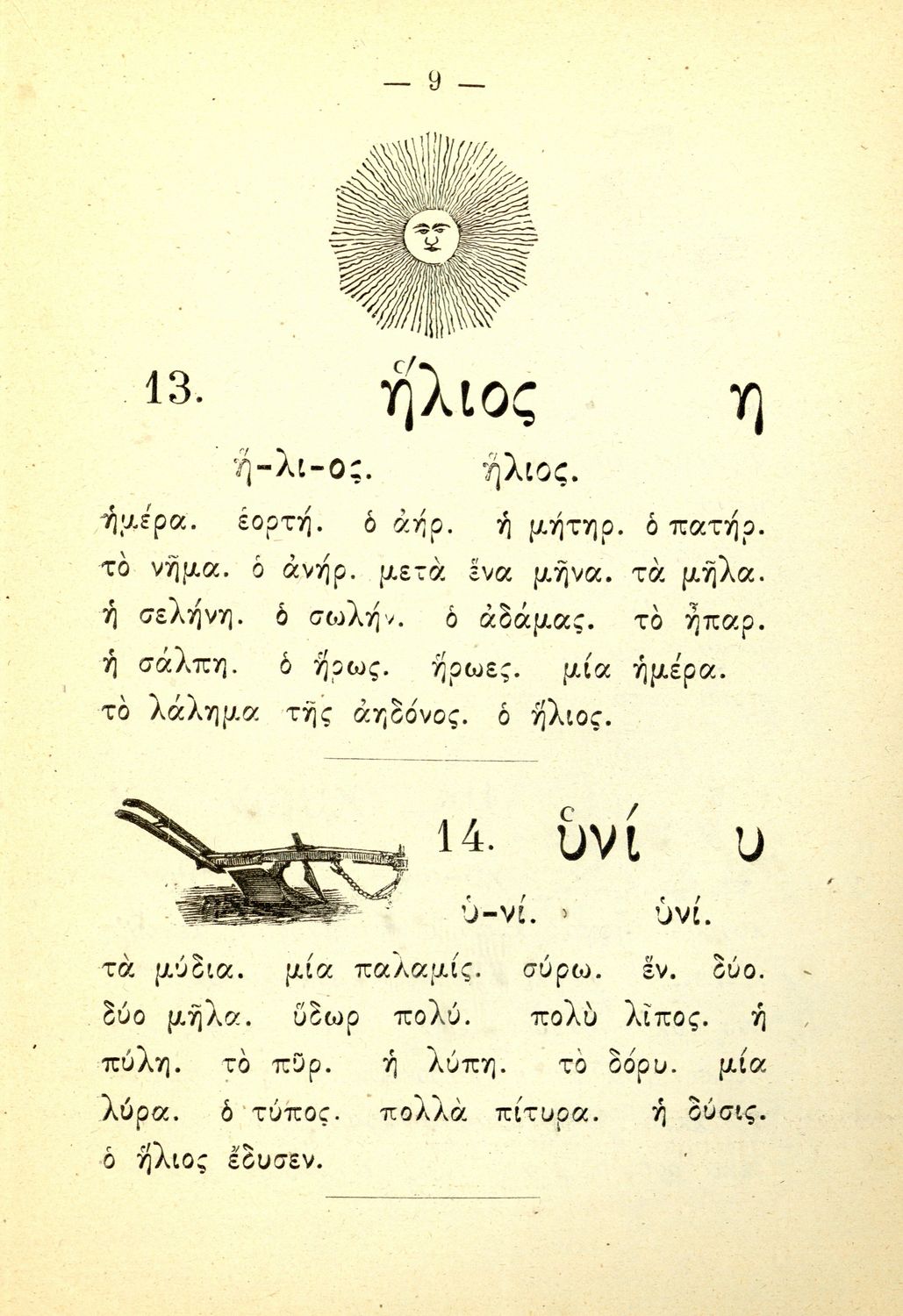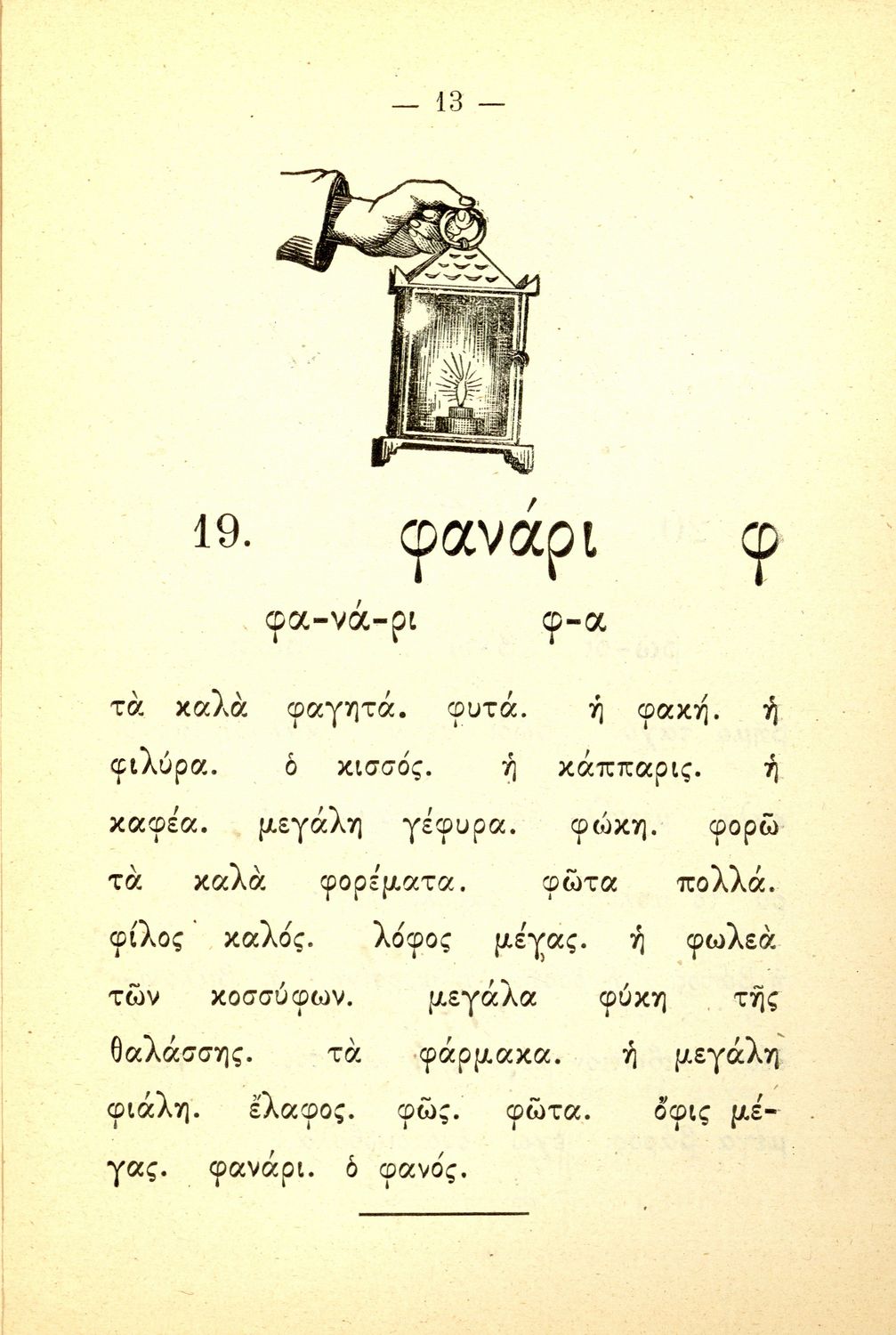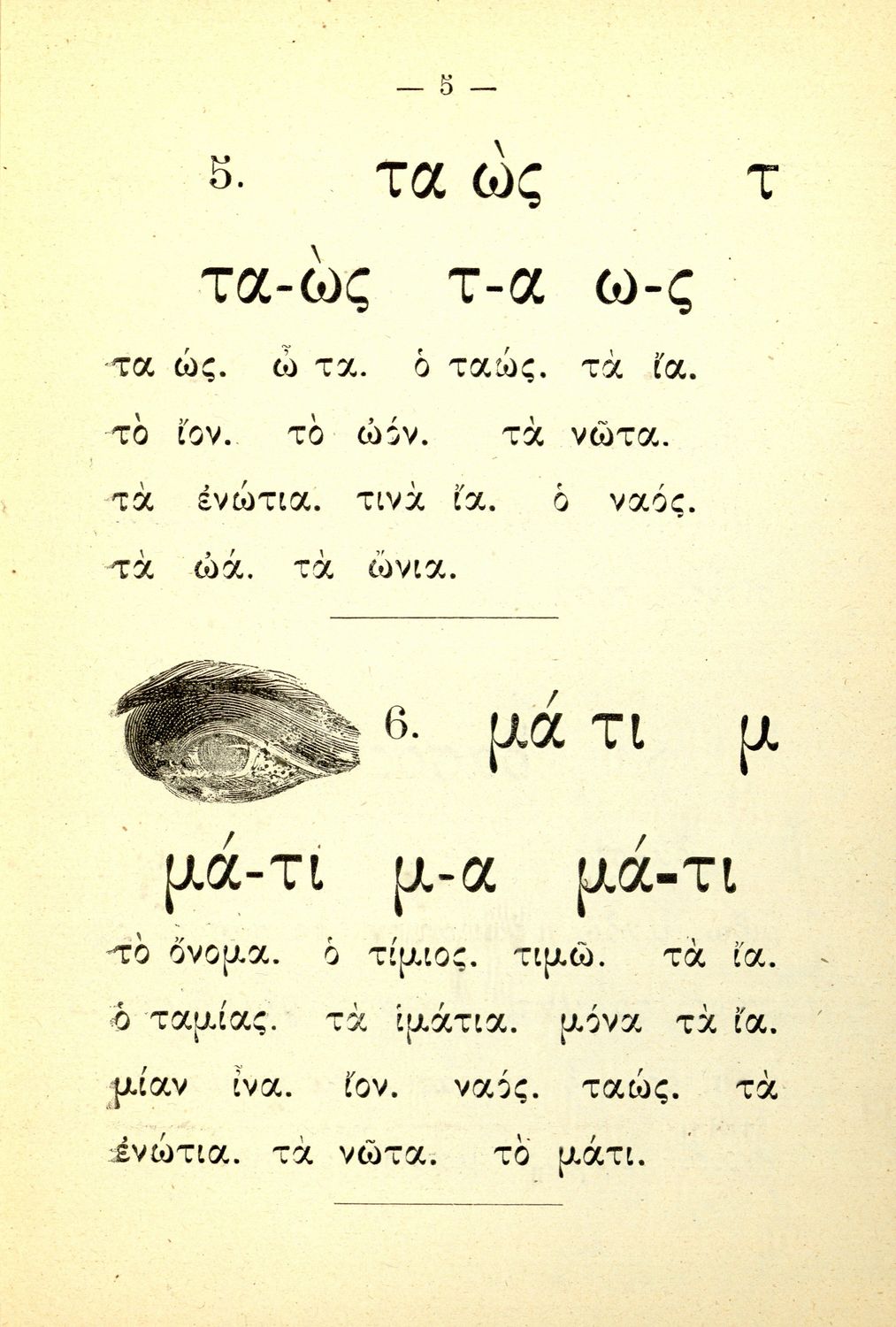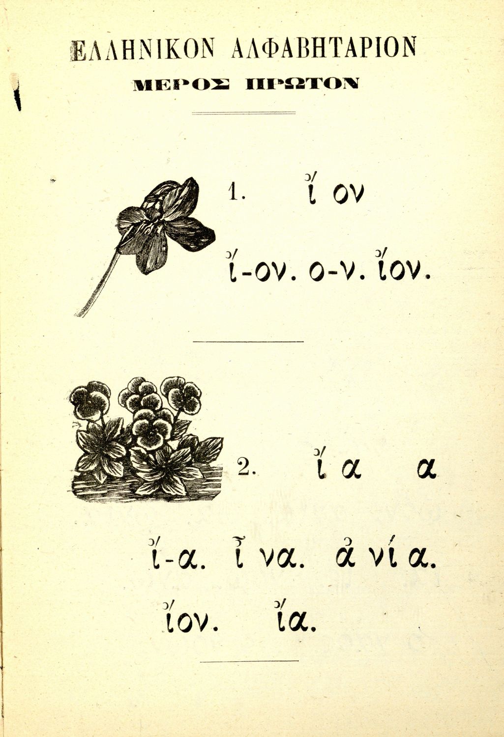 Βαθμίδα εκπαίδευσης: Πρωτοβάθμια Τάξη: Α' Δημοτικού Μάθημα: Νέα Ελληνικά Γλώσσα: Καθαρεύουσα Παρουσίαση περιεχομένου: Αναγνωστικό Α΄ Δημοτικού που περιλαμβάνει το ελληνικό αλφάβητο, εικόνες, συλλαβές και μικρές φράσεις και προτάσεις. |