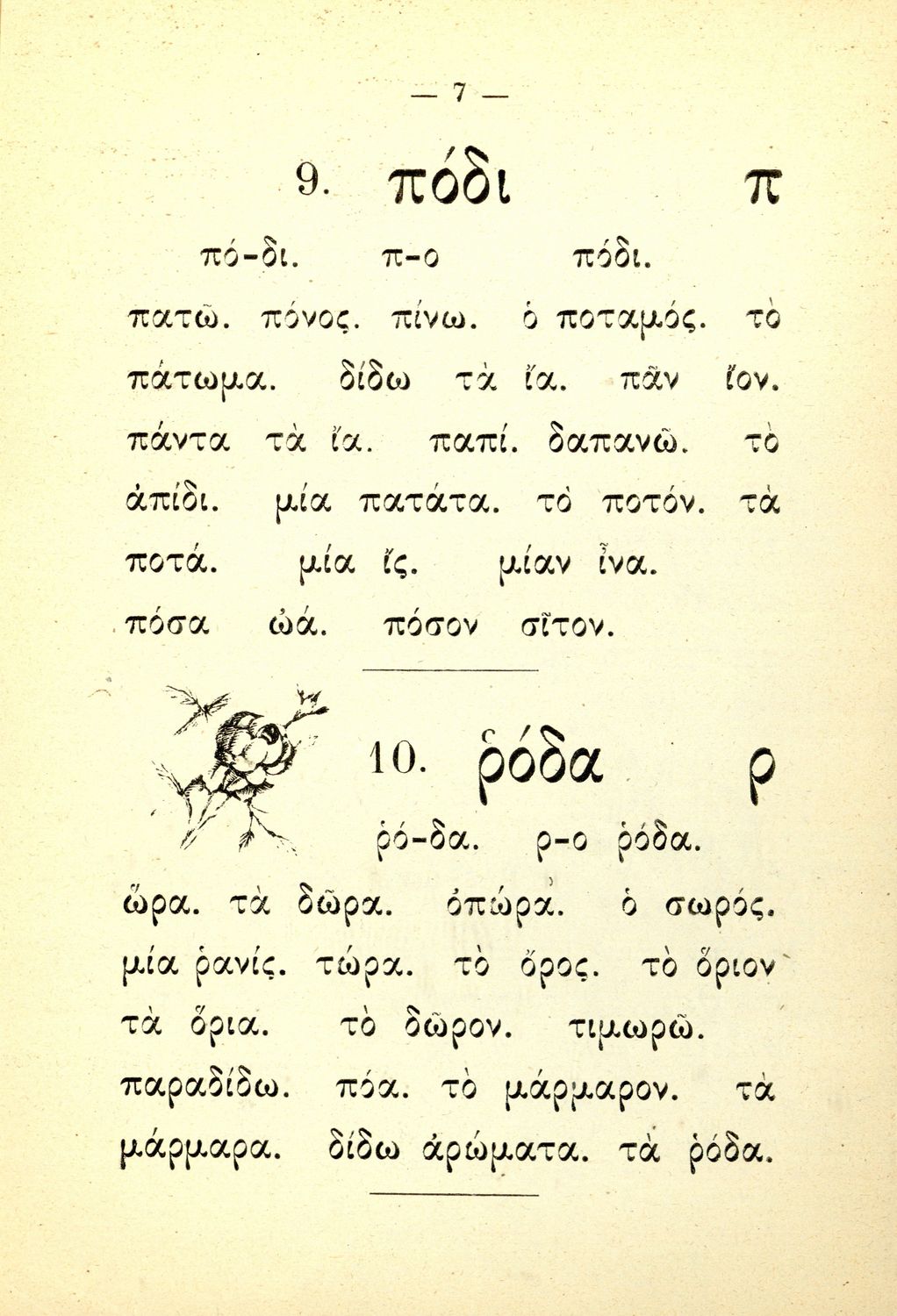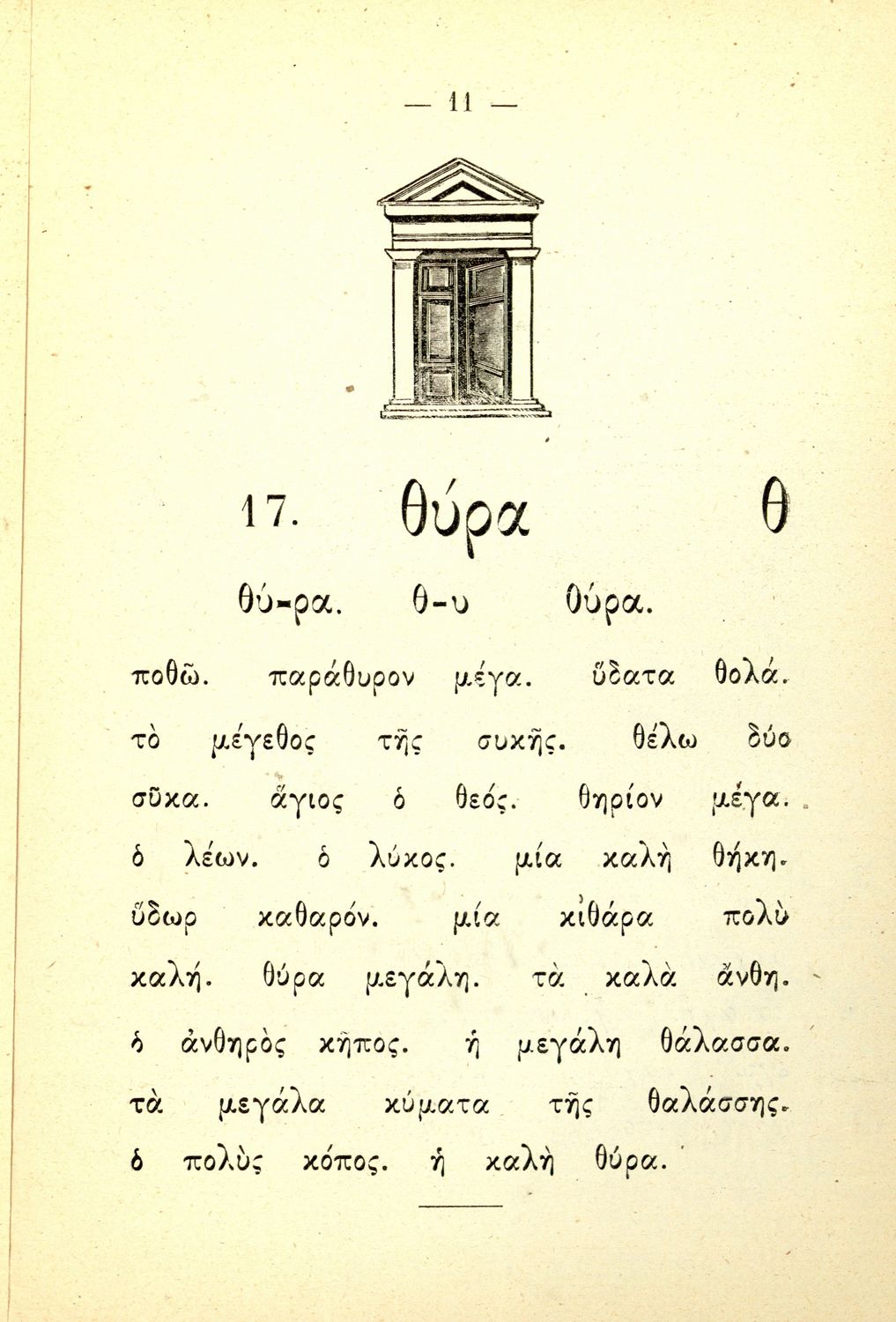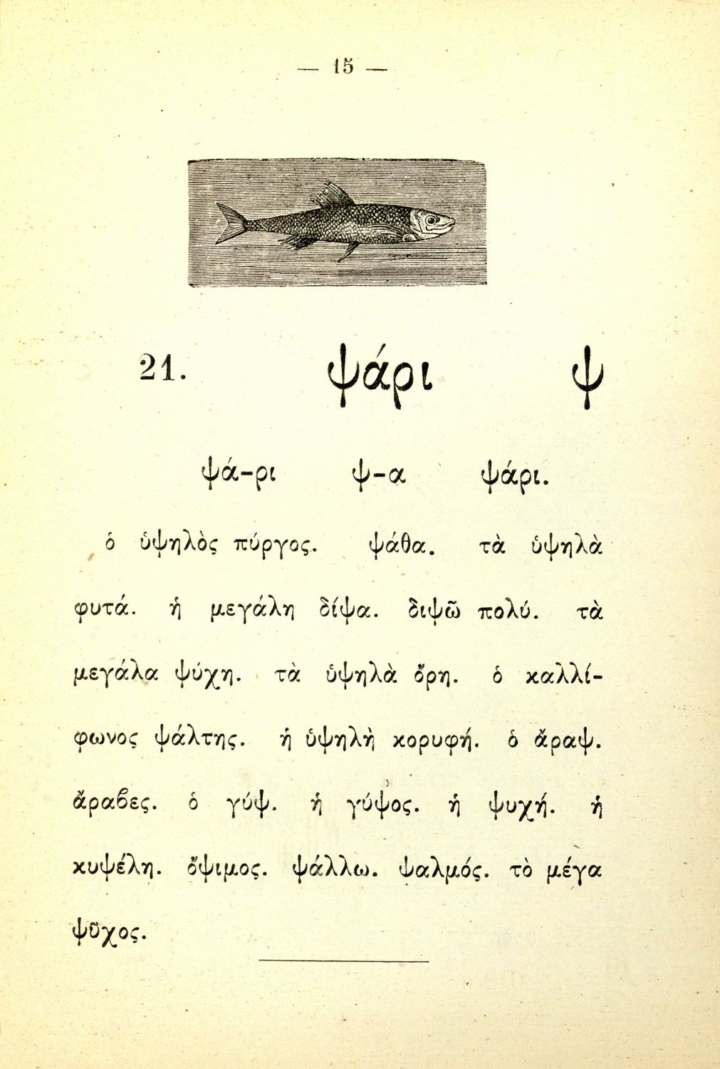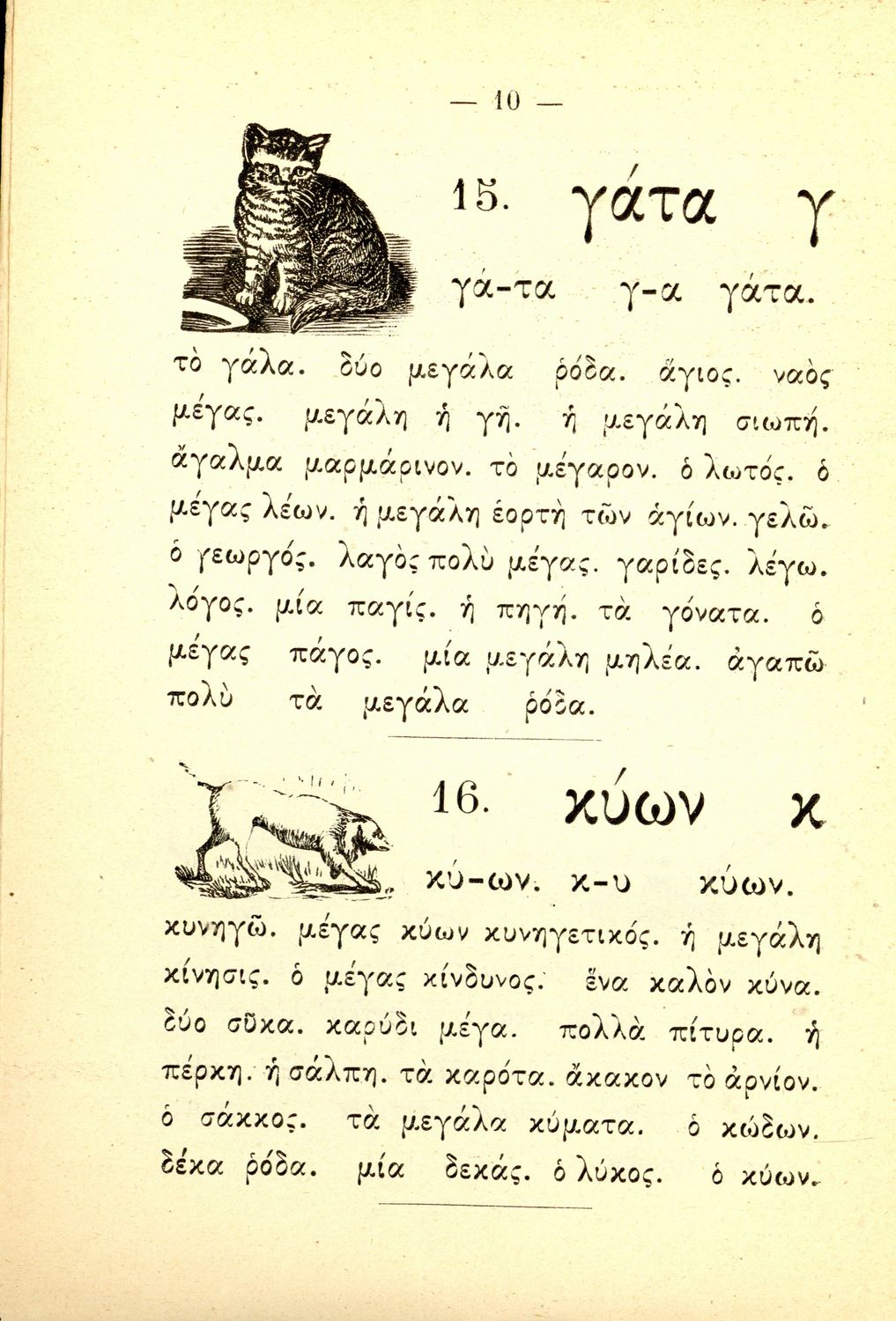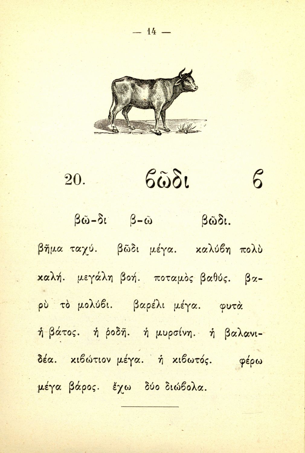 Βαθμίδα εκπαίδευσης: Πρωτοβάθμια Τάξη: Α' Δημοτικού Μάθημα: Νέα Ελληνικά Γλώσσα: Καθαρεύουσα Παρουσίαση περιεχομένου: Αναγνωστικό Α΄ Δημοτικού που περιλαμβάνει το ελληνικό αλφάβητο, εικόνες, συλλαβές και μικρές φράσεις και προτάσεις. |