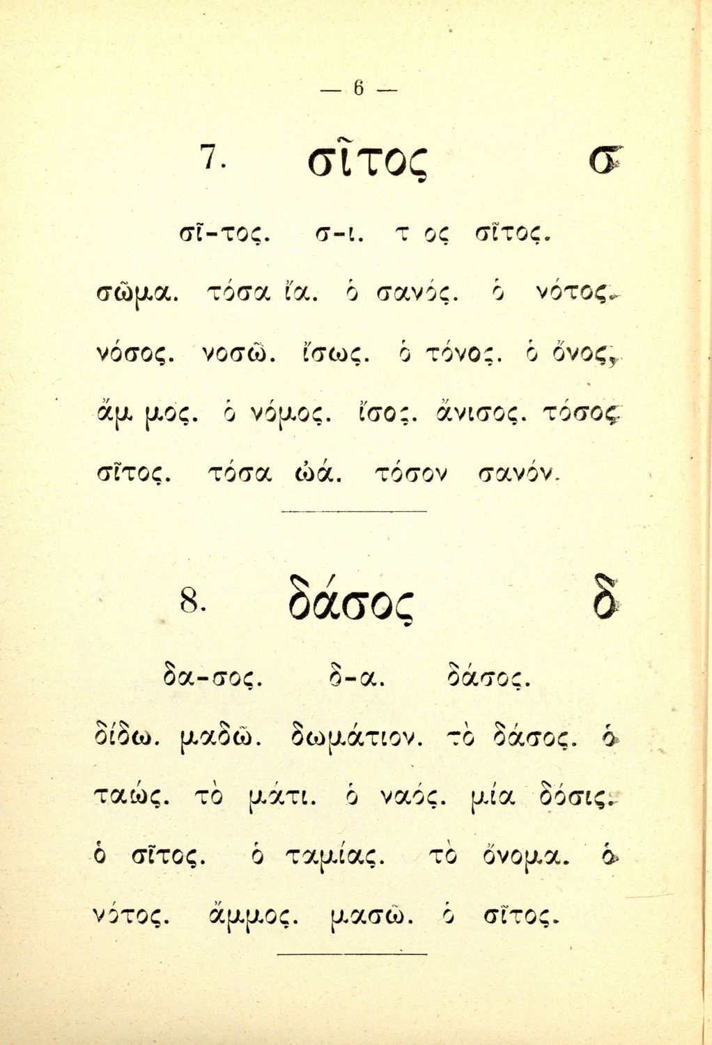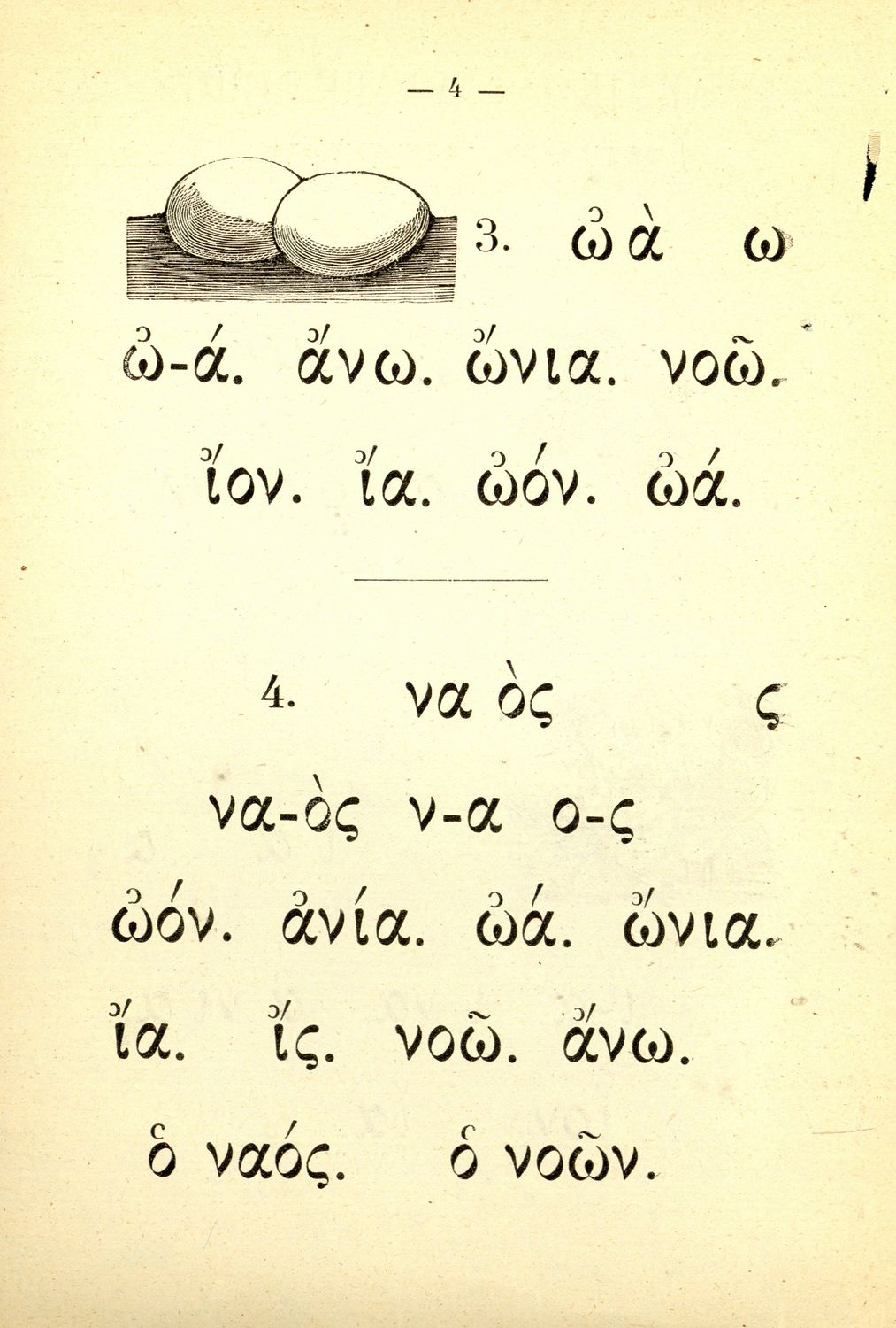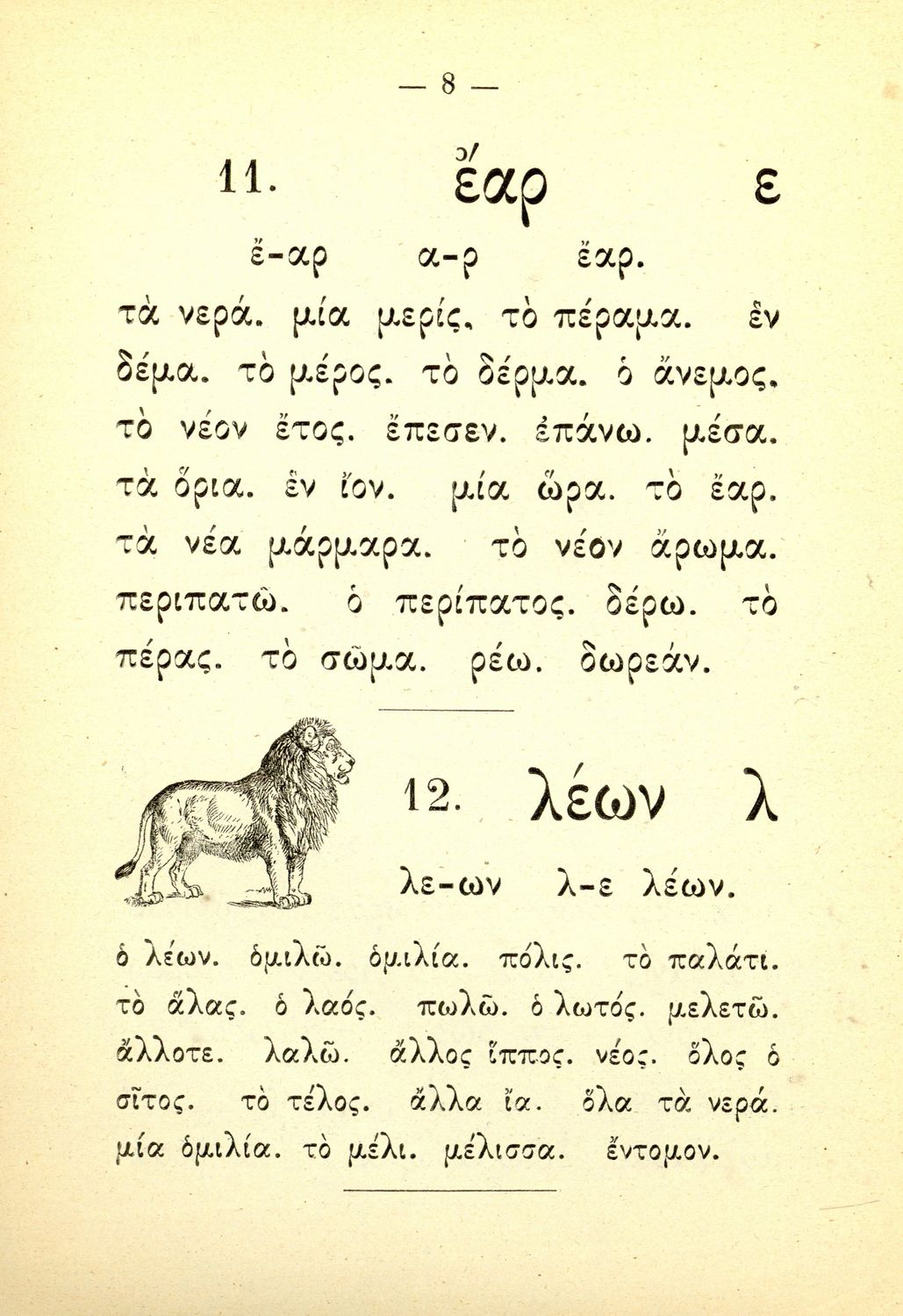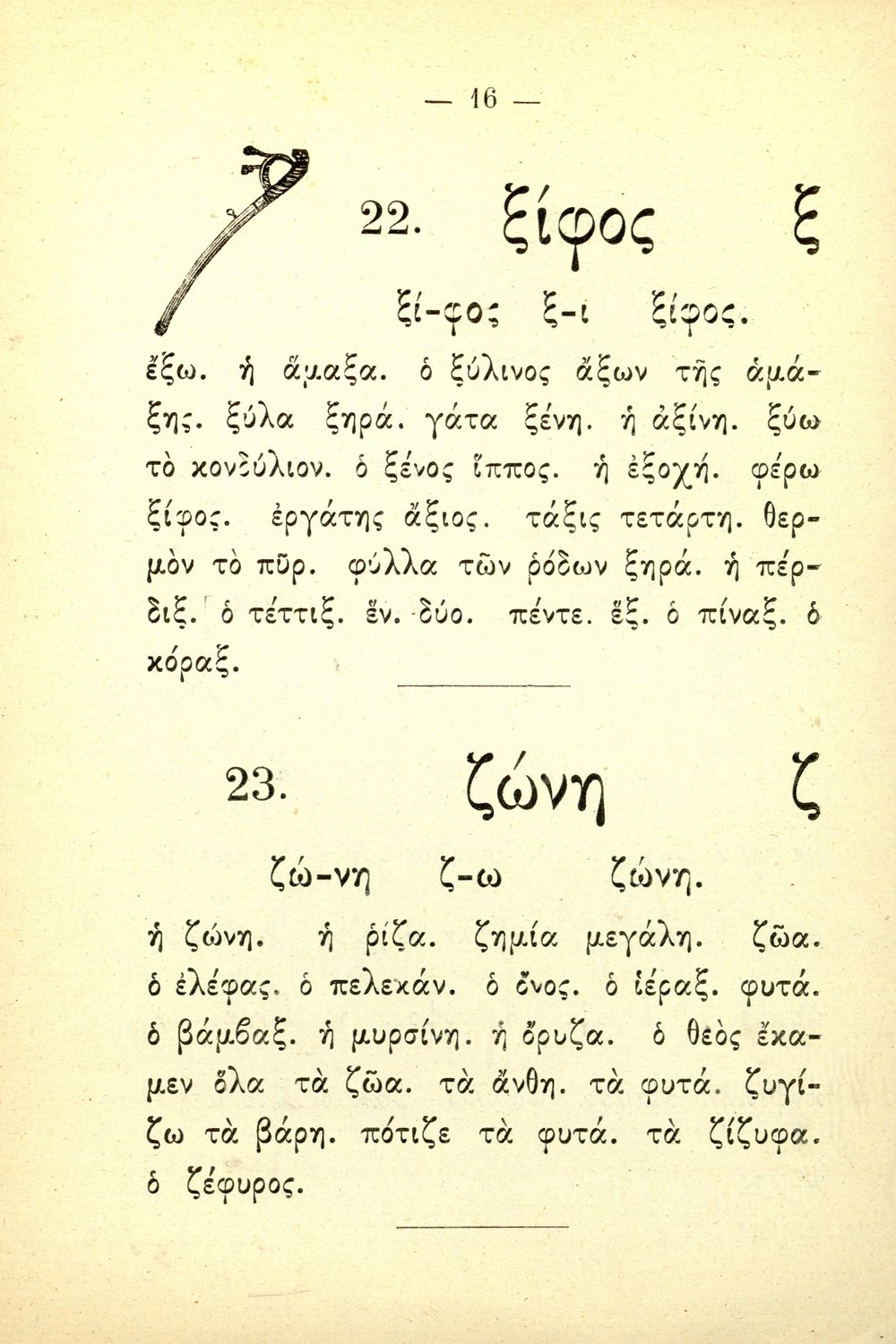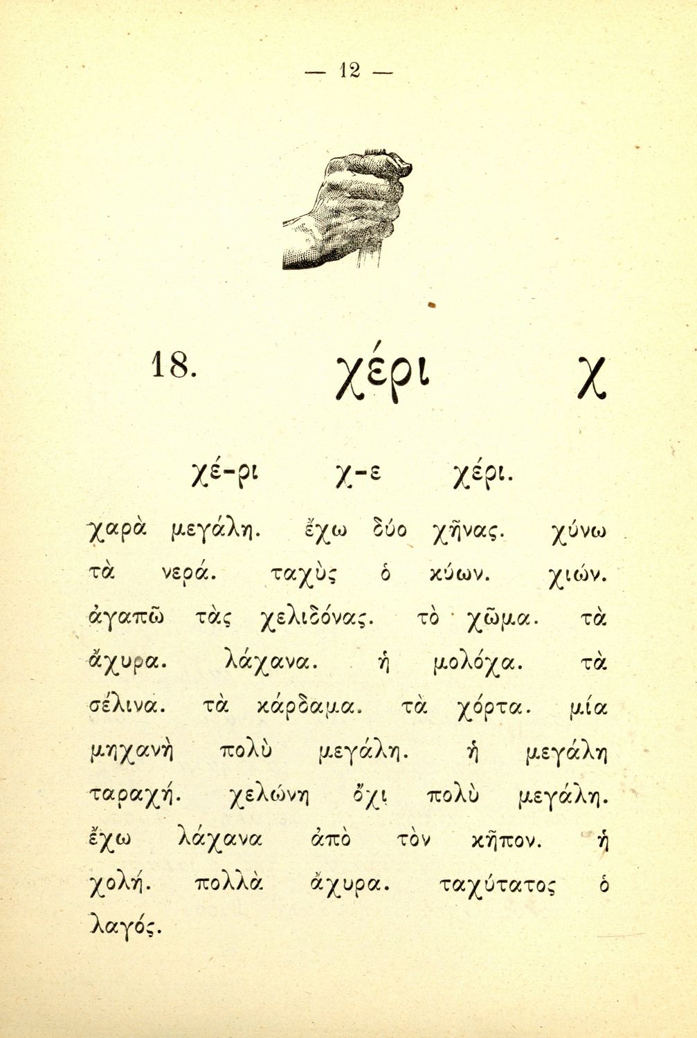 Βαθμίδα εκπαίδευσης: Πρωτοβάθμια Τάξη: Α' Δημοτικού Μάθημα: Νέα Ελληνικά Γλώσσα: Καθαρεύουσα Παρουσίαση περιεχομένου: Αναγνωστικό Α΄ Δημοτικού που περιλαμβάνει το ελληνικό αλφάβητο, εικόνες, συλλαβές και μικρές φράσεις και προτάσεις. |