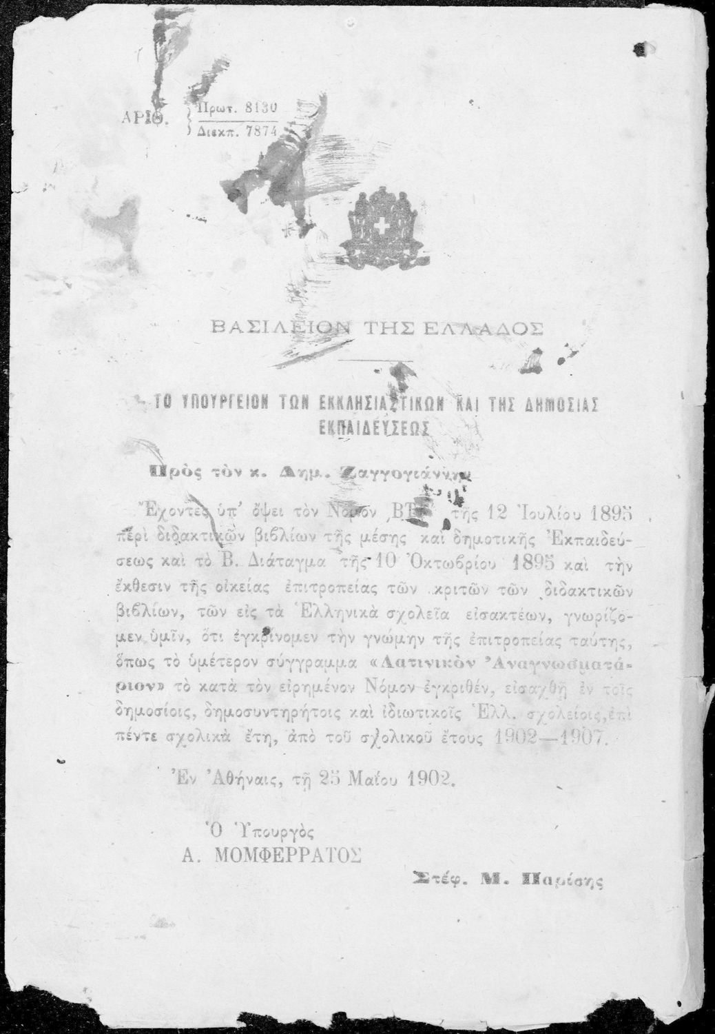 Τίτλος: Λατινικόν αναγνωσματάριον προς χρήσιν της Γ΄ τάξεως των Ελληνικών Σχολείων
