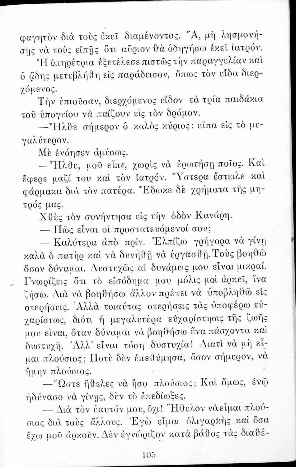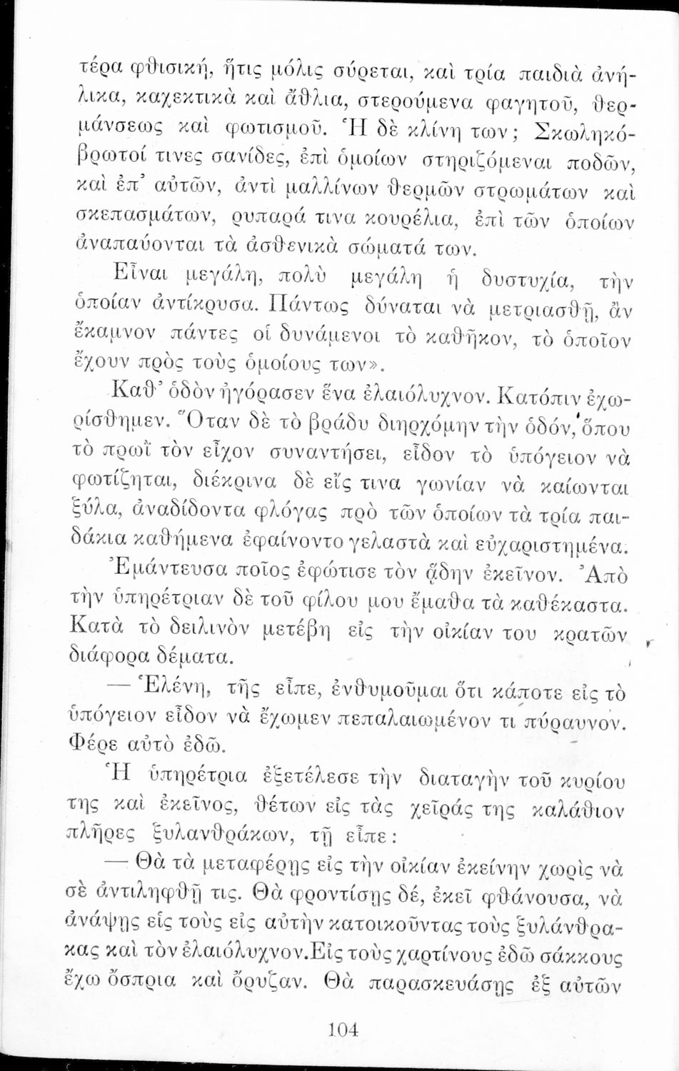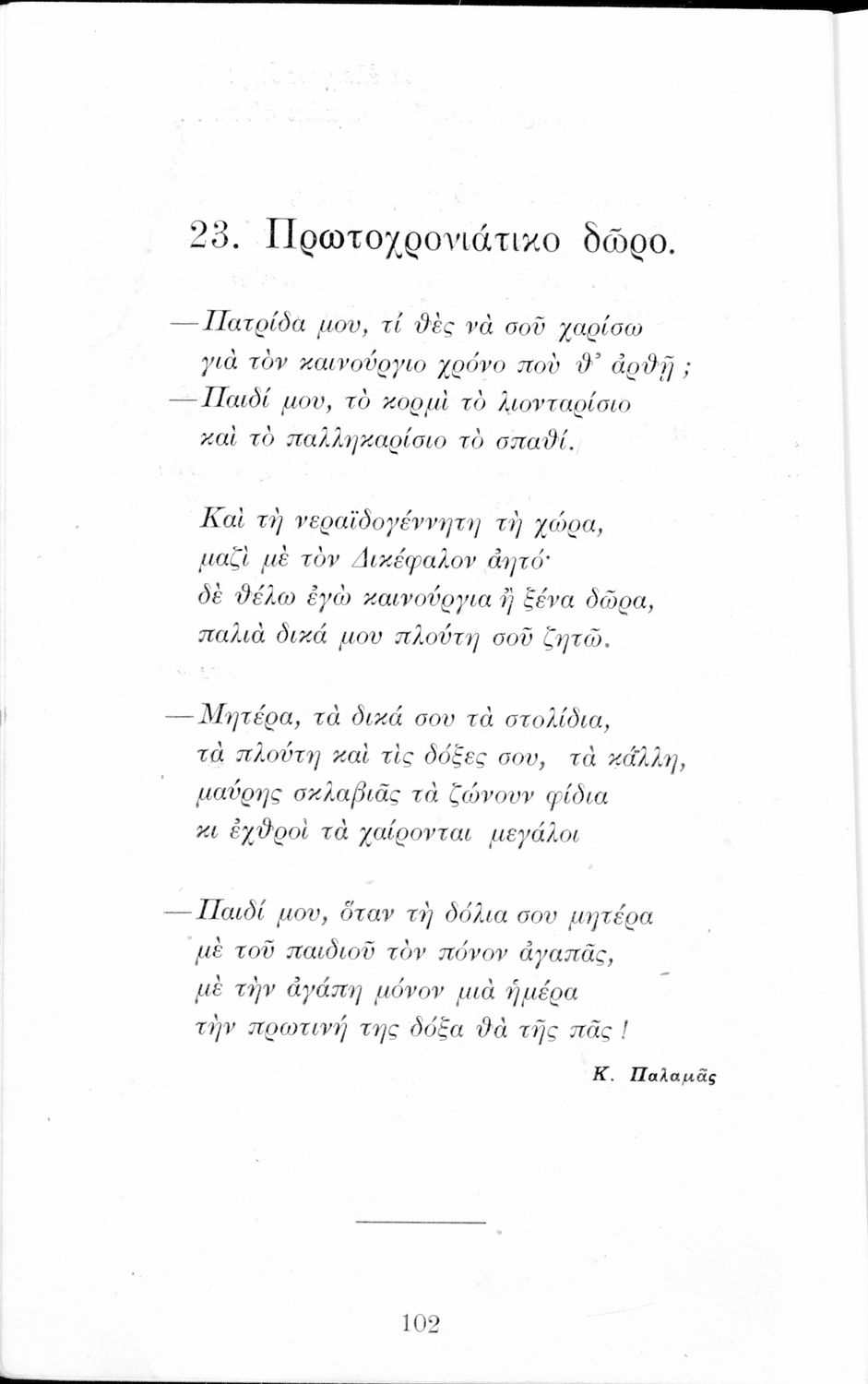 Αναγνωστικό ΣΤ΄ Δημοτικού που περιλαμβάνει πεζά γραμμένα σε καθαρεύουσα και ποιήματα σε δημοτική εμπνευσμένα από την οικογένεια, τη θρησκεία, την πατρίδα, την ελληνική φύση και ύπαιθρο, την αγάπη για τα ζώα, τις καθημερινές ασχολίες και επαγγέλματα και τις ηθικές αρετές.