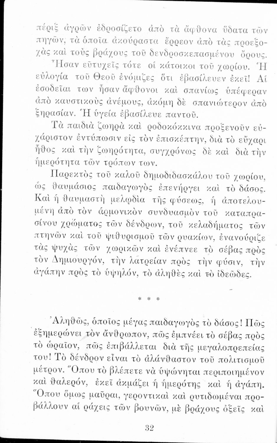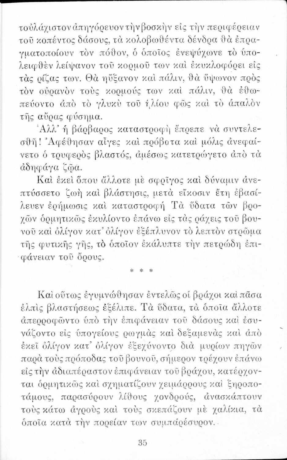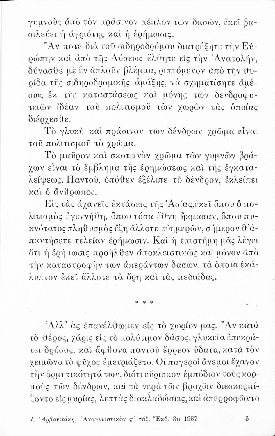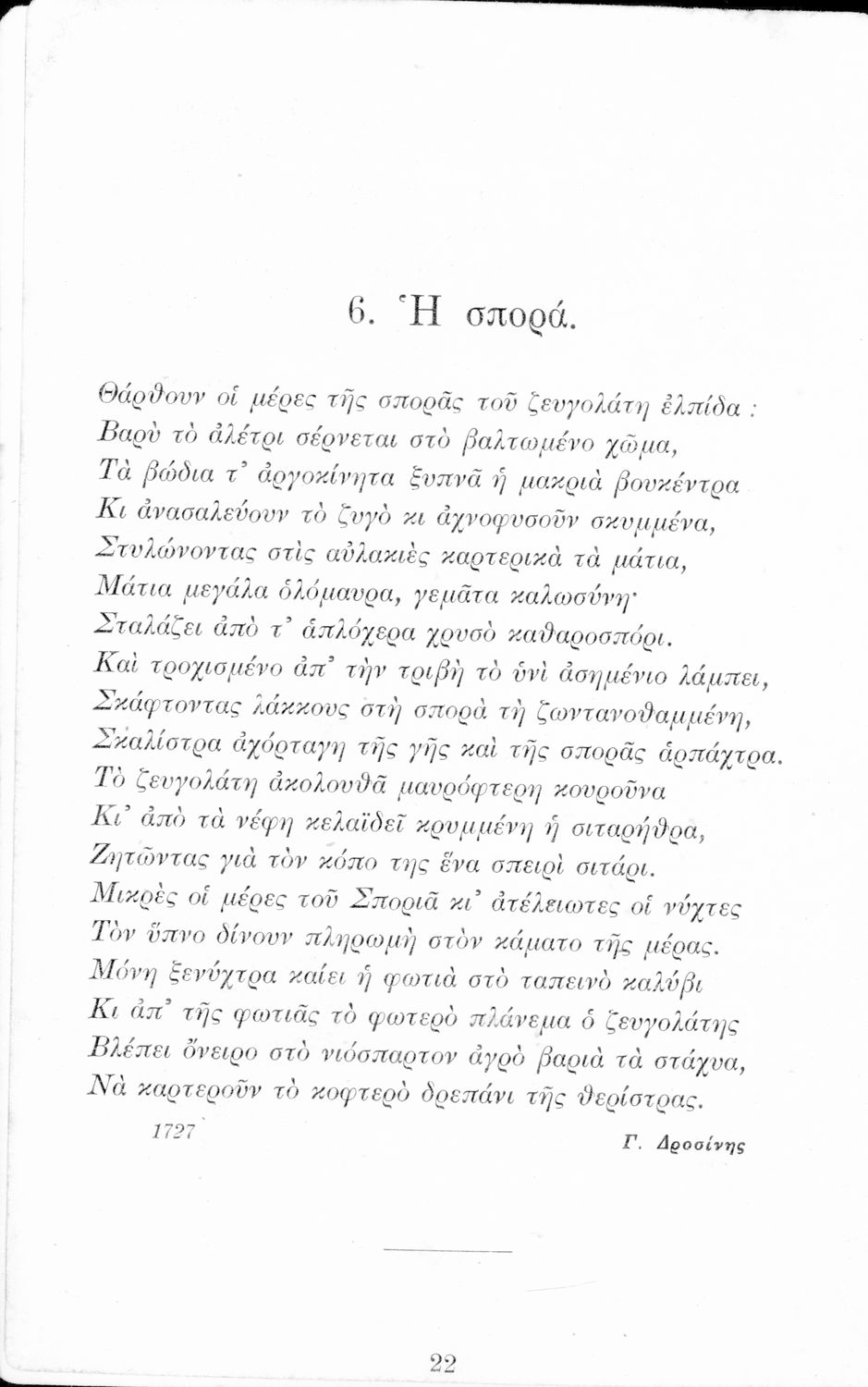 Αναγνωστικό ΣΤ΄ Δημοτικού που περιλαμβάνει πεζά γραμμένα σε καθαρεύουσα και ποιήματα σε δημοτική εμπνευσμένα από την οικογένεια, τη θρησκεία, την πατρίδα, την ελληνική φύση και ύπαιθρο, την αγάπη για τα ζώα, τις καθημερινές ασχολίες και επαγγέλματα και τις ηθικές αρετές.