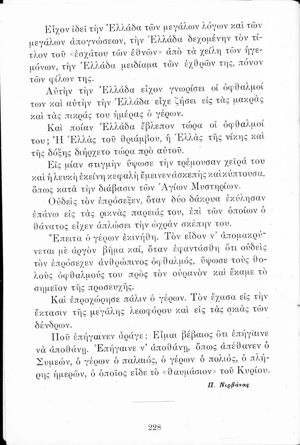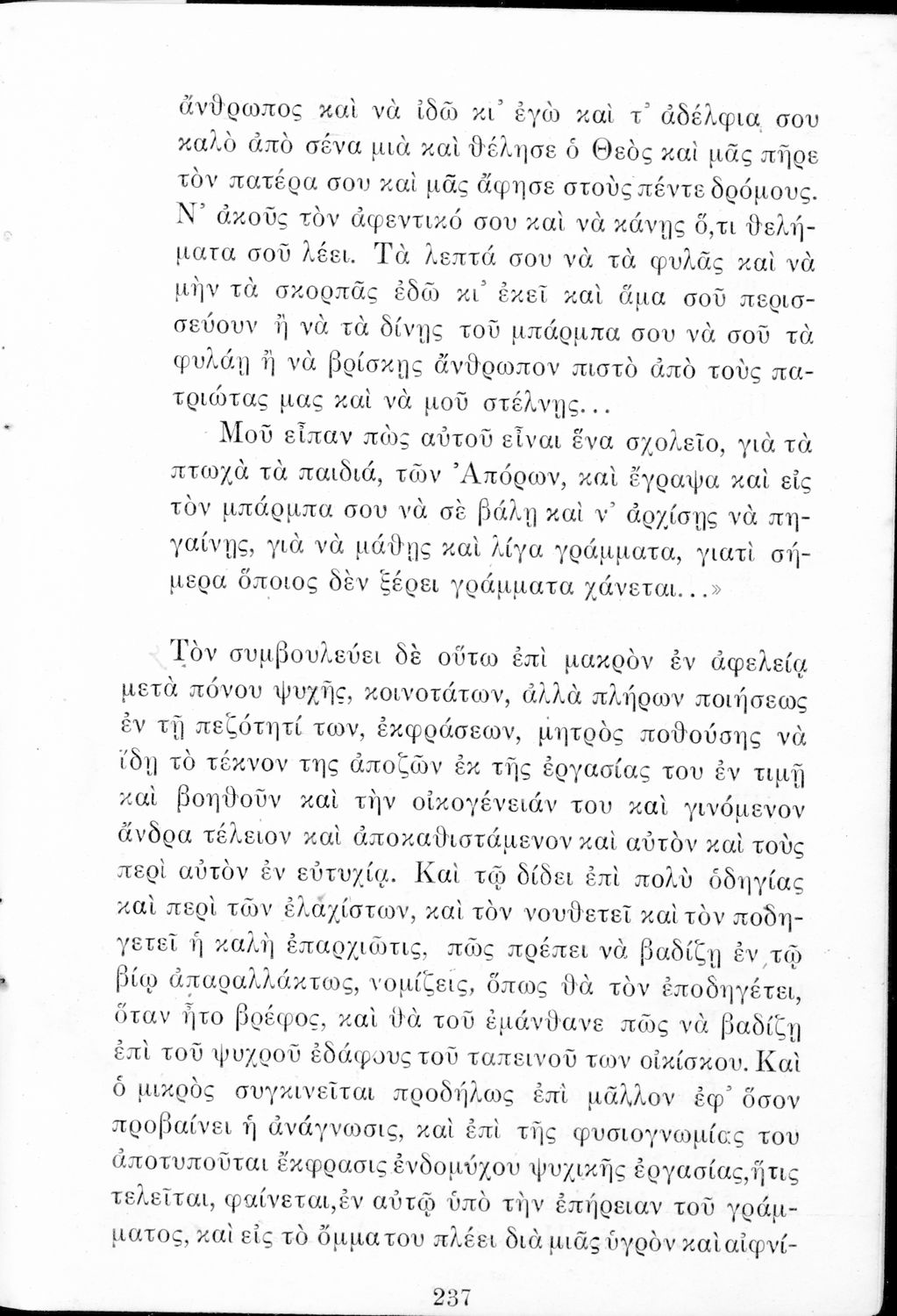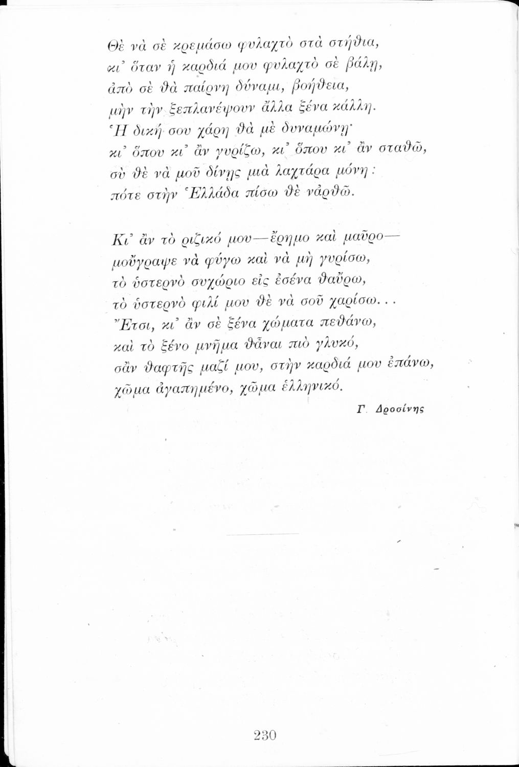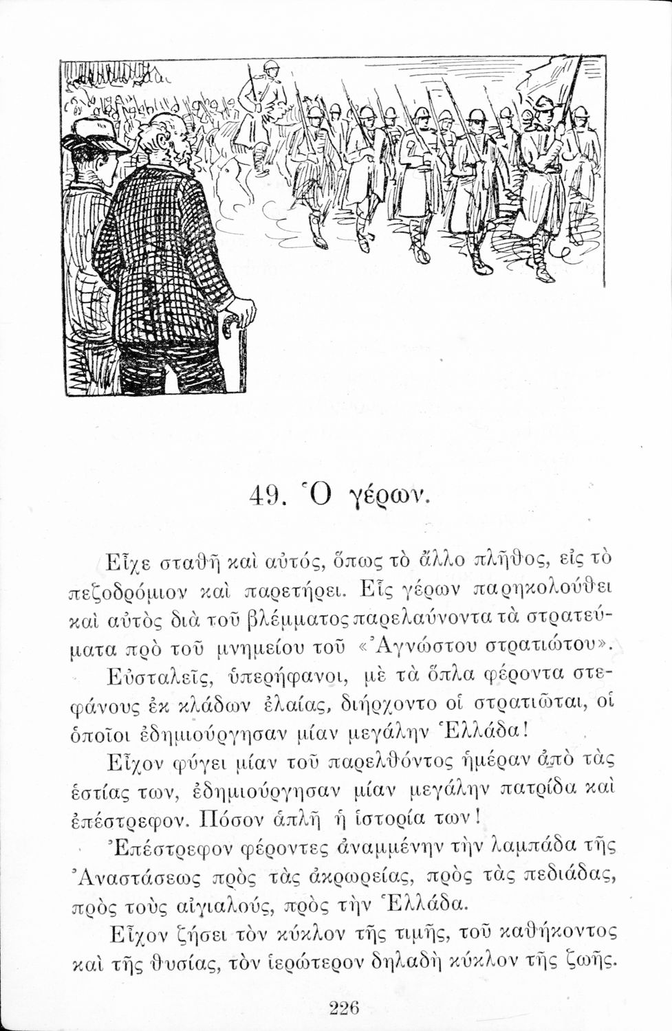 Αναγνωστικό ΣΤ΄ Δημοτικού που περιλαμβάνει πεζά γραμμένα σε καθαρεύουσα και ποιήματα σε δημοτική εμπνευσμένα από την οικογένεια, τη θρησκεία, την πατρίδα, την ελληνική φύση και ύπαιθρο, την αγάπη για τα ζώα, τις καθημερινές ασχολίες και επαγγέλματα και τις ηθικές αρετές.