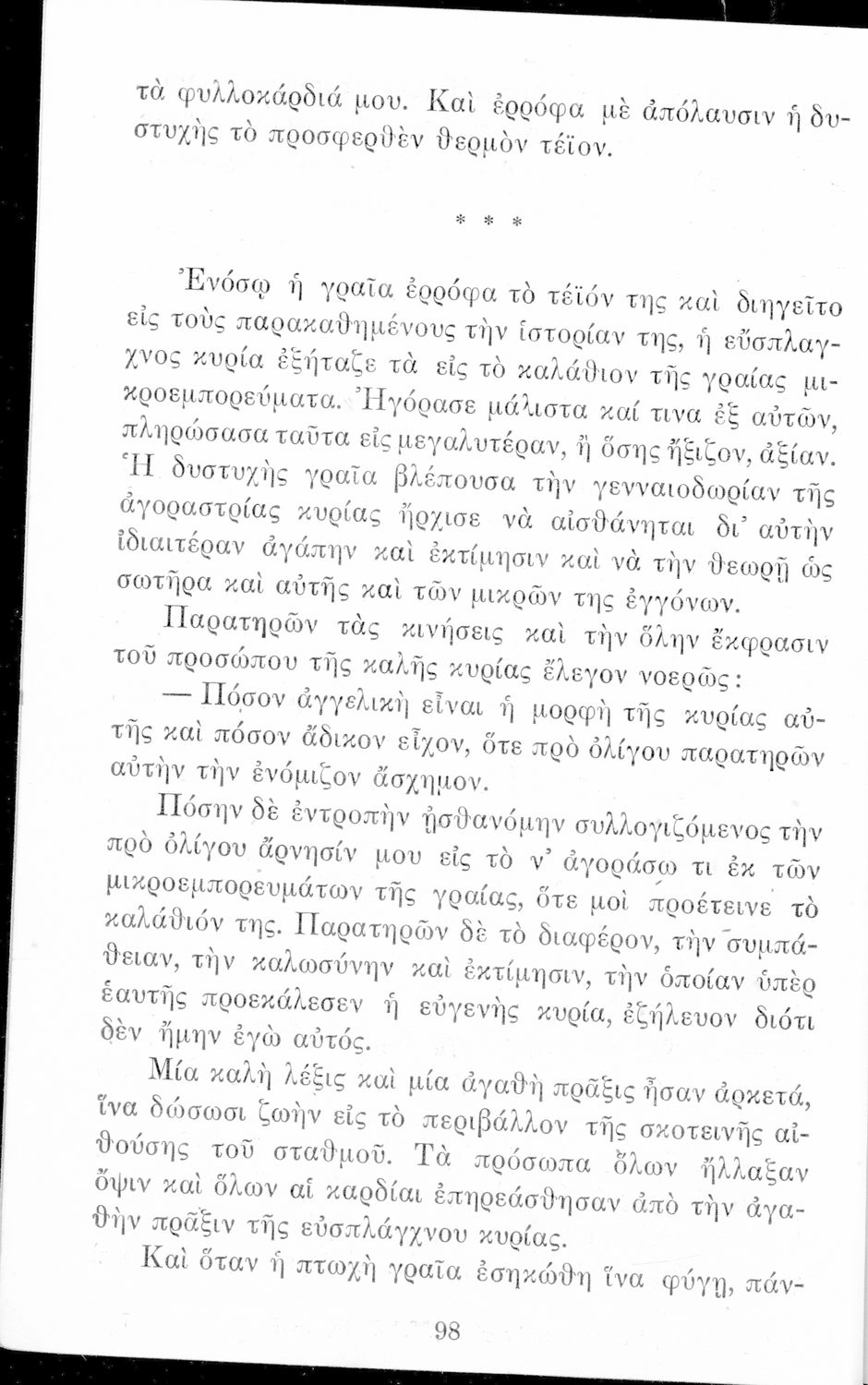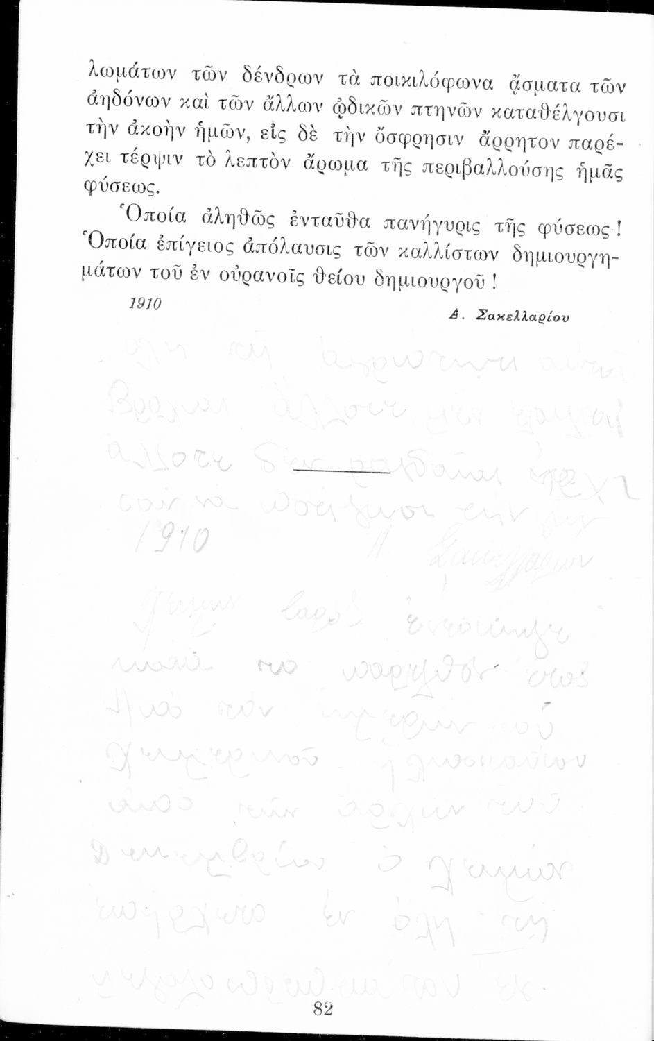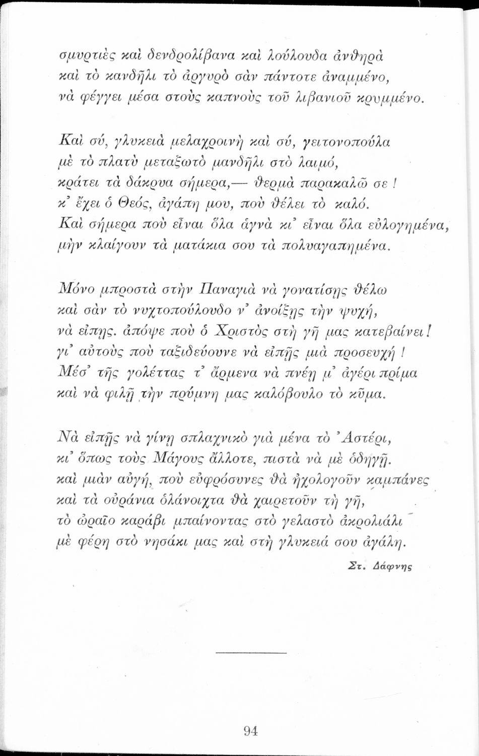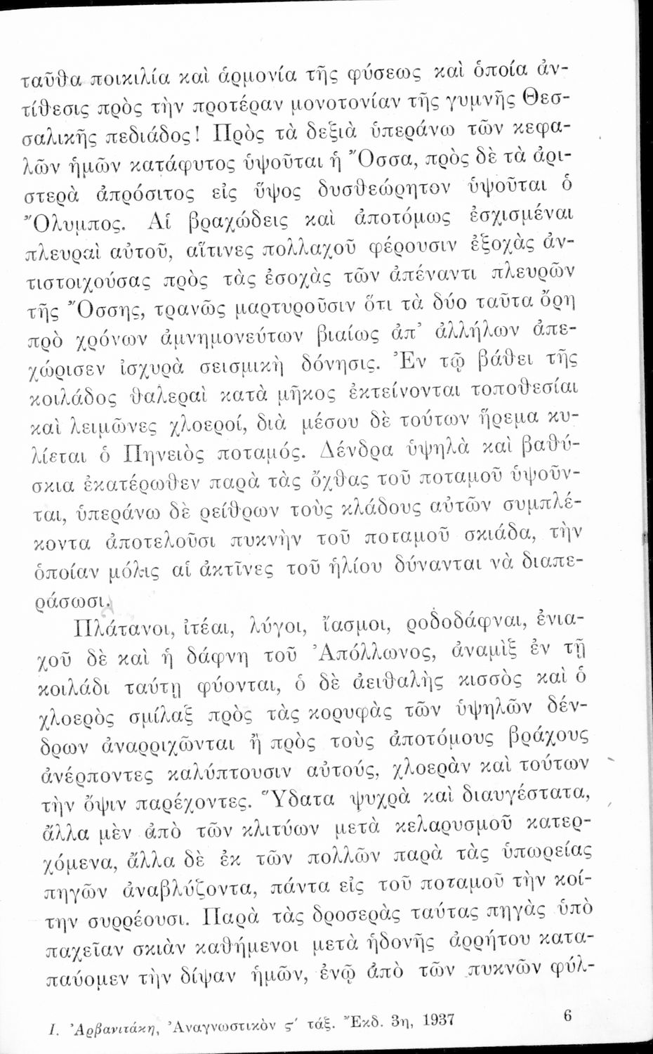 Αναγνωστικό ΣΤ΄ Δημοτικού που περιλαμβάνει πεζά γραμμένα σε καθαρεύουσα και ποιήματα σε δημοτική εμπνευσμένα από την οικογένεια, τη θρησκεία, την πατρίδα, την ελληνική φύση και ύπαιθρο, την αγάπη για τα ζώα, τις καθημερινές ασχολίες και επαγγέλματα και τις ηθικές αρετές.