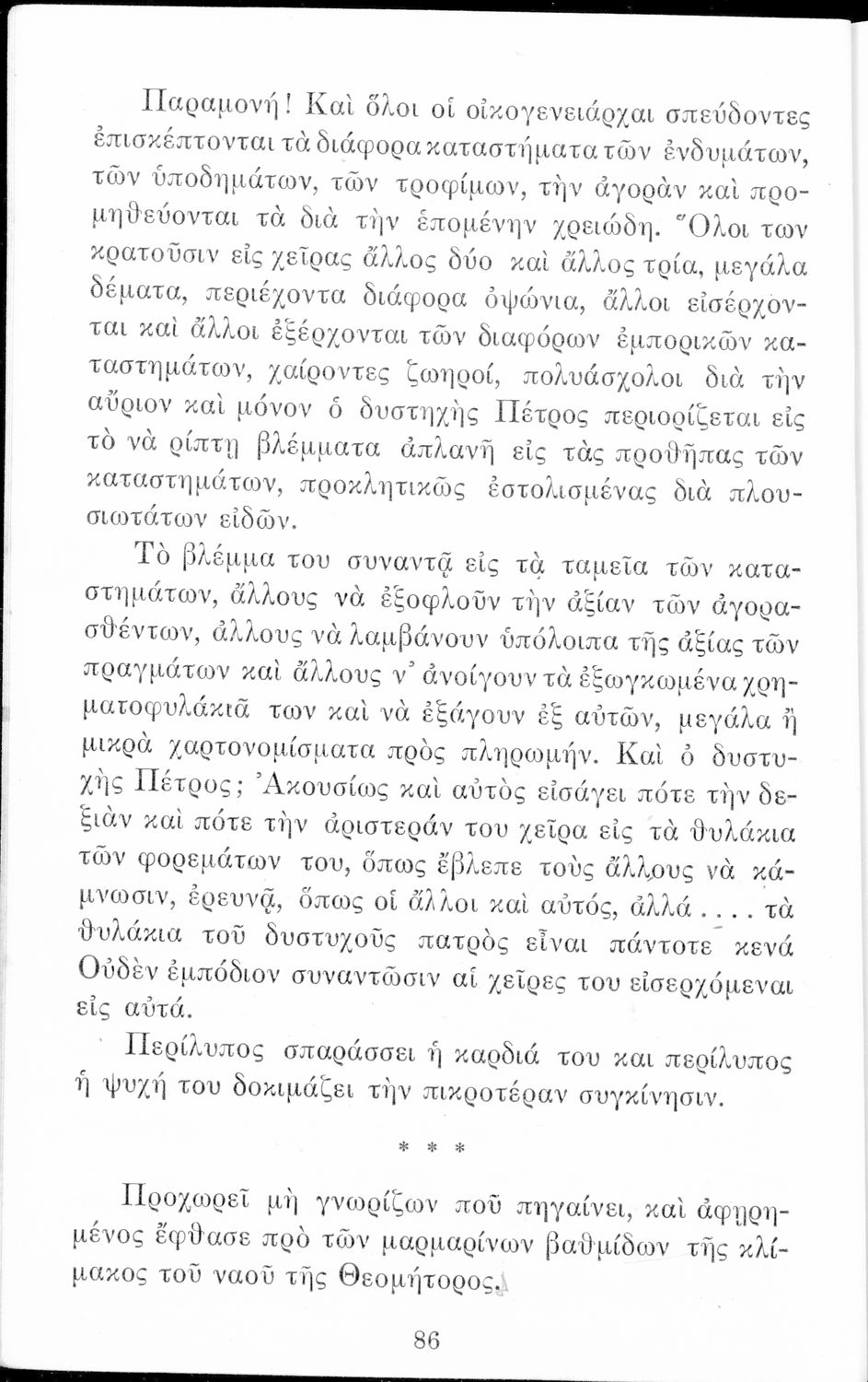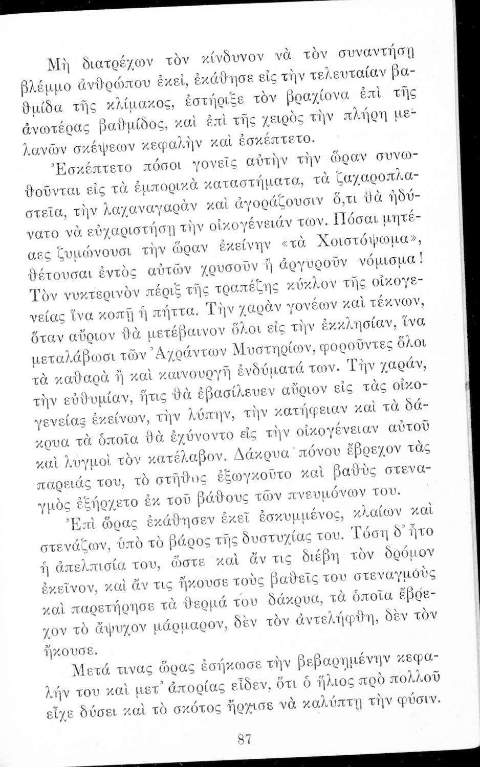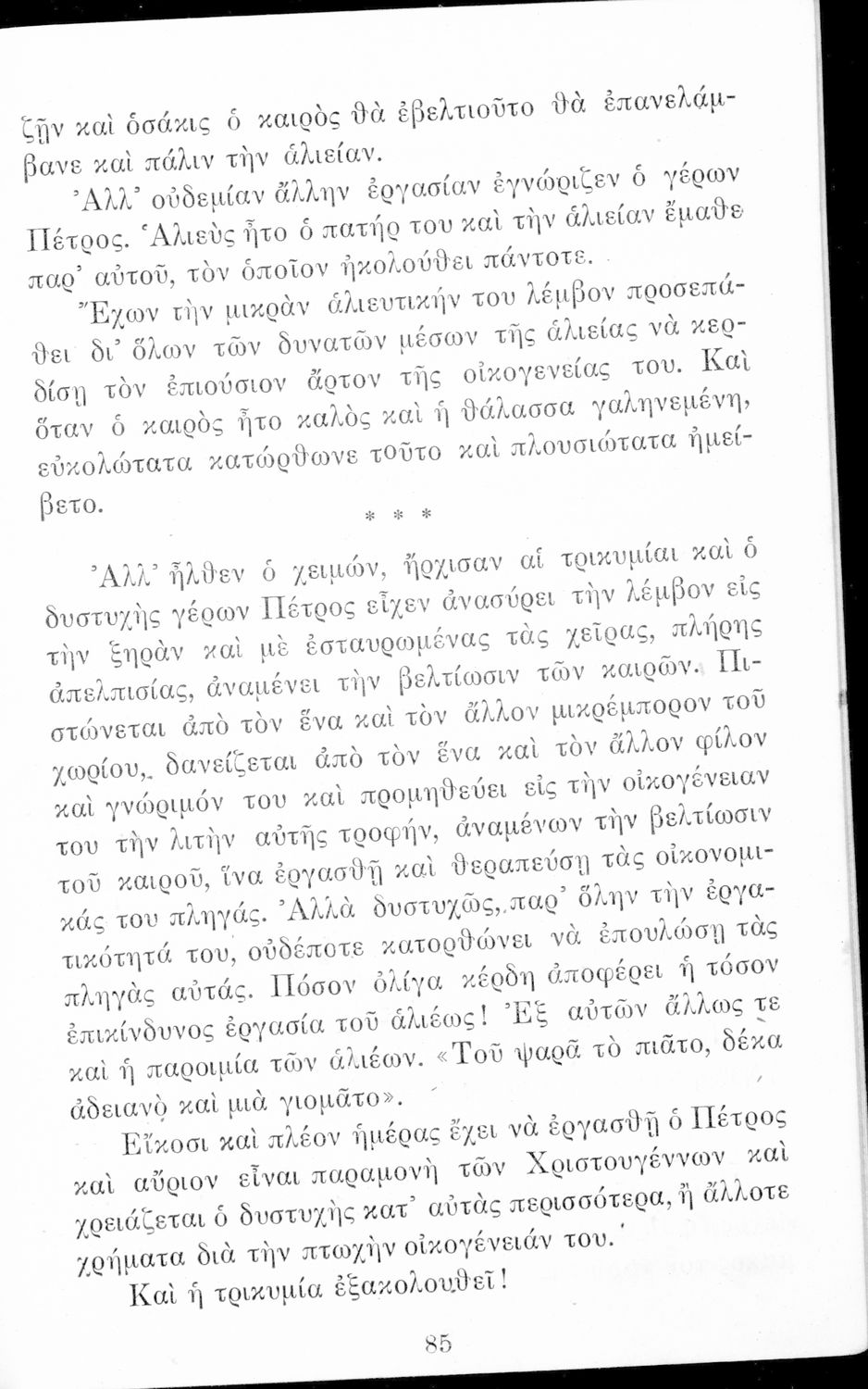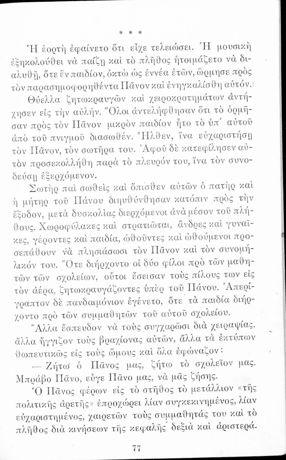 Αναγνωστικό ΣΤ΄ Δημοτικού που περιλαμβάνει πεζά γραμμένα σε καθαρεύουσα και ποιήματα σε δημοτική εμπνευσμένα από την οικογένεια, τη θρησκεία, την πατρίδα, την ελληνική φύση και ύπαιθρο, την αγάπη για τα ζώα, τις καθημερινές ασχολίες και επαγγέλματα και τις ηθικές αρετές.