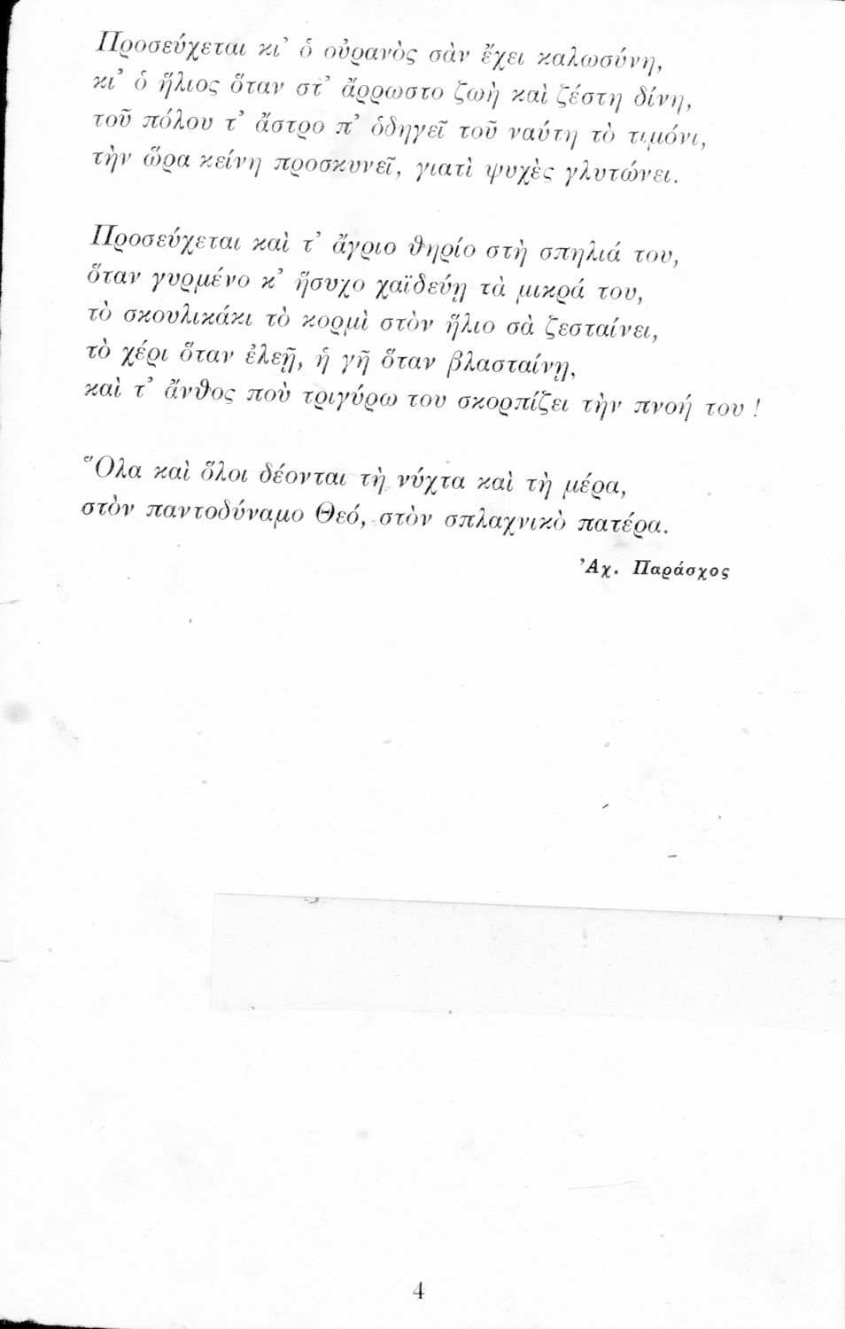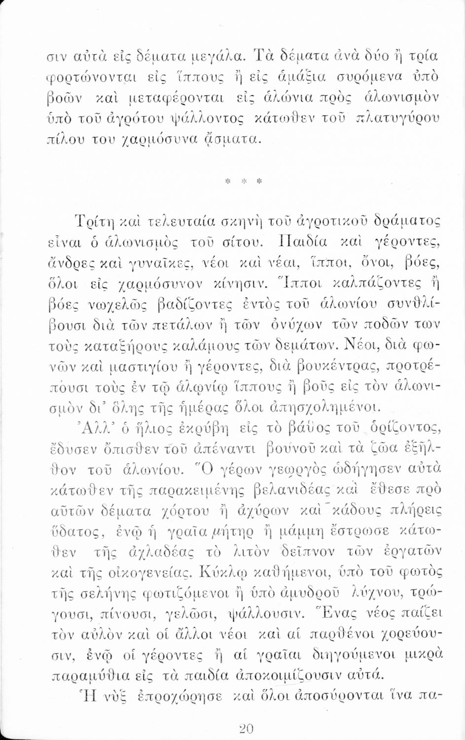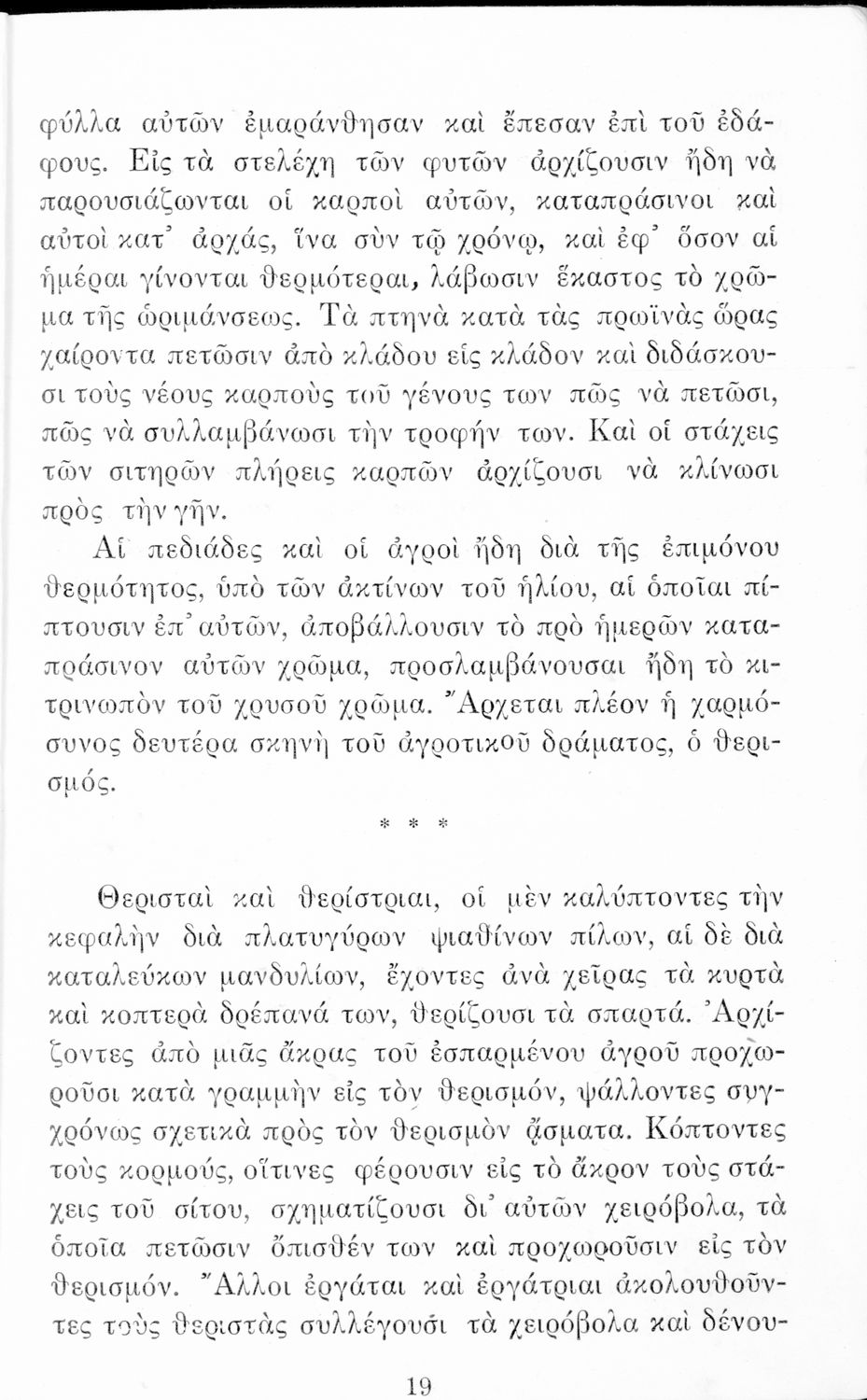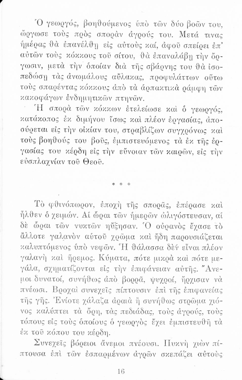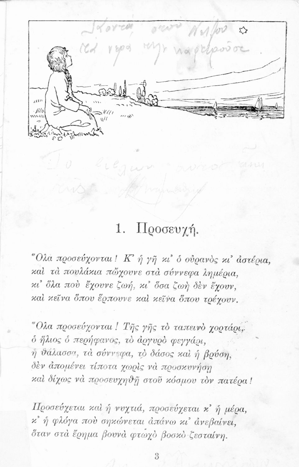 Αναγνωστικό ΣΤ΄ Δημοτικού που περιλαμβάνει πεζά γραμμένα σε καθαρεύουσα και ποιήματα σε δημοτική εμπνευσμένα από την οικογένεια, τη θρησκεία, την πατρίδα, την ελληνική φύση και ύπαιθρο, την αγάπη για τα ζώα, τις καθημερινές ασχολίες και επαγγέλματα και τις ηθικές αρετές.