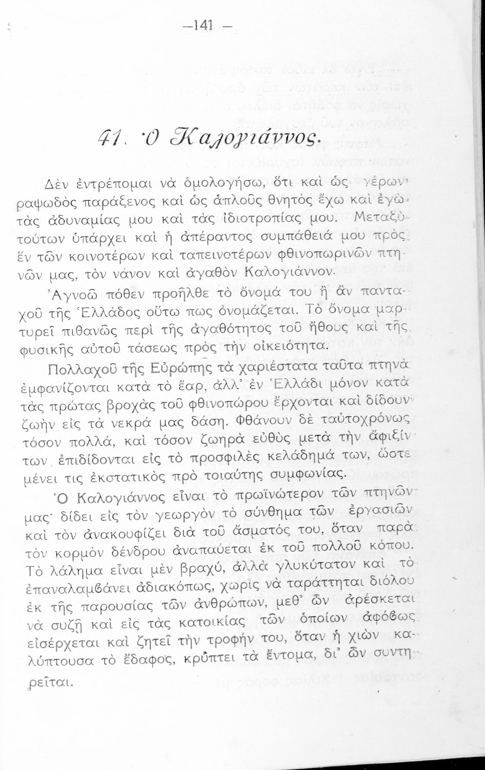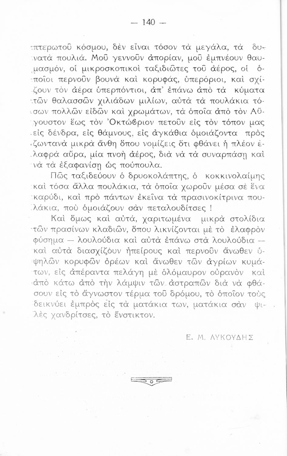 Αναγνωστικό Ε΄ Δημοτικού που αποτελείται από πεζά γραμμένα σε καθαρεύουσα και ποιήματα σε δημοτική εμπνευσμένα από την οικογένεια, τη θρησκεία, την μυθολογία και ιστορία, την υγιεινή, την πατρίδα, την ελληνική φύση, την αγάπη για τα ζώα, τις καθημερινές ασχολίες και επαγγέλματα και τις ηθικές αρετές.