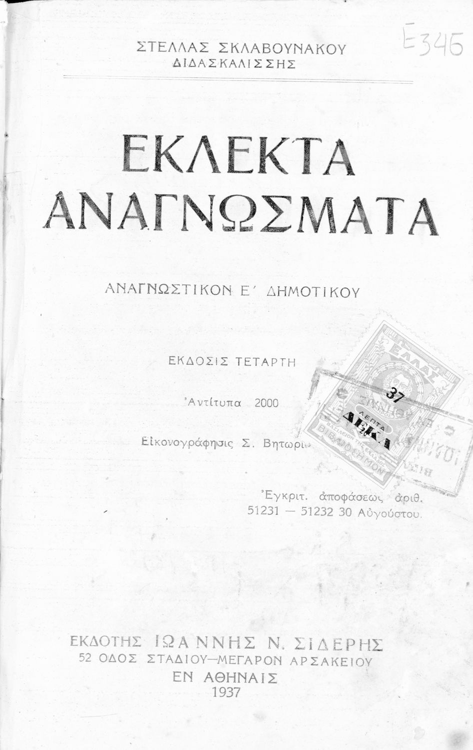 Εκδότης: Ιωάννης Ν. Σιδέρης Έτος έκδοσης: 1937 Τόπος έκδοσης: Αθήνα Έκδοση: 4η Υπουργική απόφαση / Σύμβαση: 51231,51232/20-8-1934 Έτος έγκρισης: 1934 |