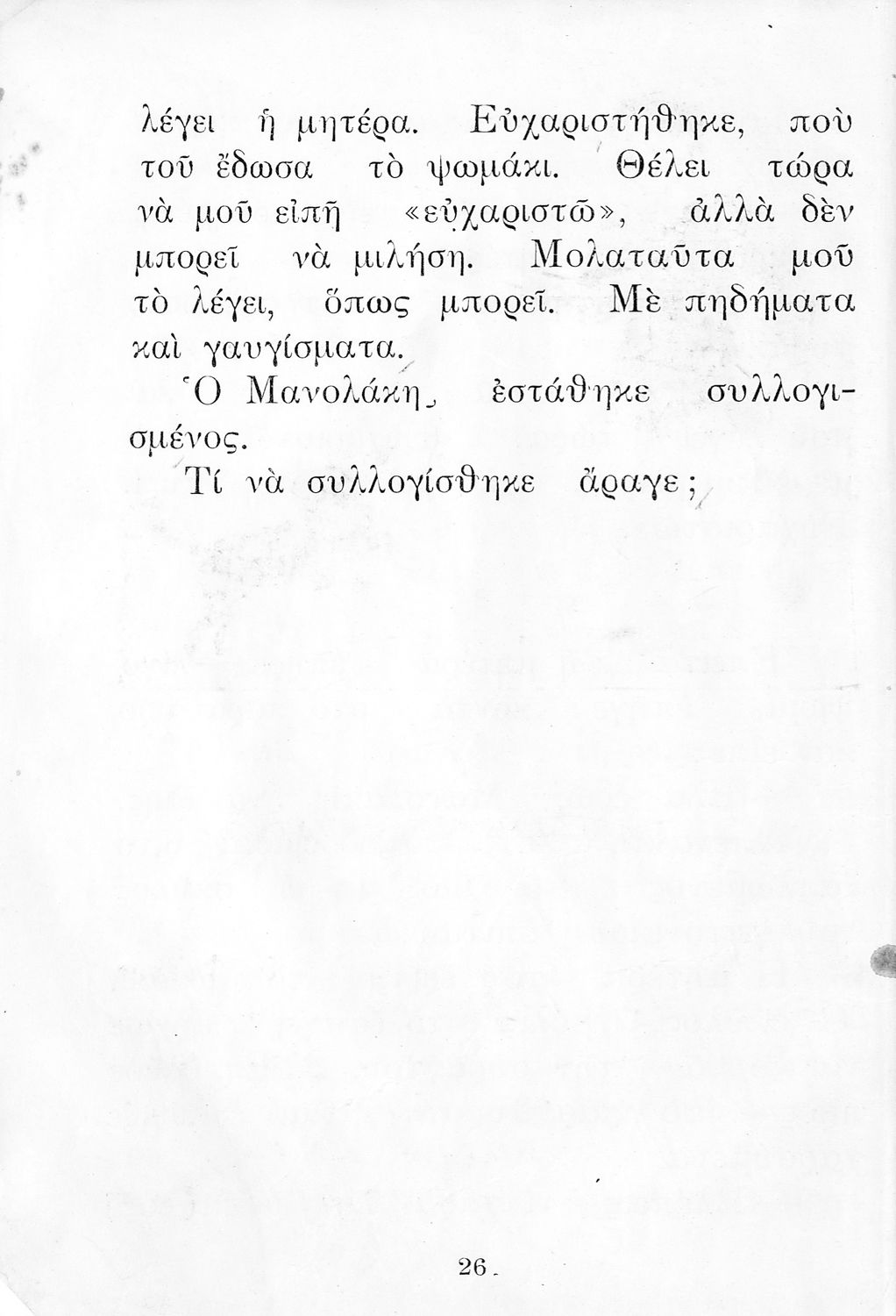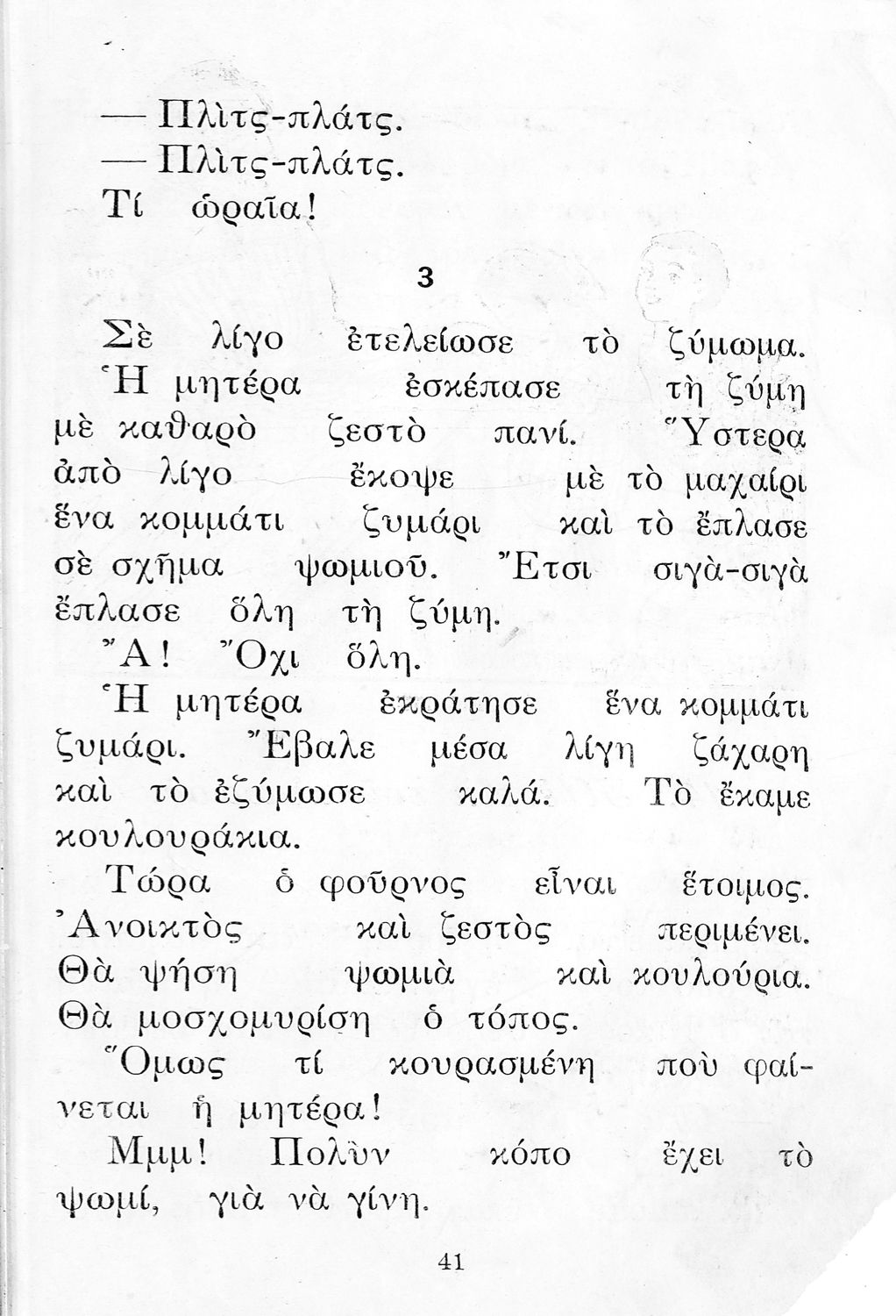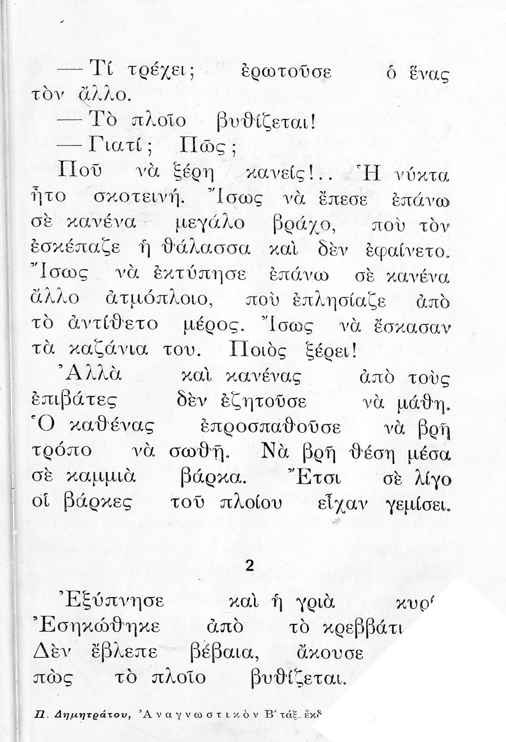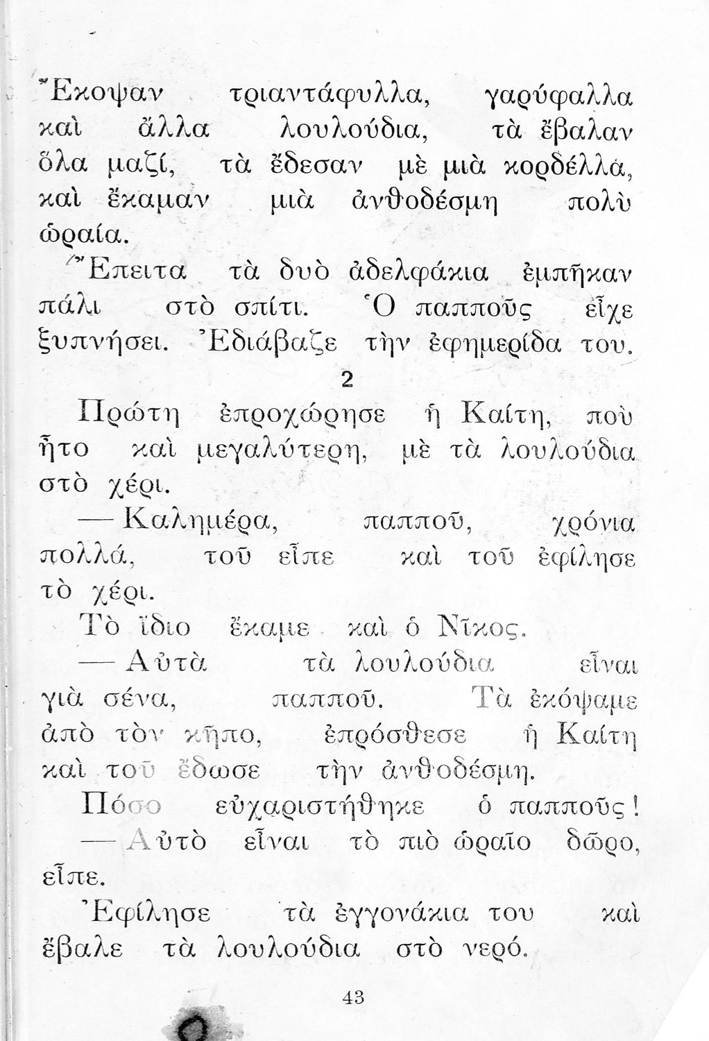 Αναγνωστικό Β΄ Δημοτικού που αποτελείται από πεζά γραμμένα σε καθαρεύουσα και ποιήματα σε δημοτική εμπνευσμένα από την οικογένεια, τη θρησκεία, την πατρίδα, την ελληνική φύση και ύπαιθρο, την αγάπη για τα ζώα, τις καθημερινές ασχολίες και επαγγέλματα και τις ηθικές αρετές.