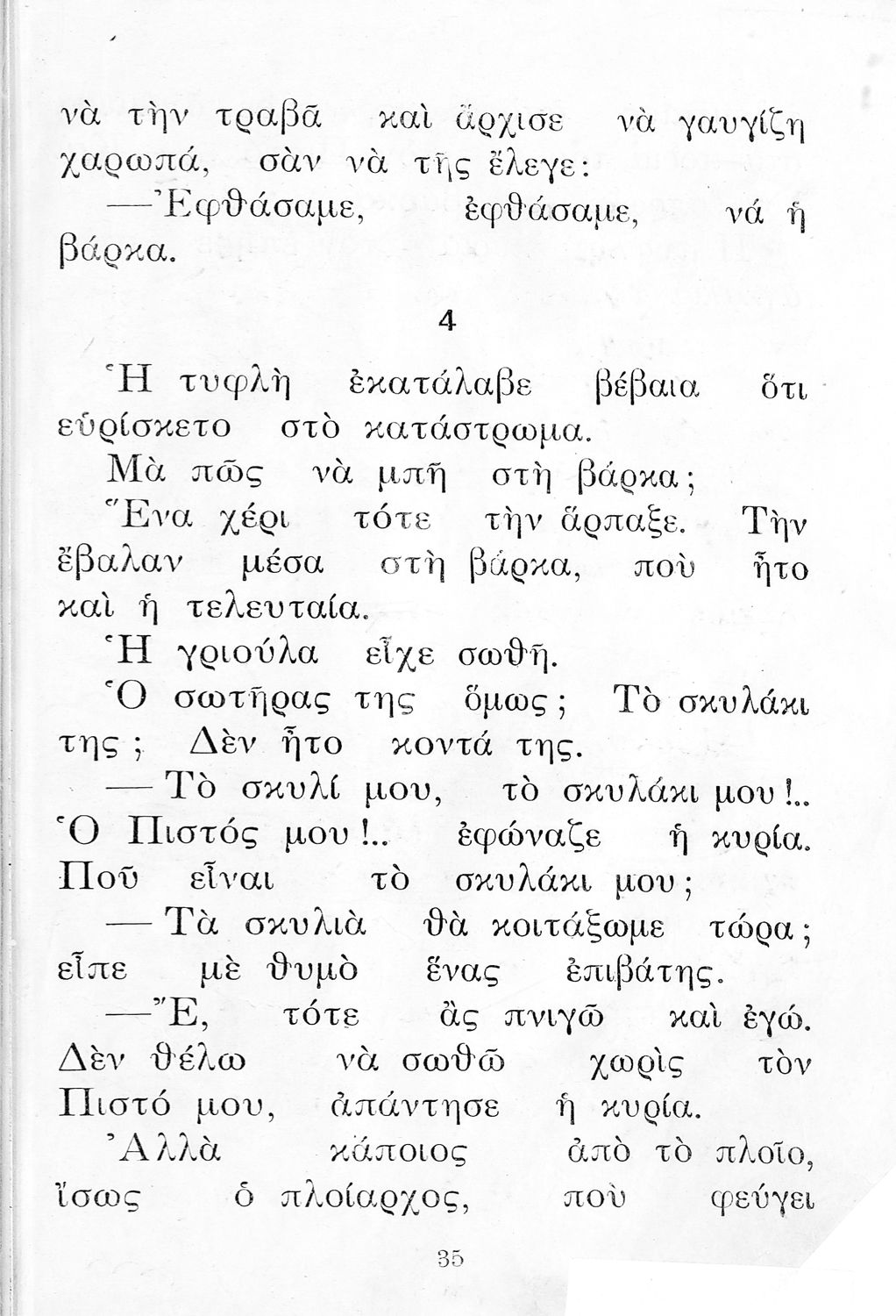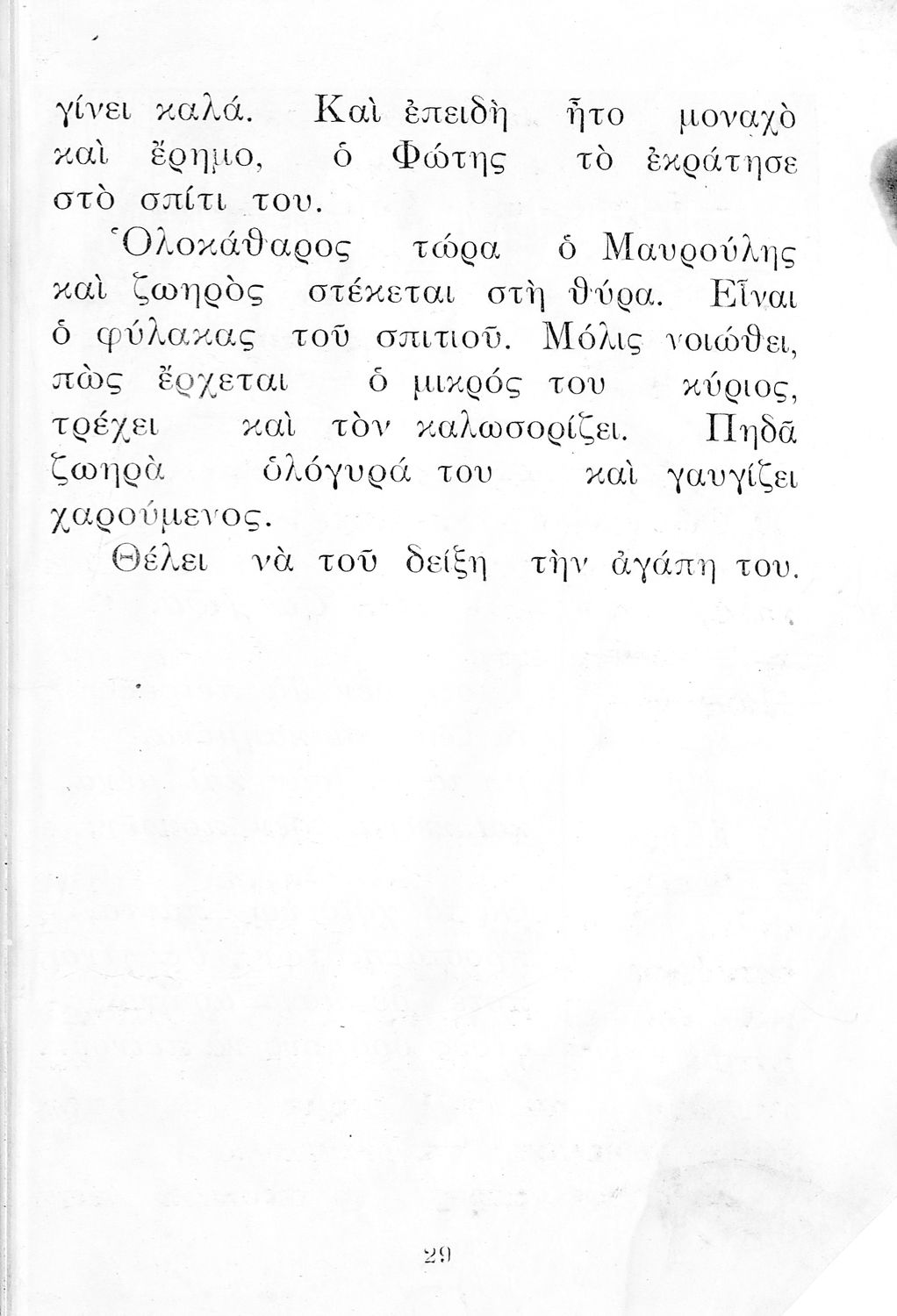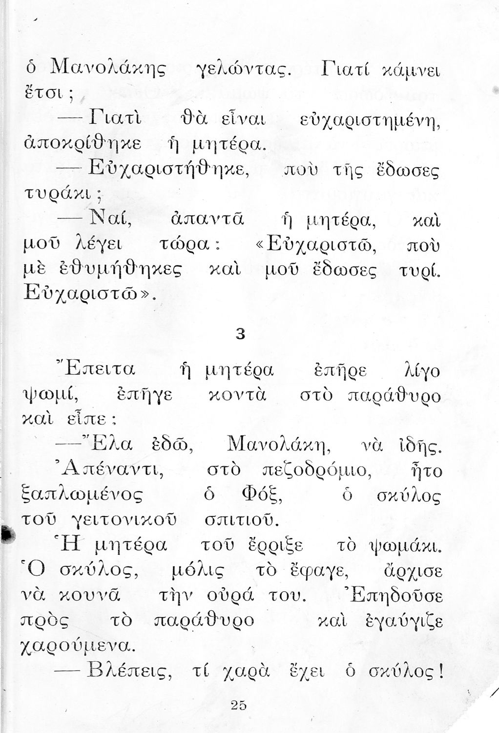 Αναγνωστικό Β΄ Δημοτικού που αποτελείται από πεζά γραμμένα σε καθαρεύουσα και ποιήματα σε δημοτική εμπνευσμένα από την οικογένεια, τη θρησκεία, την πατρίδα, την ελληνική φύση και ύπαιθρο, την αγάπη για τα ζώα, τις καθημερινές ασχολίες και επαγγέλματα και τις ηθικές αρετές.