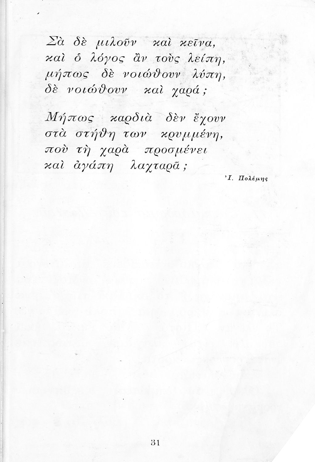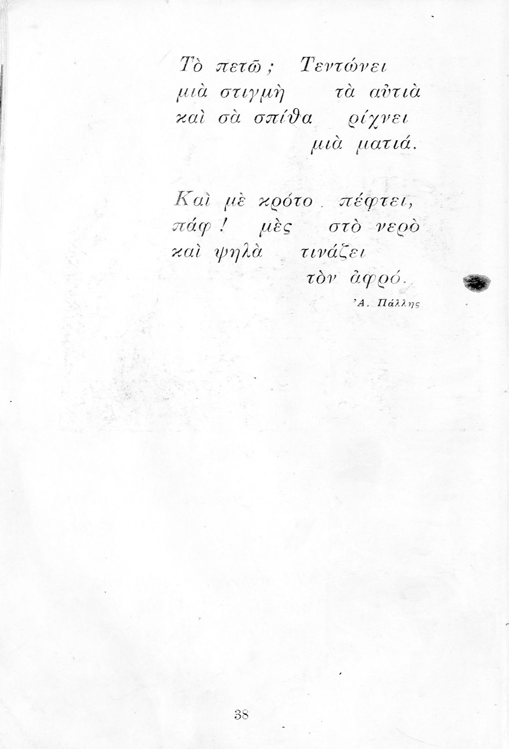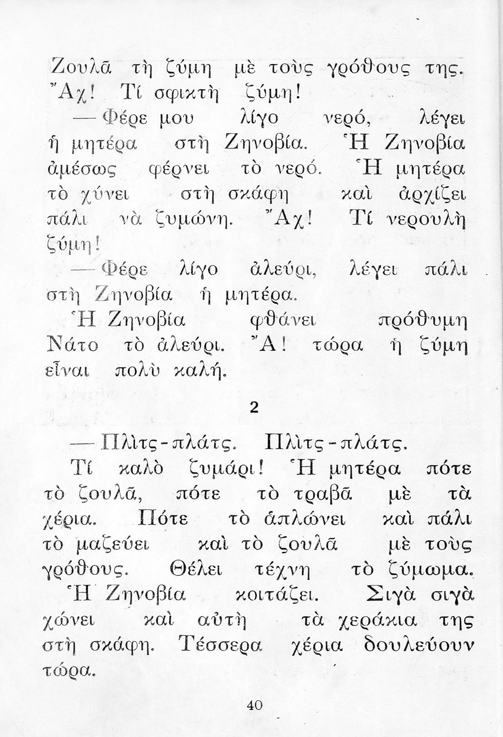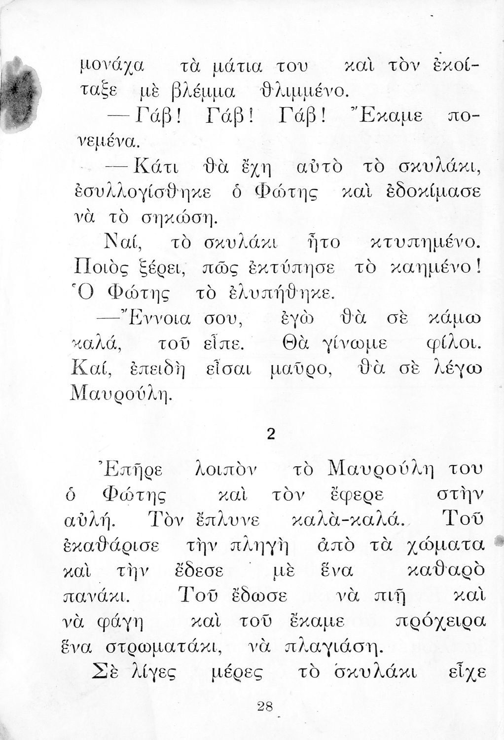 Αναγνωστικό Β΄ Δημοτικού που αποτελείται από πεζά γραμμένα σε καθαρεύουσα και ποιήματα σε δημοτική εμπνευσμένα από την οικογένεια, τη θρησκεία, την πατρίδα, την ελληνική φύση και ύπαιθρο, την αγάπη για τα ζώα, τις καθημερινές ασχολίες και επαγγέλματα και τις ηθικές αρετές.