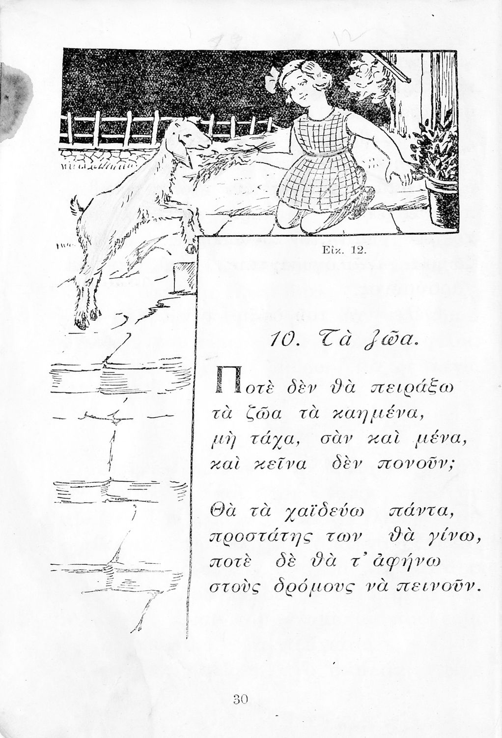 Παρουσίαση περιεχομένου: Αναγνωστικό Β΄ Δημοτικού που αποτελείται από πεζά γραμμένα σε καθαρεύουσα και ποιήματα σε δημοτική εμπνευσμένα από την οικογένεια, τη θρησκεία, την πατρίδα, την ελληνική φύση και ύπαιθρο, την αγάπη για τα ζώα, τις καθημερινές ασχολίες και επαγγέλματα και τις ηθικές αρετές.