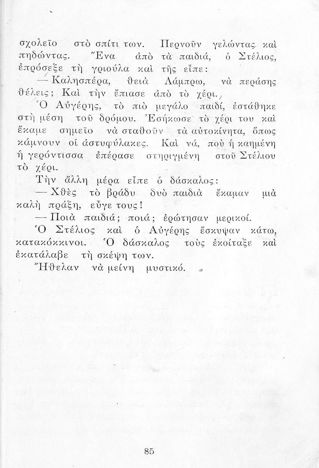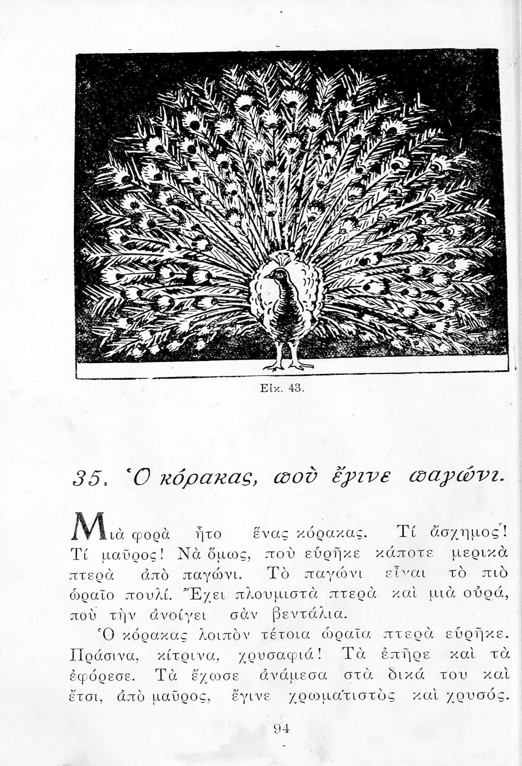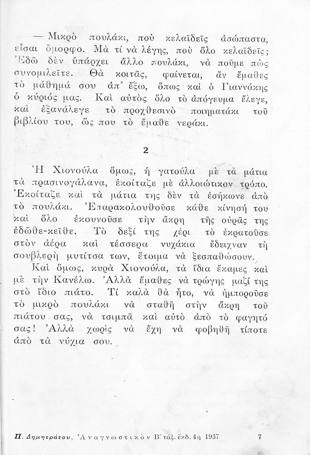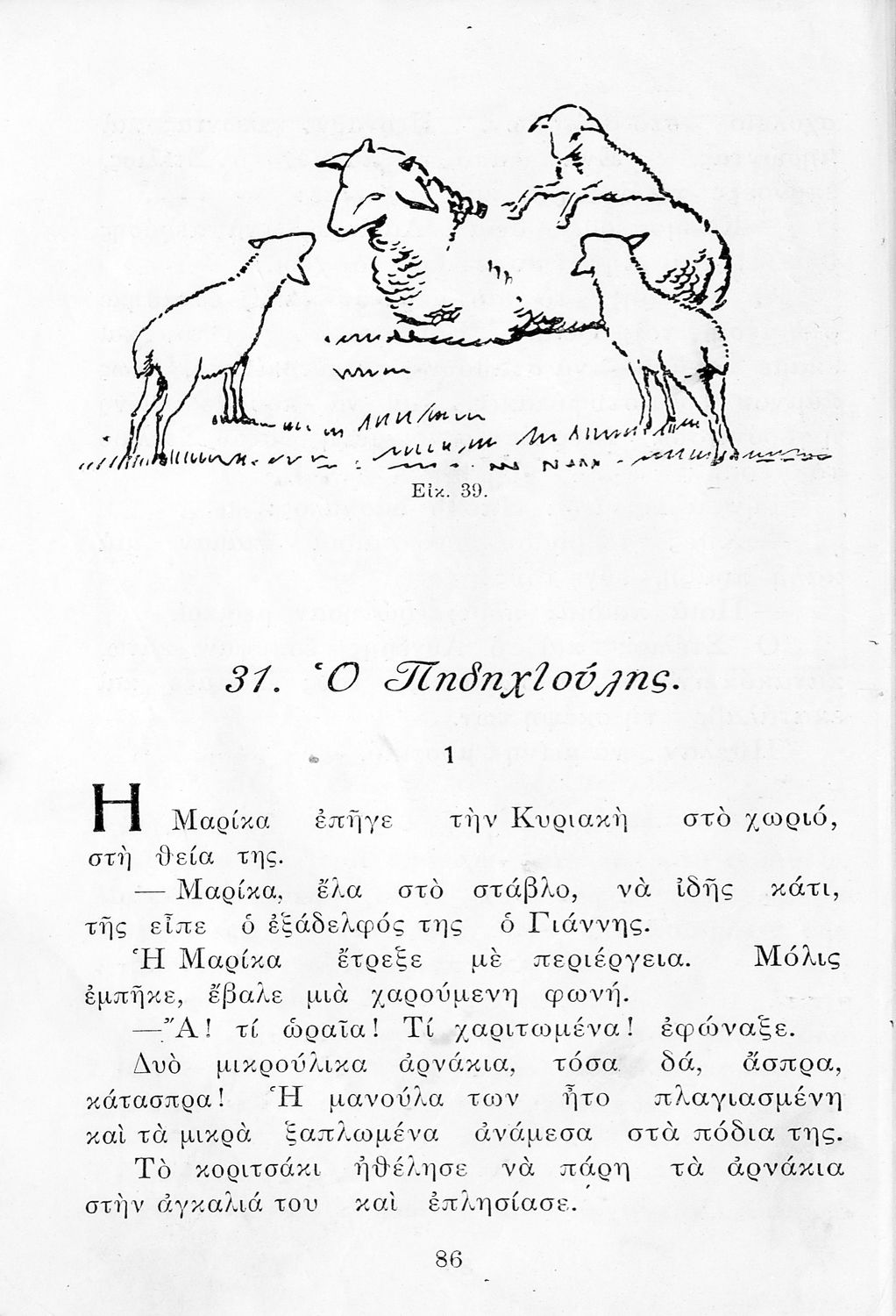 Αναγνωστικό Β΄ Δημοτικού που αποτελείται από πεζά γραμμένα σε καθαρεύουσα και ποιήματα σε δημοτική εμπνευσμένα από την οικογένεια, τη θρησκεία, την πατρίδα, την ελληνική φύση και ύπαιθρο, την αγάπη για τα ζώα, τις καθημερινές ασχολίες και επαγγέλματα και τις ηθικές αρετές.