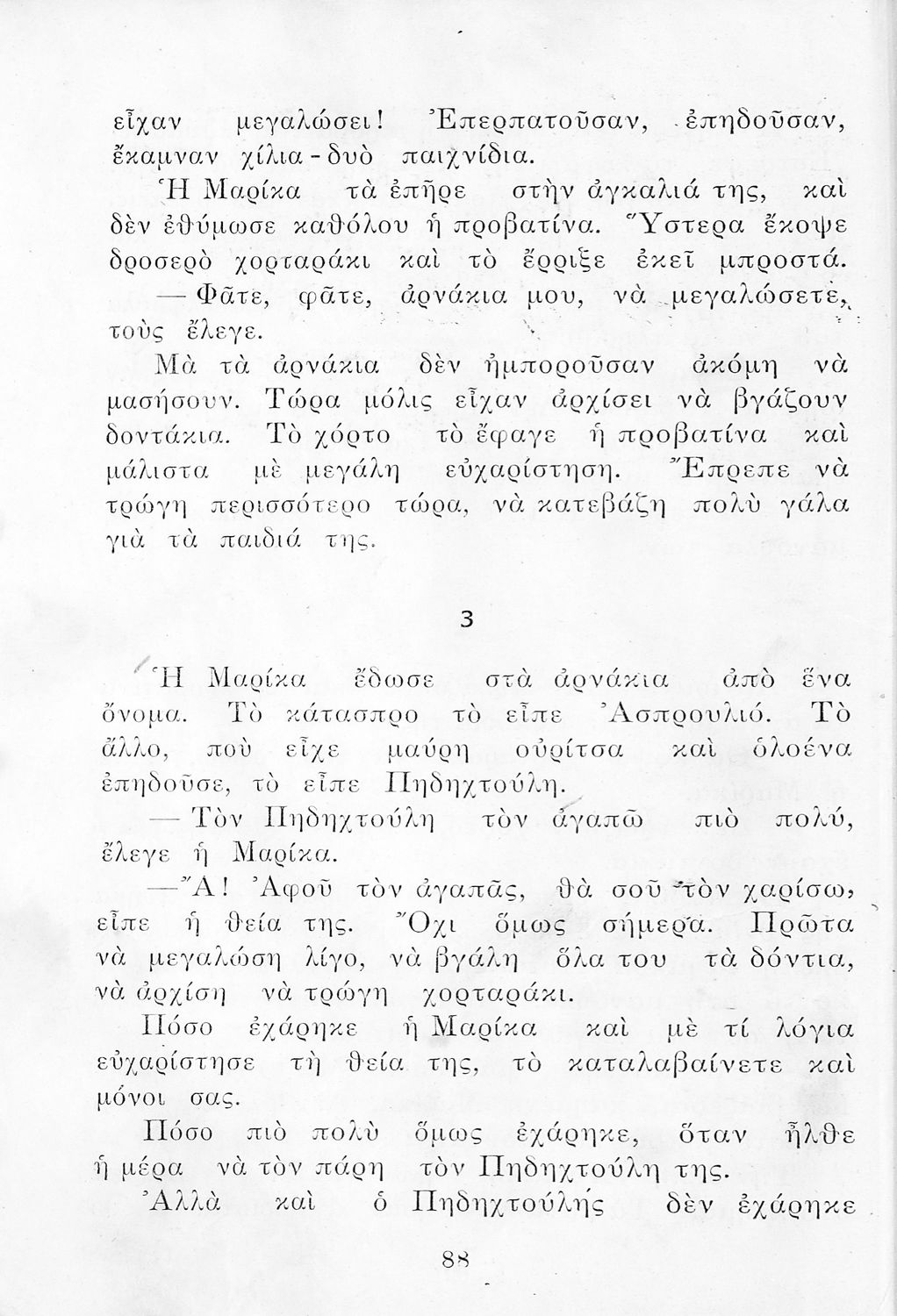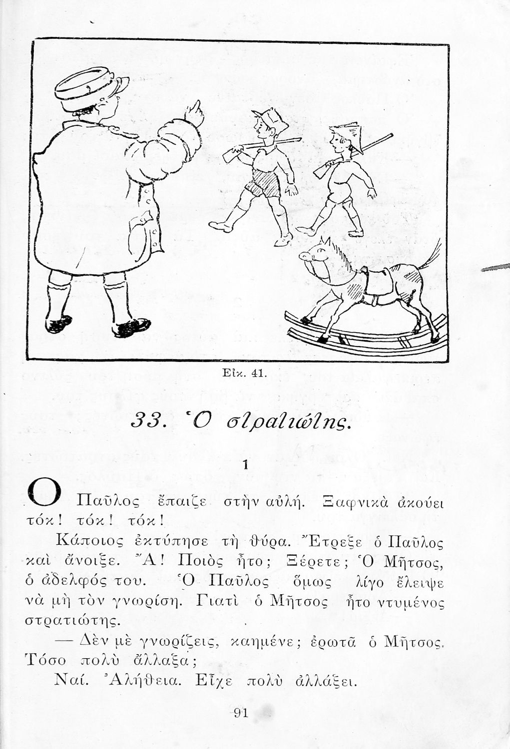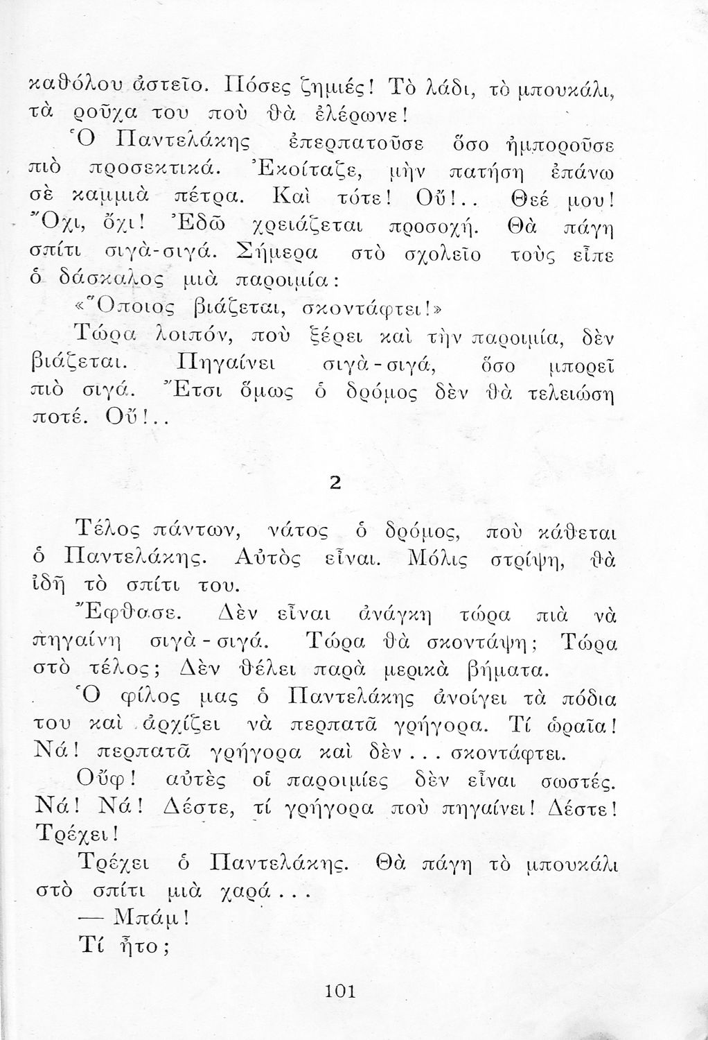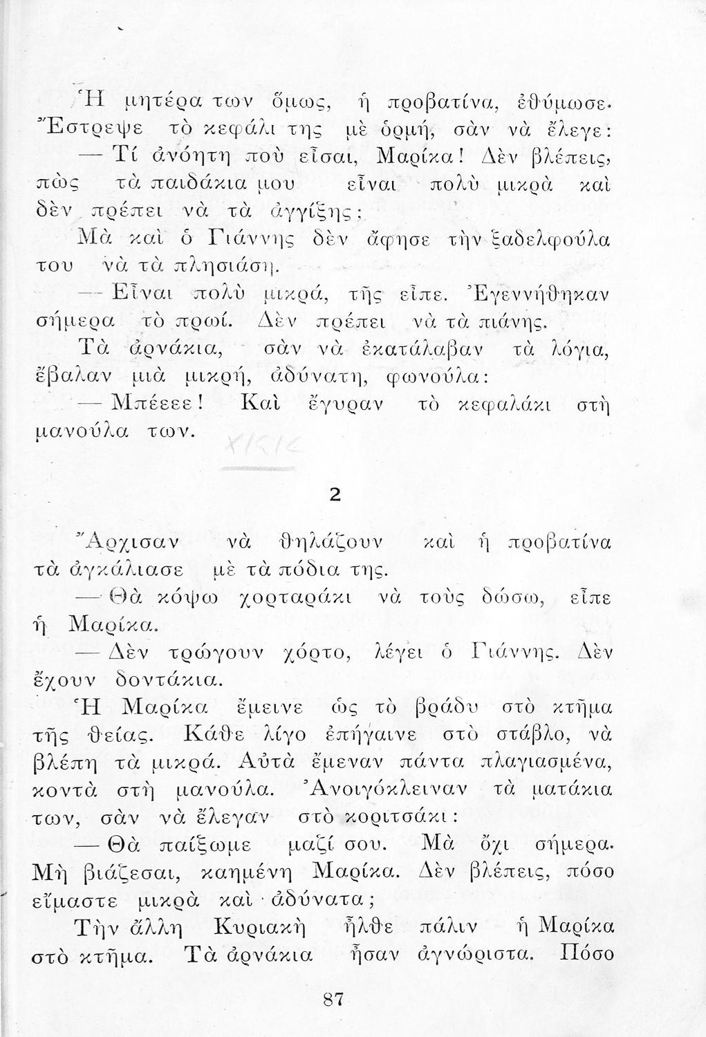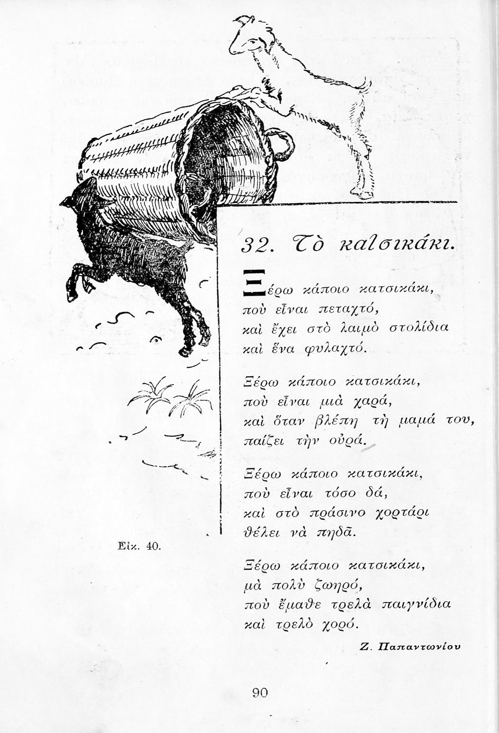 Αναγνωστικό Β΄ Δημοτικού που αποτελείται από πεζά γραμμένα σε καθαρεύουσα και ποιήματα σε δημοτική εμπνευσμένα από την οικογένεια, τη θρησκεία, την πατρίδα, την ελληνική φύση και ύπαιθρο, την αγάπη για τα ζώα, τις καθημερινές ασχολίες και επαγγέλματα και τις ηθικές αρετές.