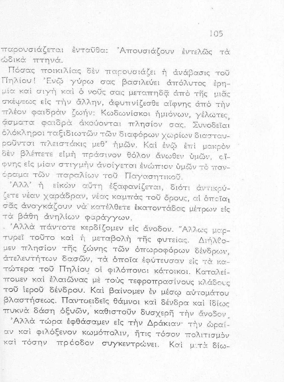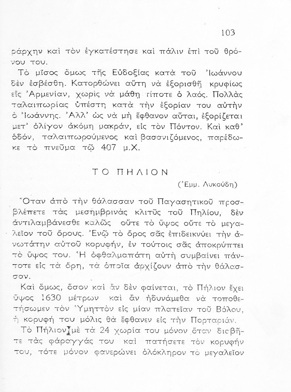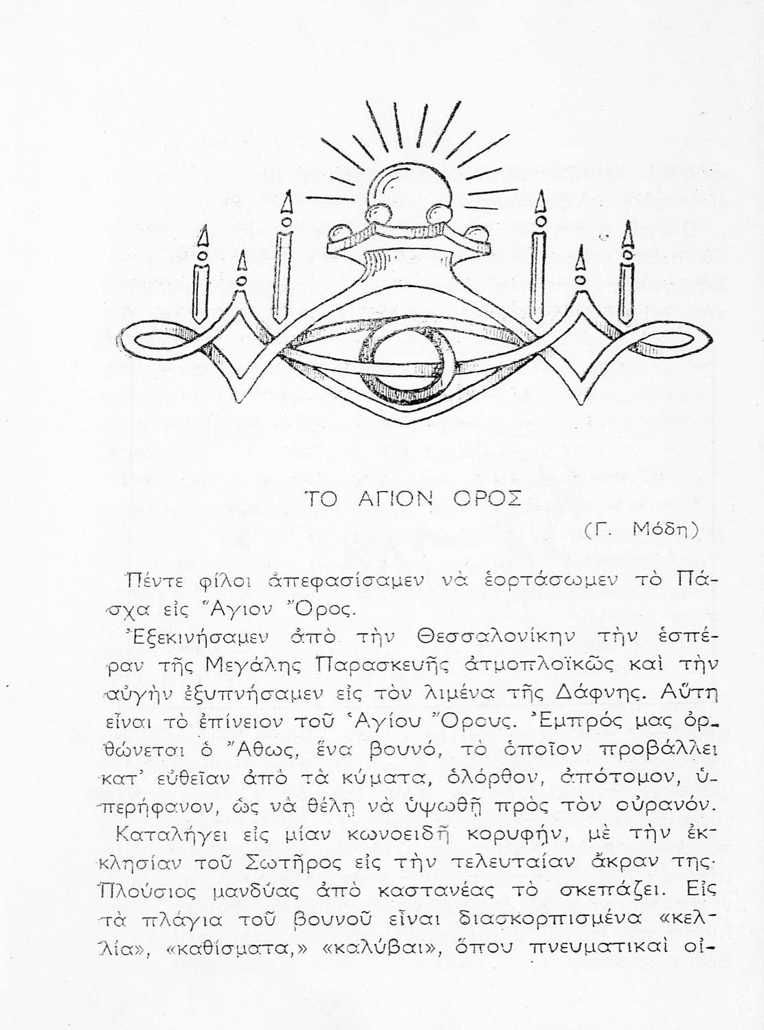 Αναγνωστικό ΣΤ΄ Δημοτικού που αποτελείται από πεζά γραμμένα σε καθαρεύουσα και ποιήματα σε δημοτική εμπνευσμένα από την οικογένεια, τη θρησκεία, την μυθολογία και ιστορία, την υγιεινή, την πατρίδα, την ελληνική φύση, την αγάπη για τα ζώα, τις καθημερινές ασχολίες και επαγγέλματα και τις ηθικές αρετές.